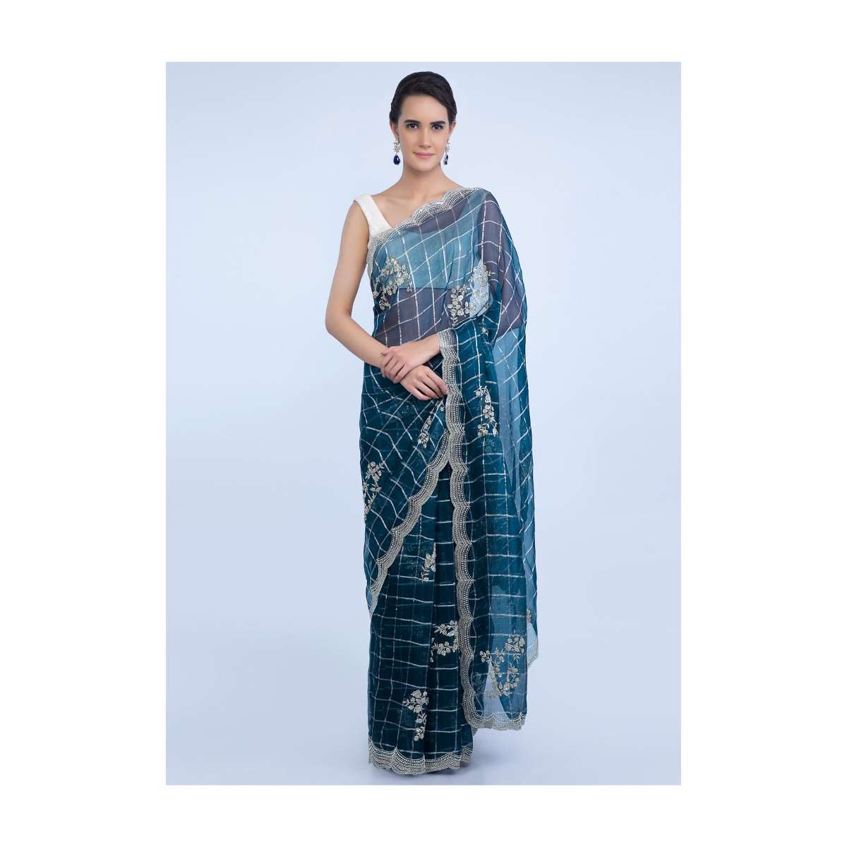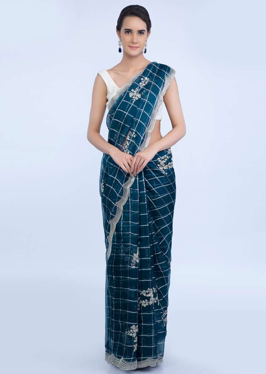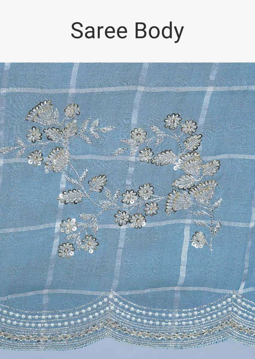 Aegean blue checks organza saree with embroidered butti only on Kalki