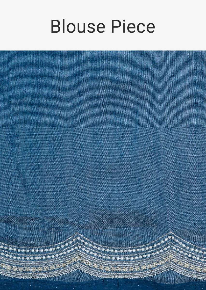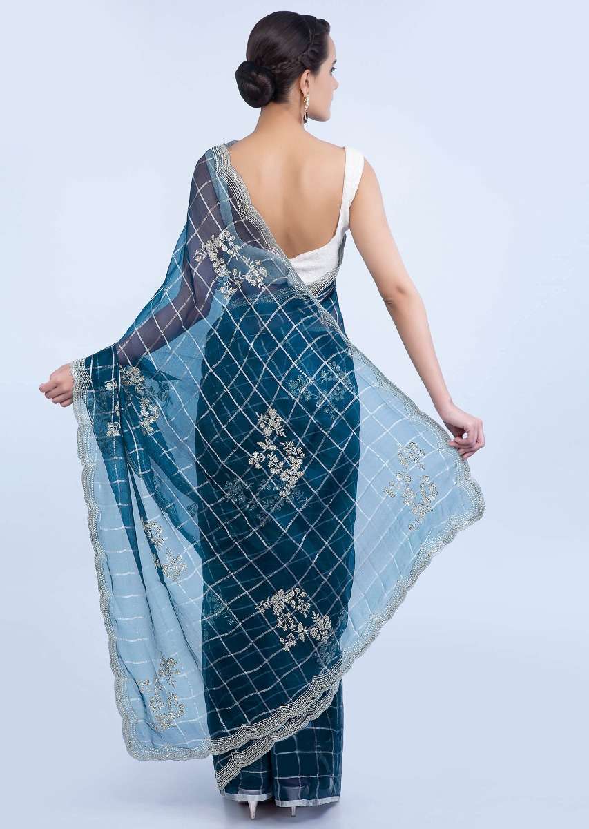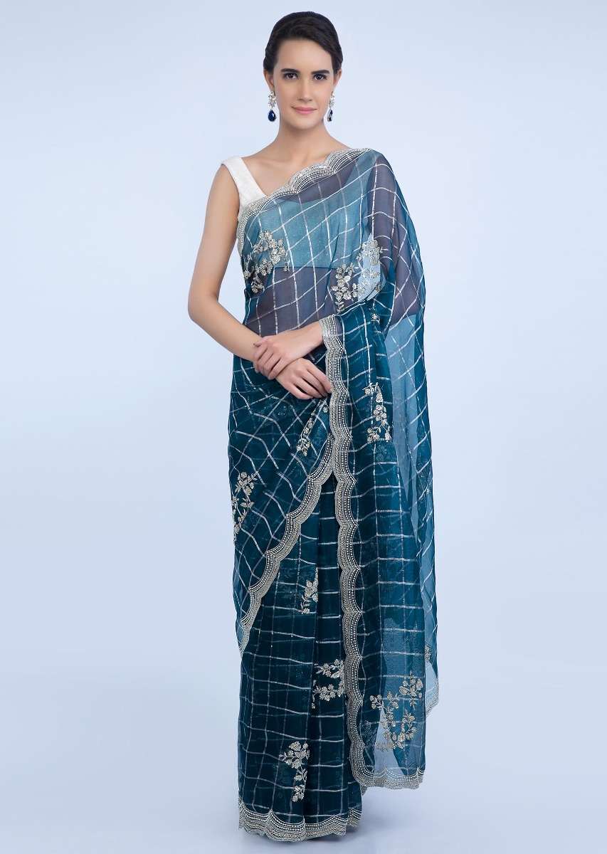 Aegean blue checks organza saree with embroidered butti only on Kalki