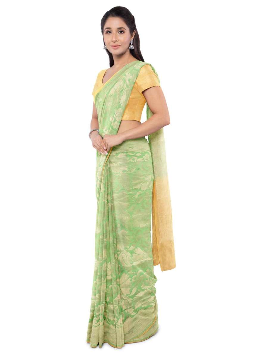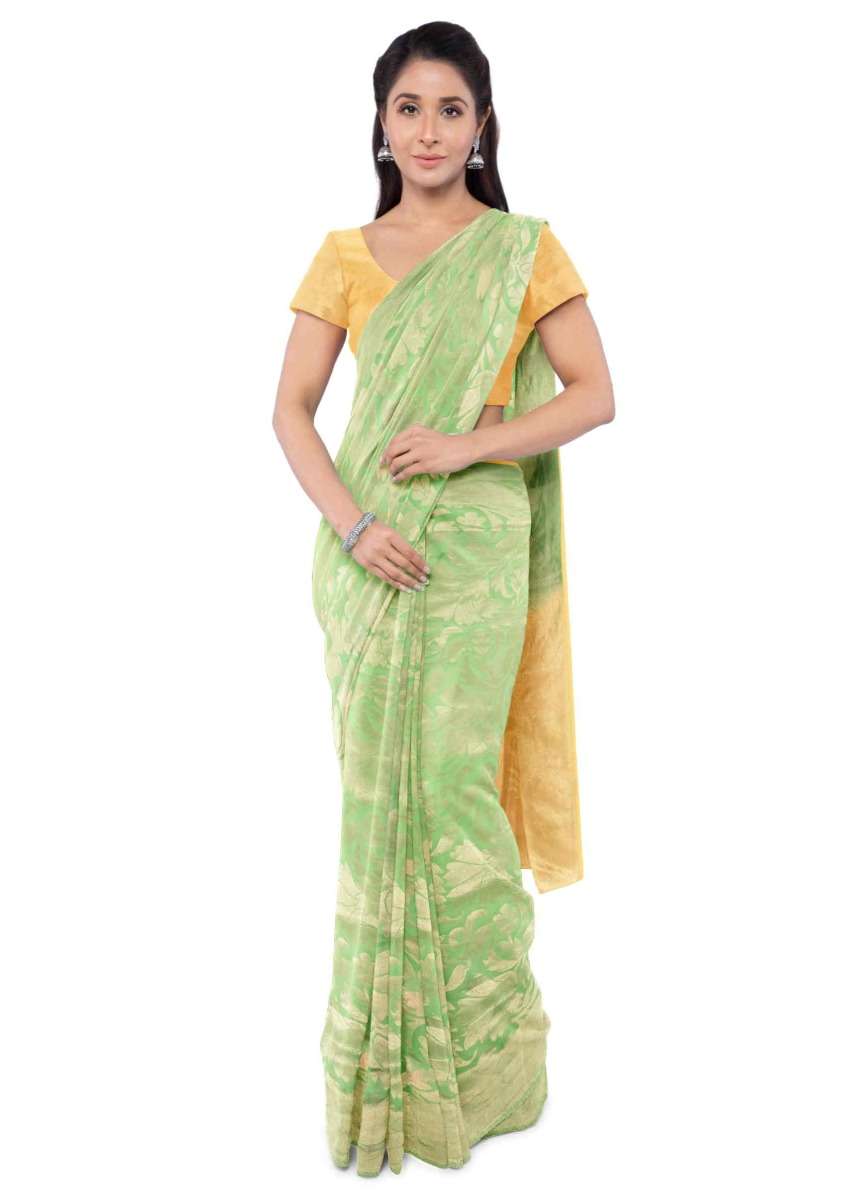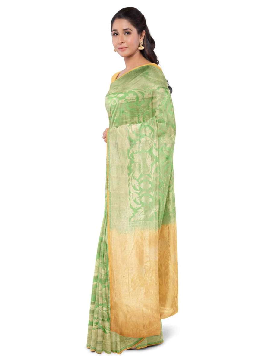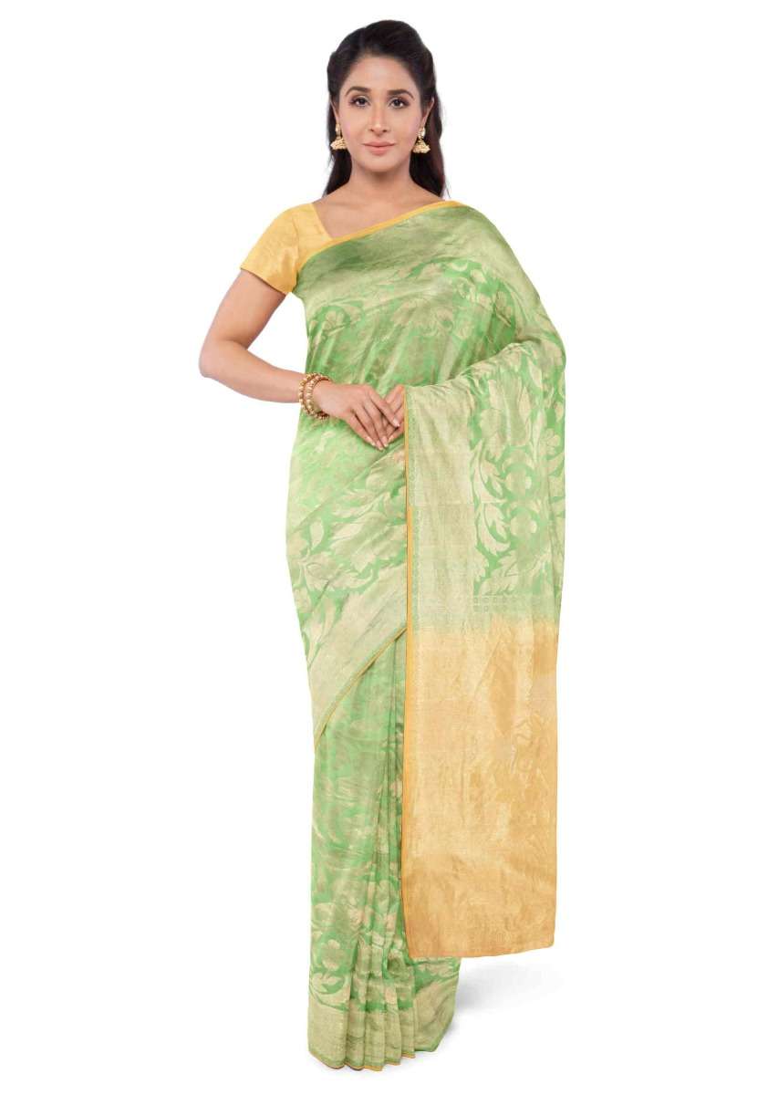 Apple Green Saree In Banarasi Silk With Yellow Silk Blouse Online - Kalki Fashion