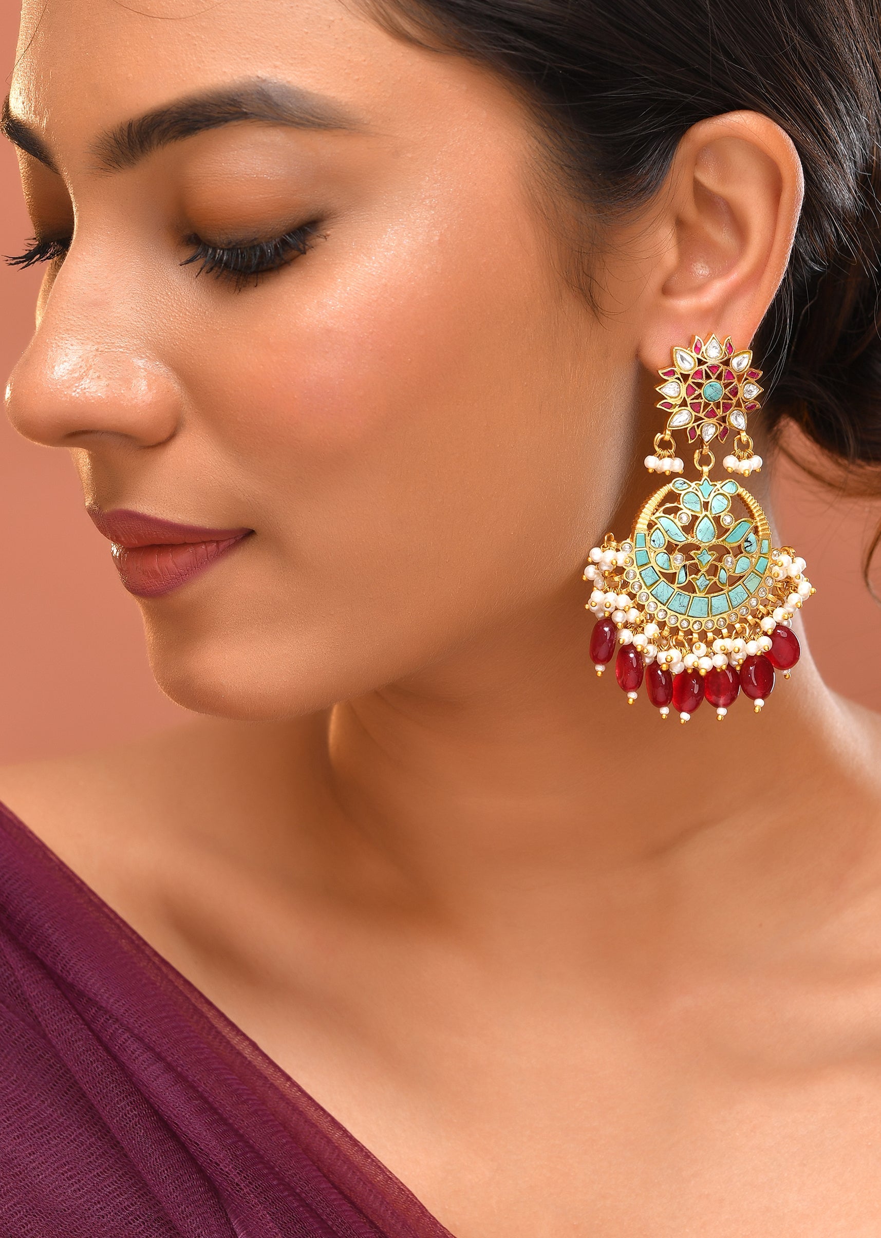 These aqua blue multi colored earrings feature intricate pachi kundan work for a vibrant and festive look. Perfect for weddings, mehendi, or festive celebrations, they add a playful yet elegant... More Product Details