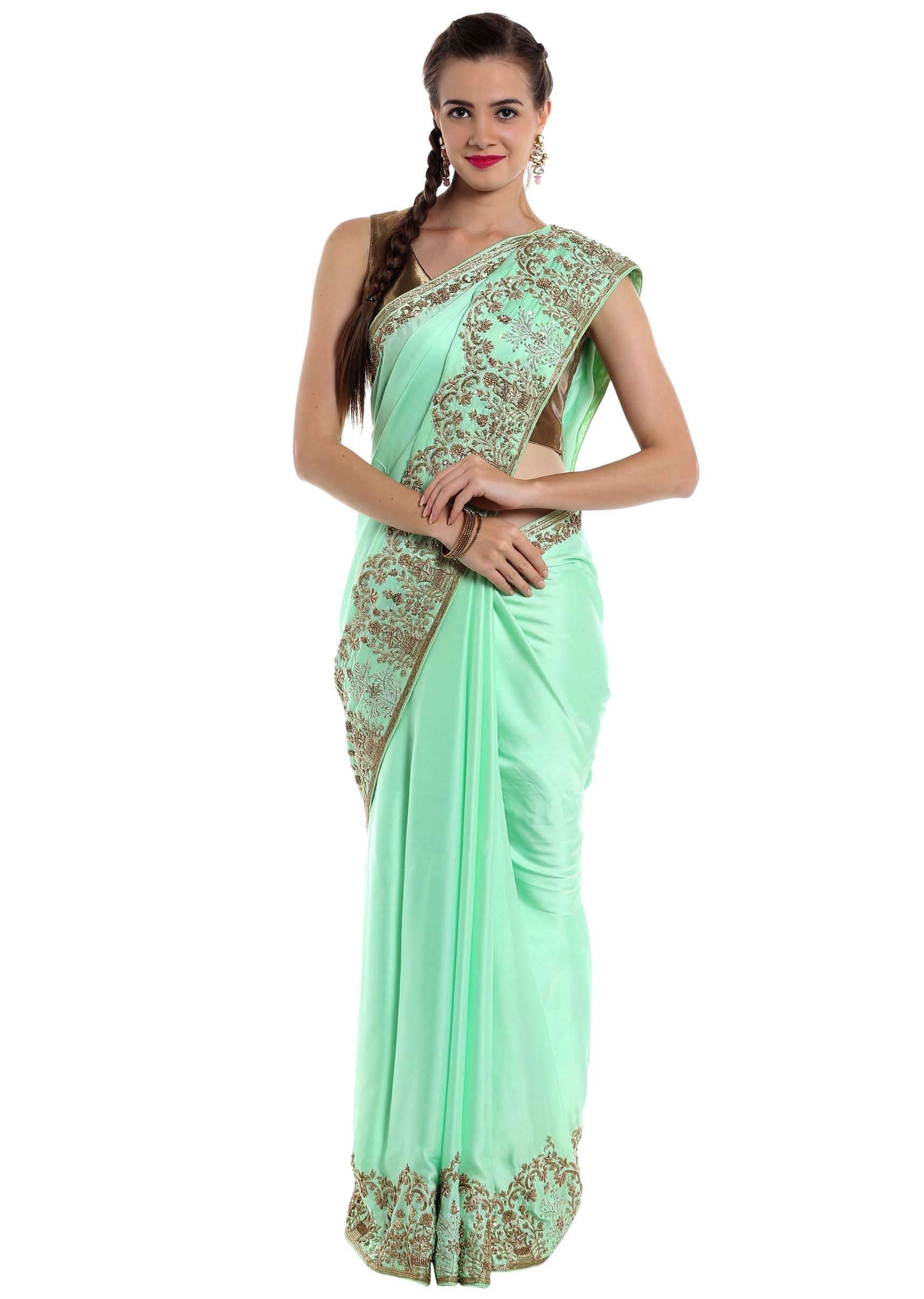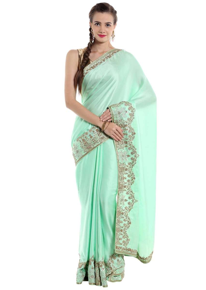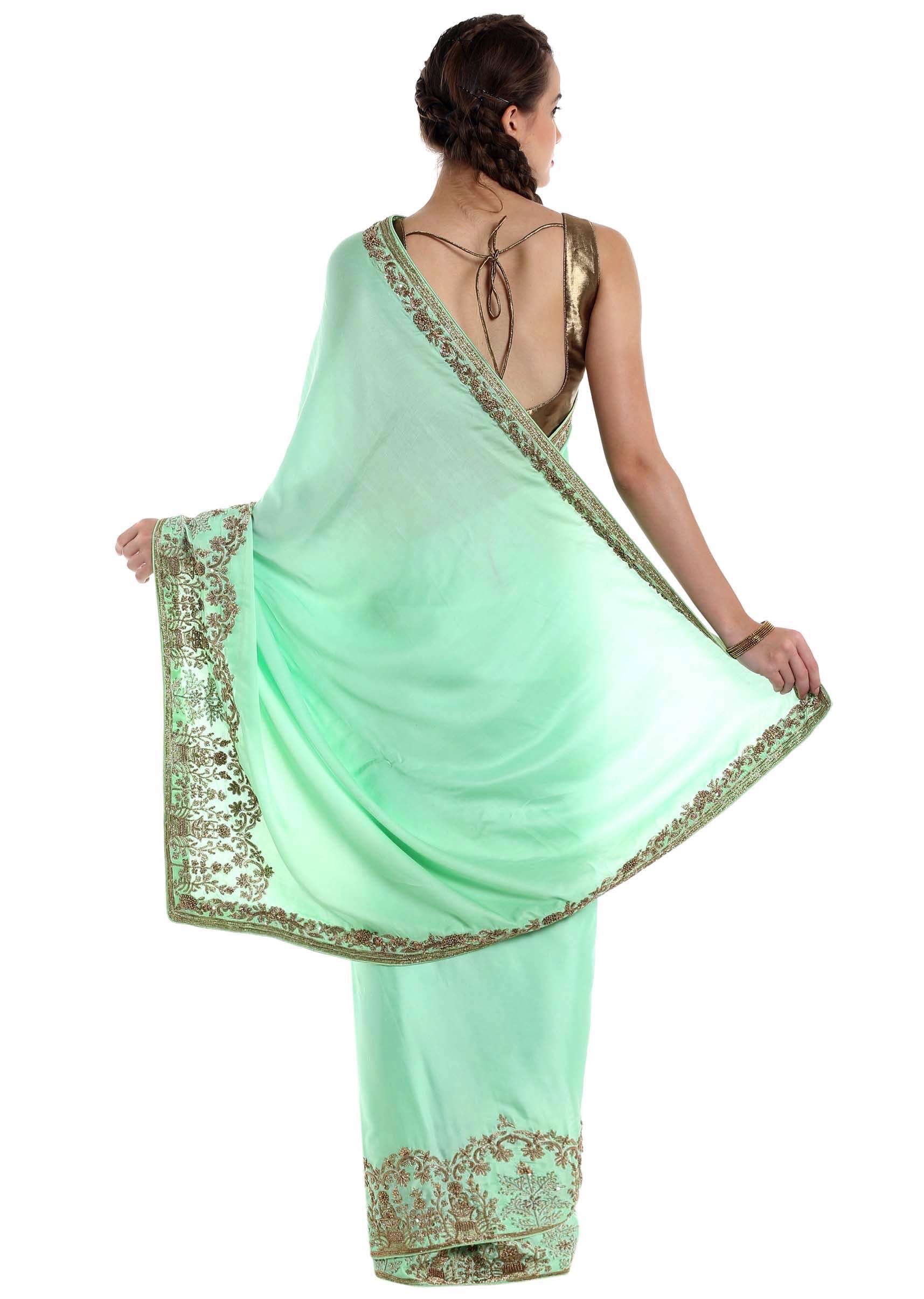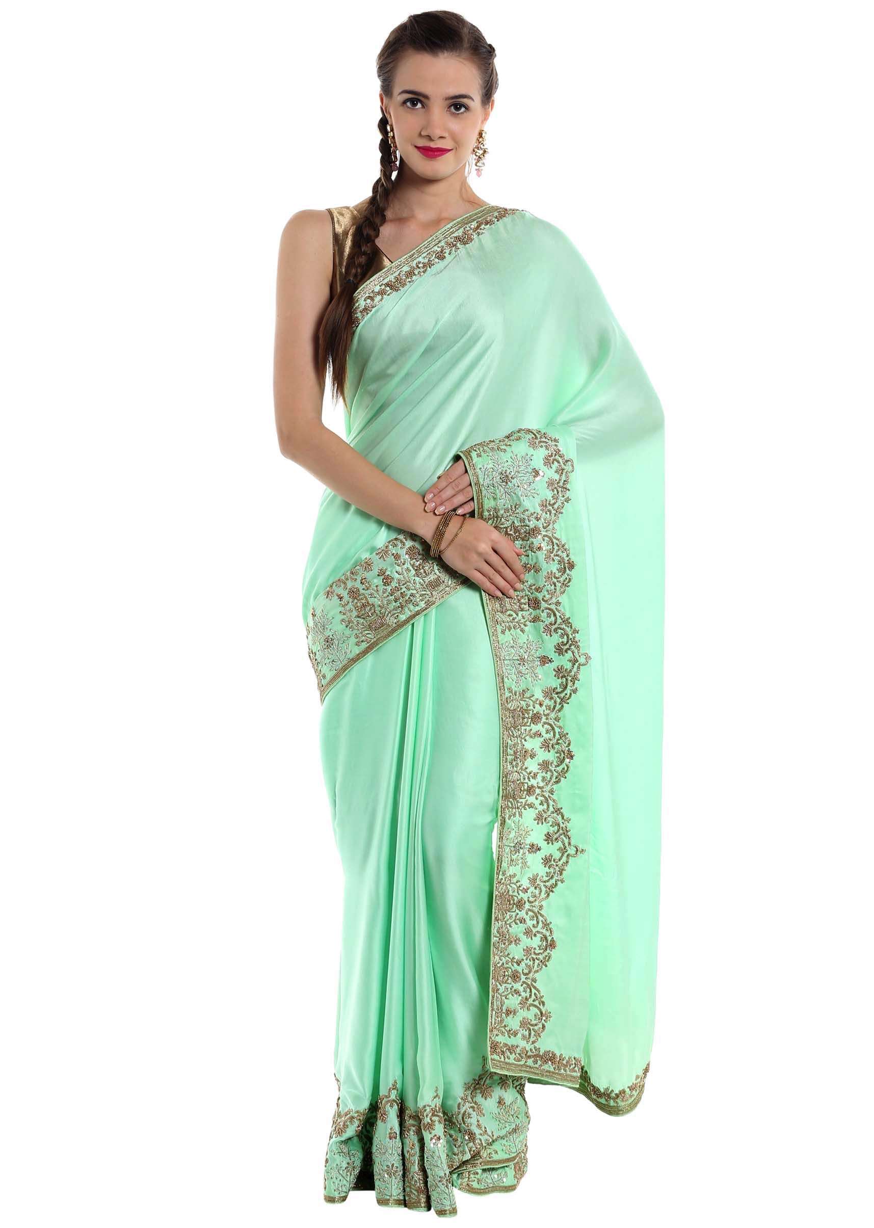 Aqua Blue Saree In Satin Decorated With Ornate Zardosi Work Online - Kalki Fashion