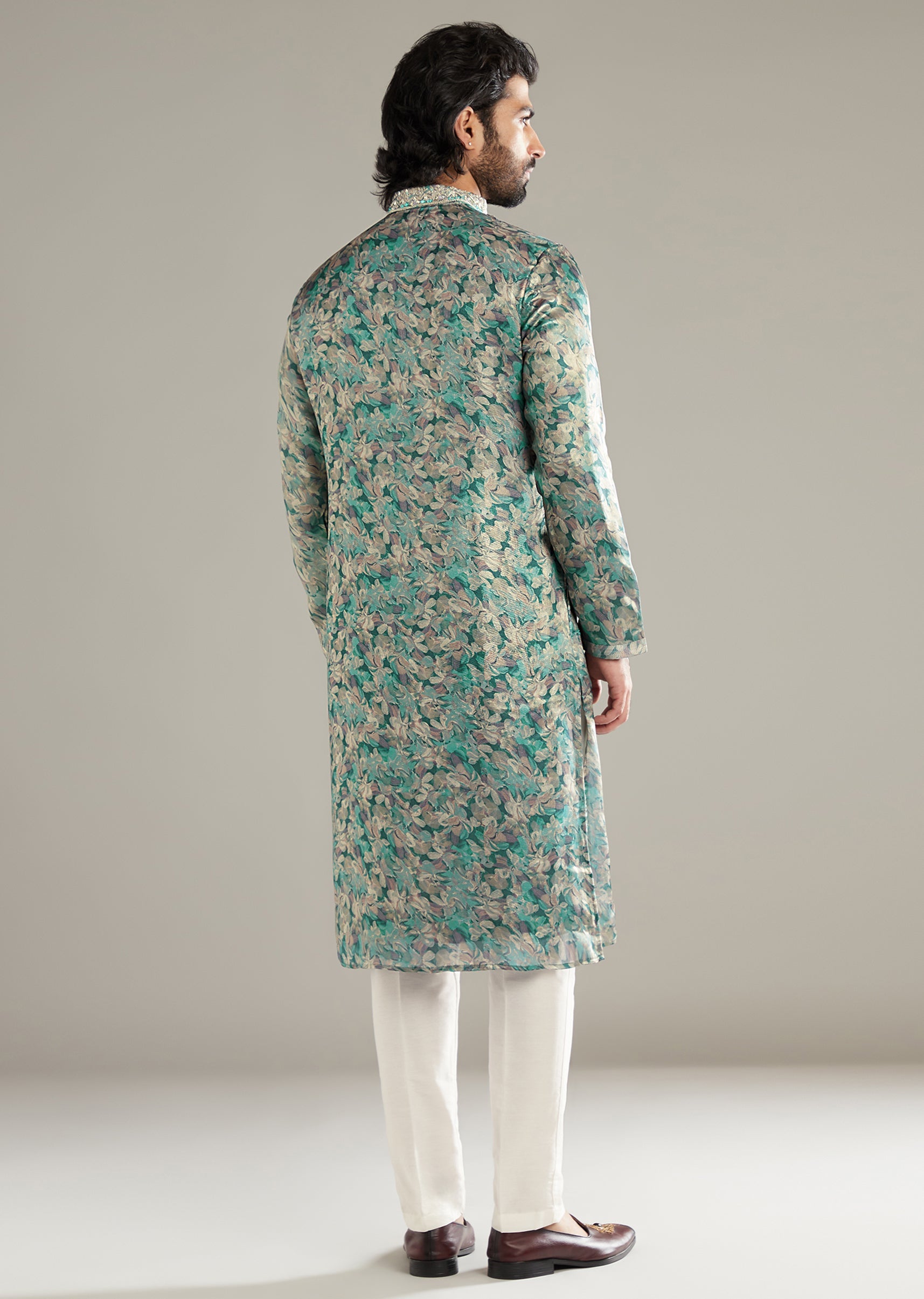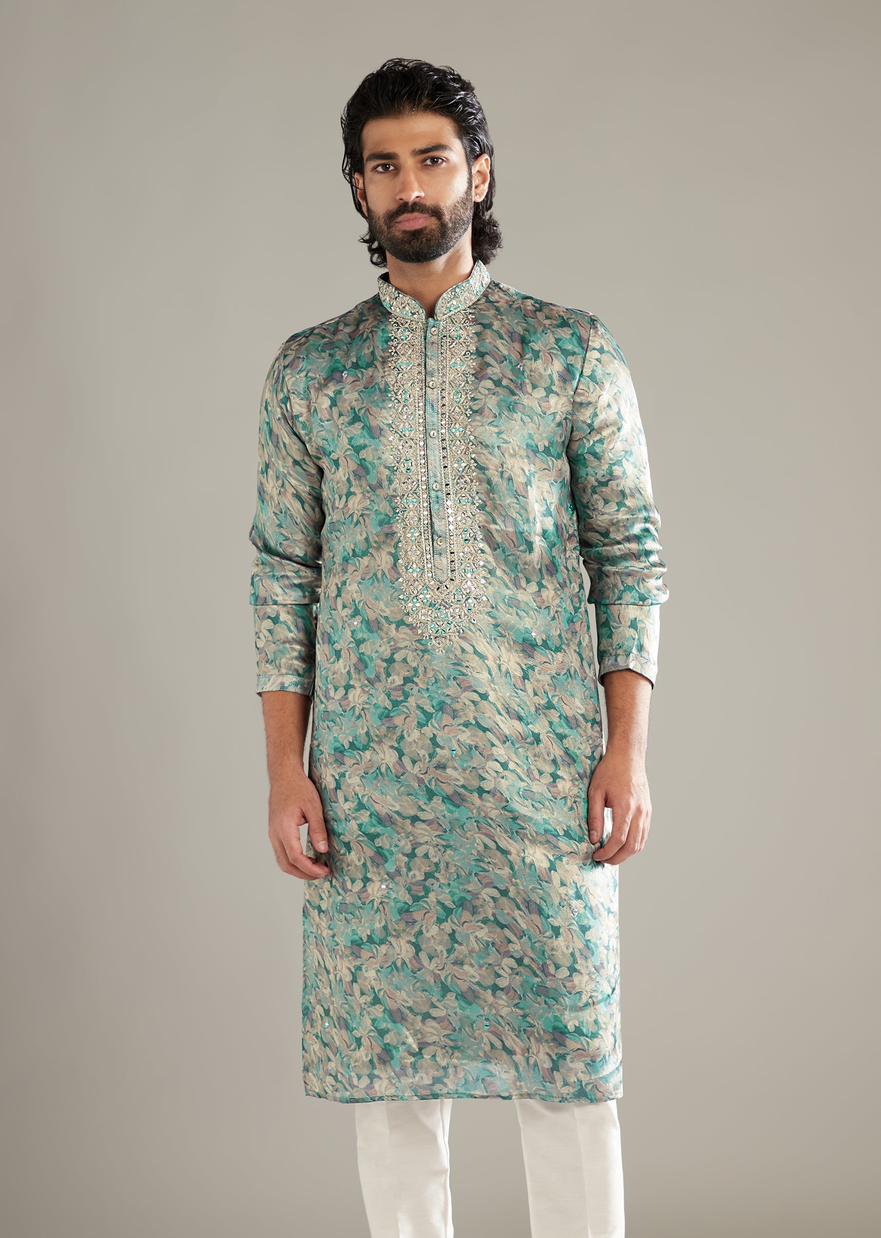 Colour lifts the mood as this aqua blue art silk men’s kurta set sets a floral print under fine mirror and resham work for measured sparkle. The tone photographs fresh... More Product Details
