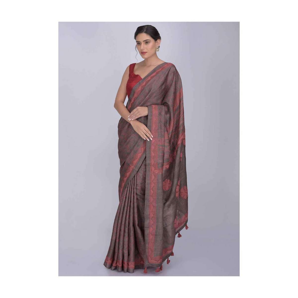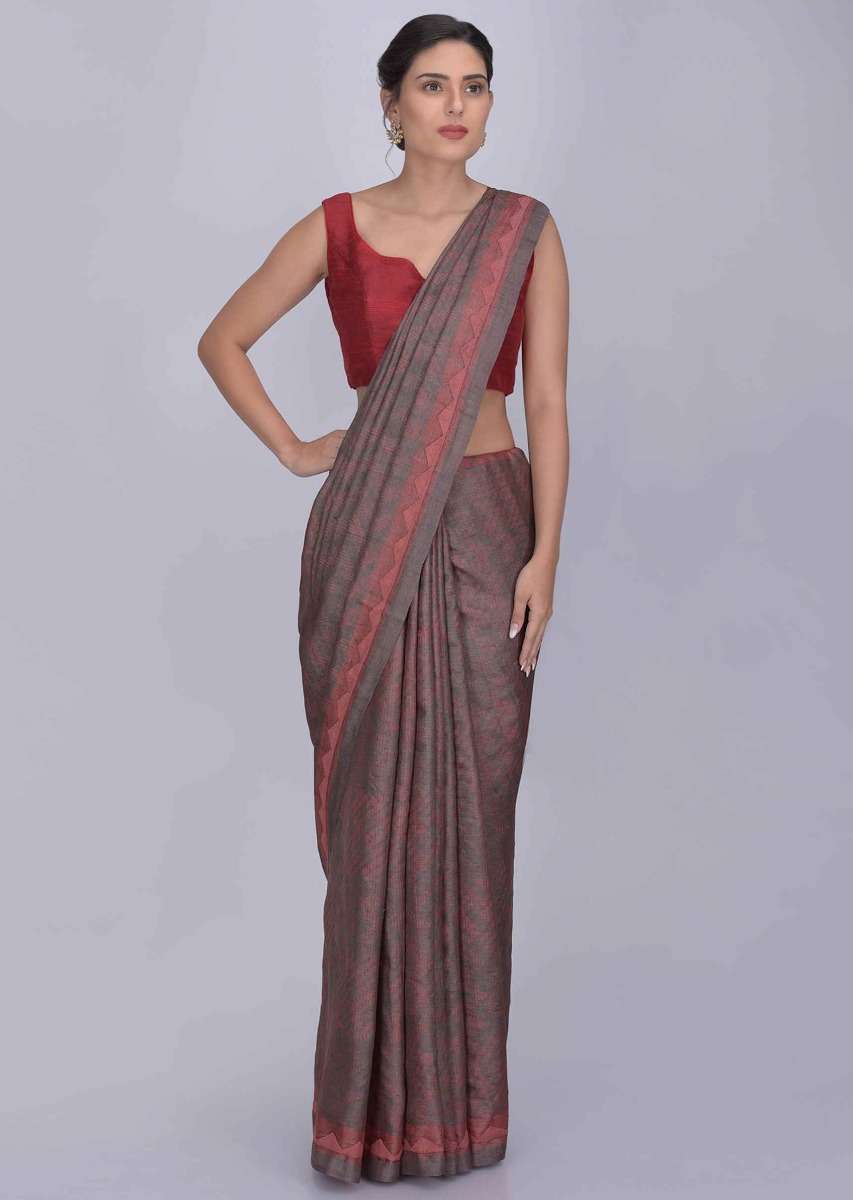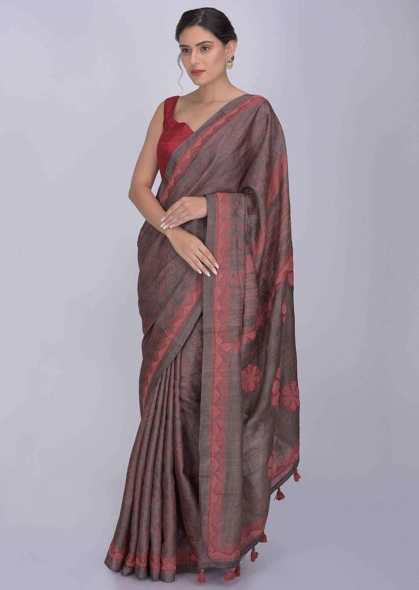 Ash Grey And Red Saree In Tussar Silk With Batik Print Online - Kalki Fashion