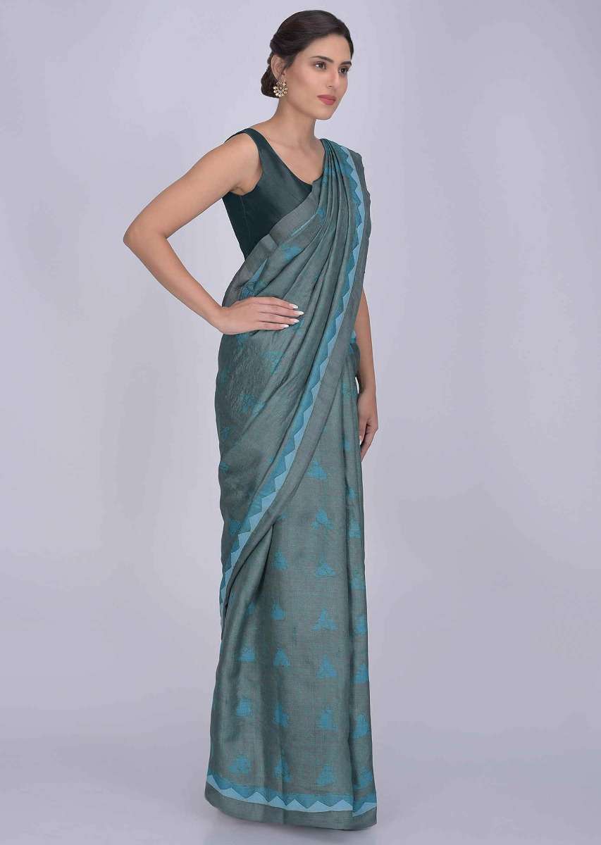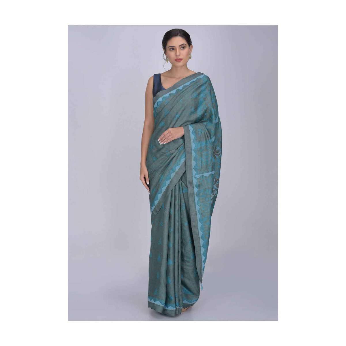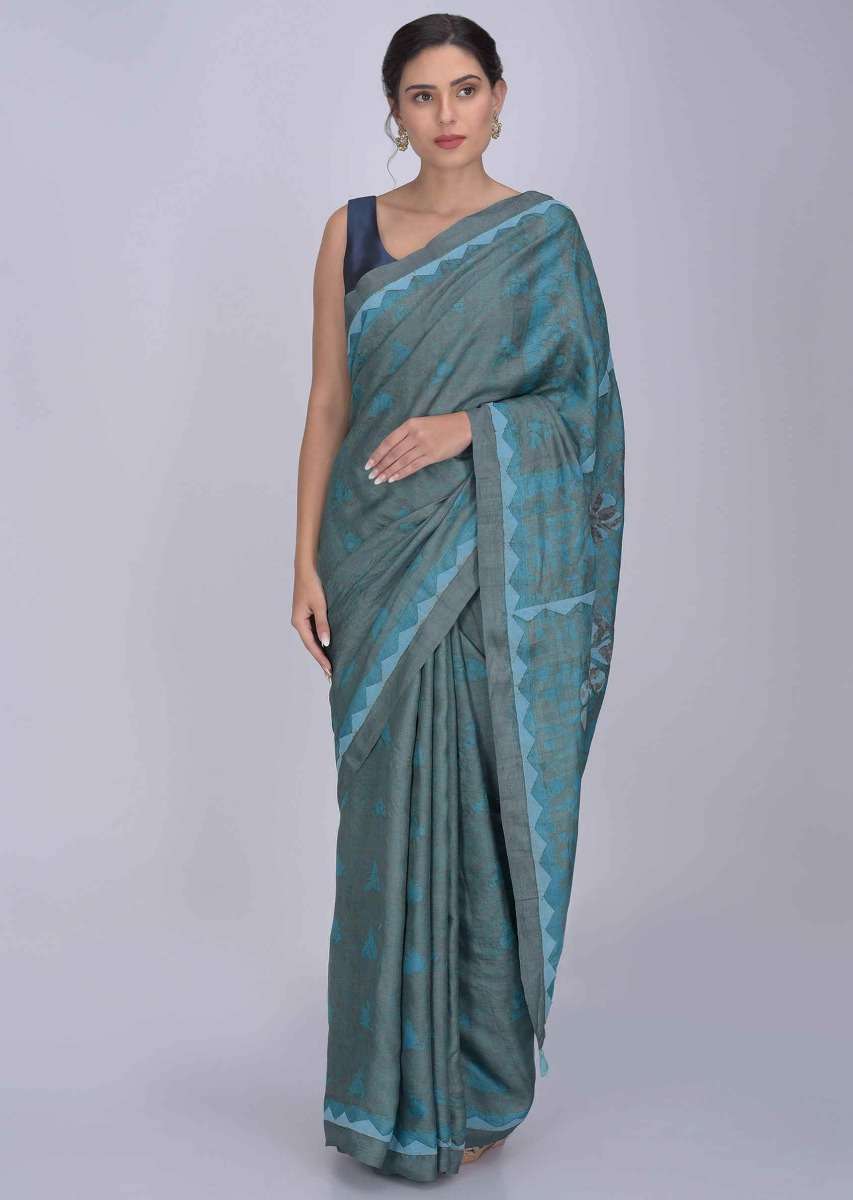 Ashwood Moss Grey And Blue Saree In Tussar Silk With Batik Print Online - Kalki Fashion
