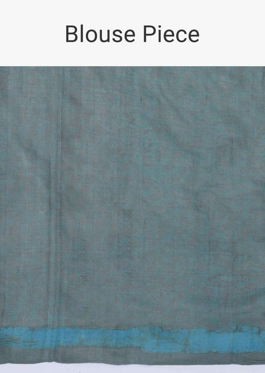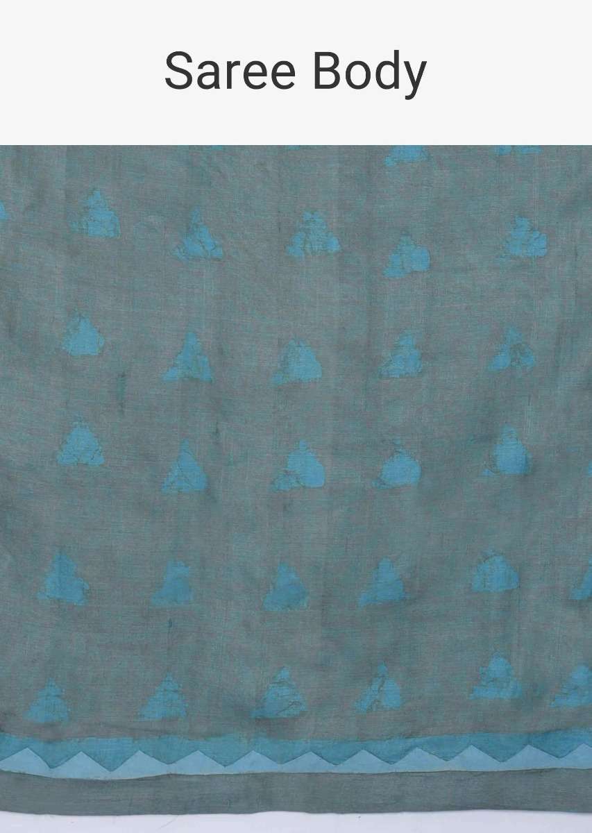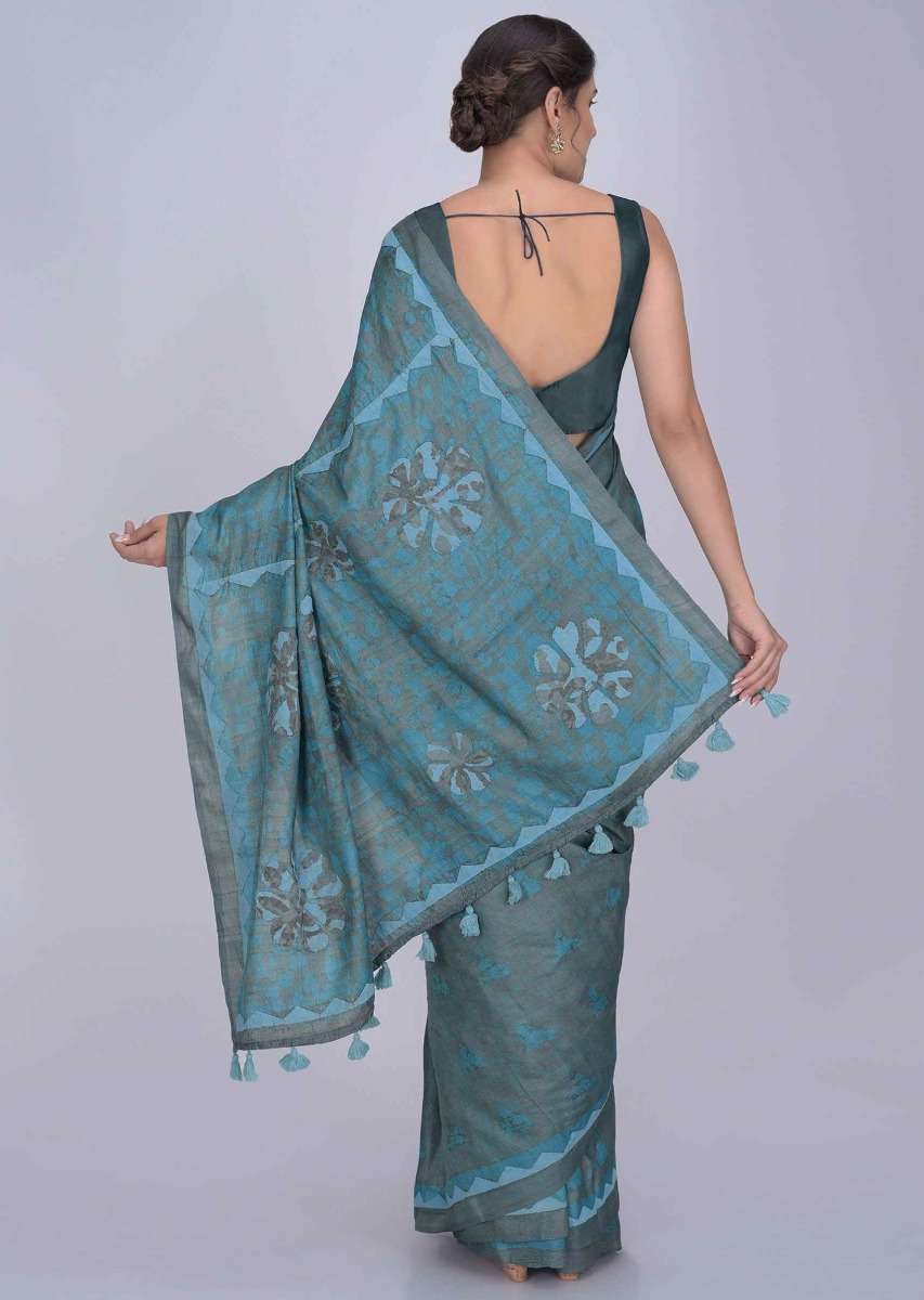 Ashwood Moss Grey And Blue Saree In Tussar Silk With Batik Print Online - Kalki Fashion
