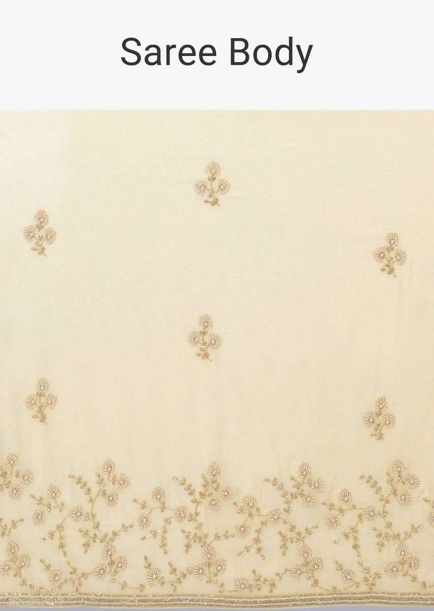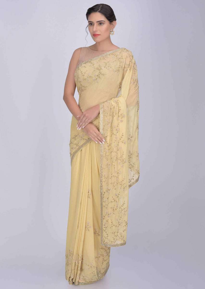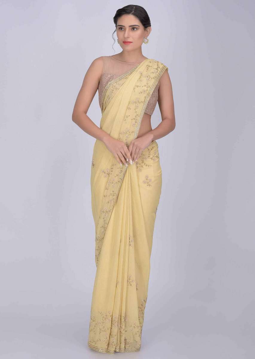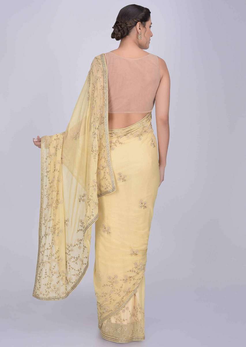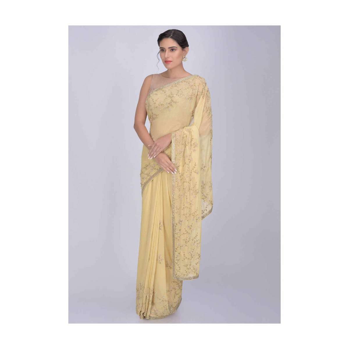 Banana Yellow Saree In Shimmer Georgette Fabric With Matching Blouse Piece Online - Kalki Fashion