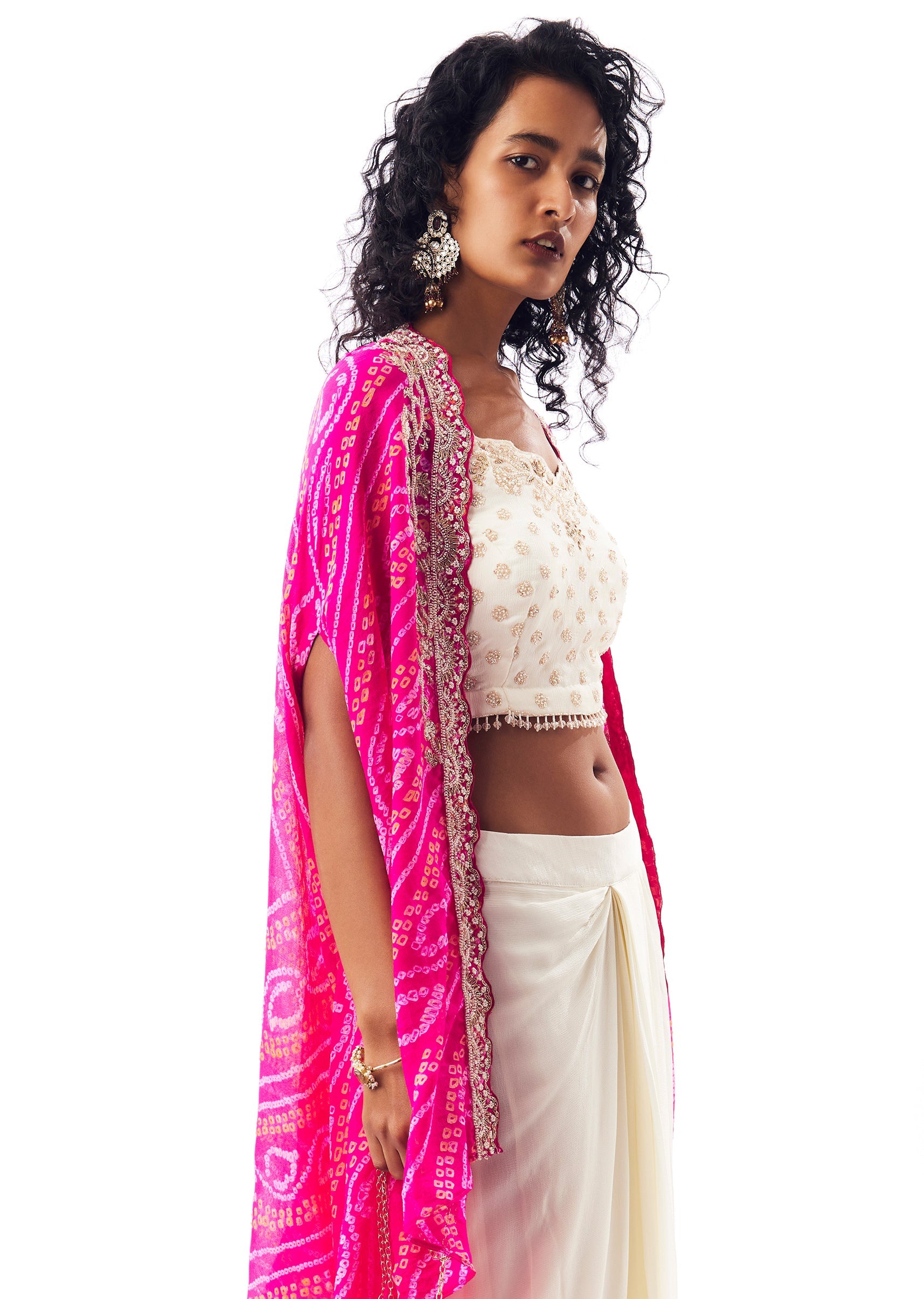 Bandhani Cape Set With Embellished Crop Top And Flared Skirt