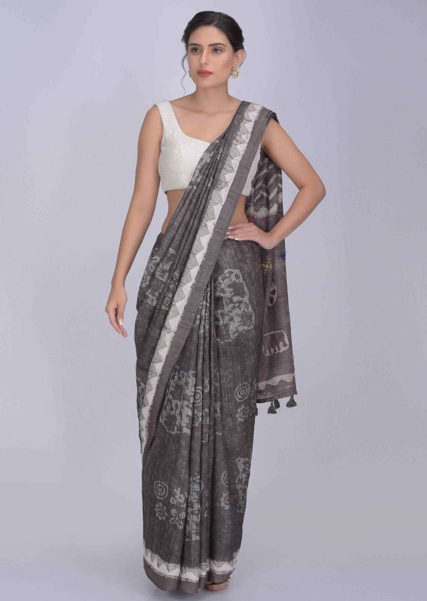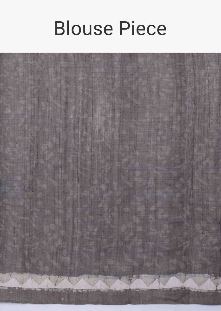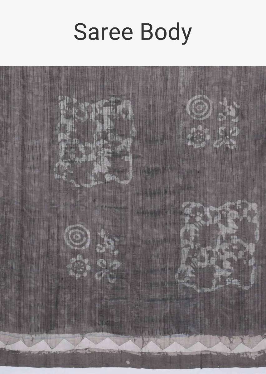 Bear Creek Grey Saree In Tussar Silk With Batik Print All Over Online - Kalki Fashion
