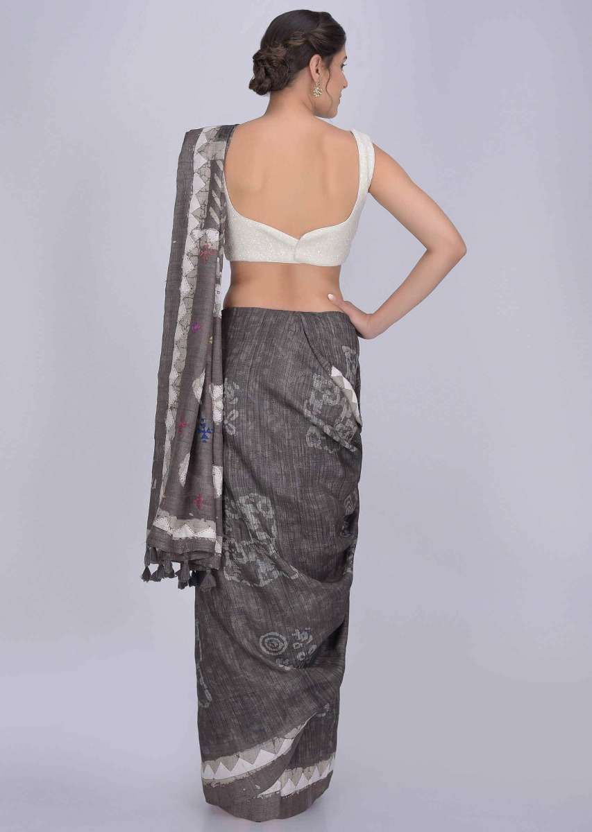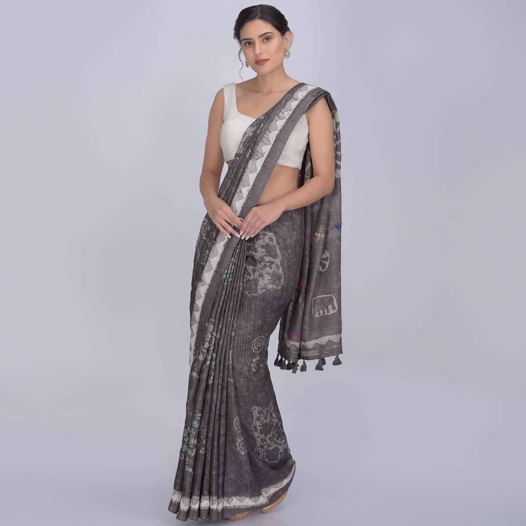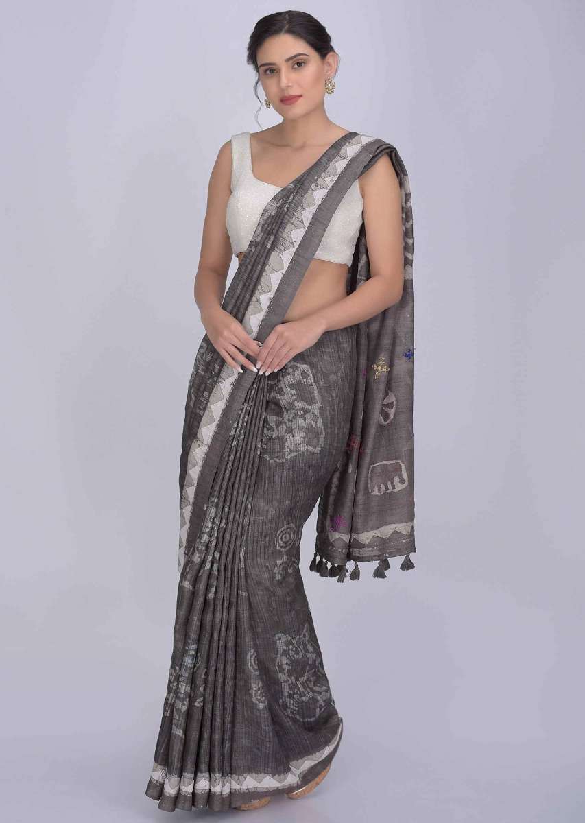 Bear Creek Grey Saree In Tussar Silk With Batik Print All Over Online - Kalki Fashion
