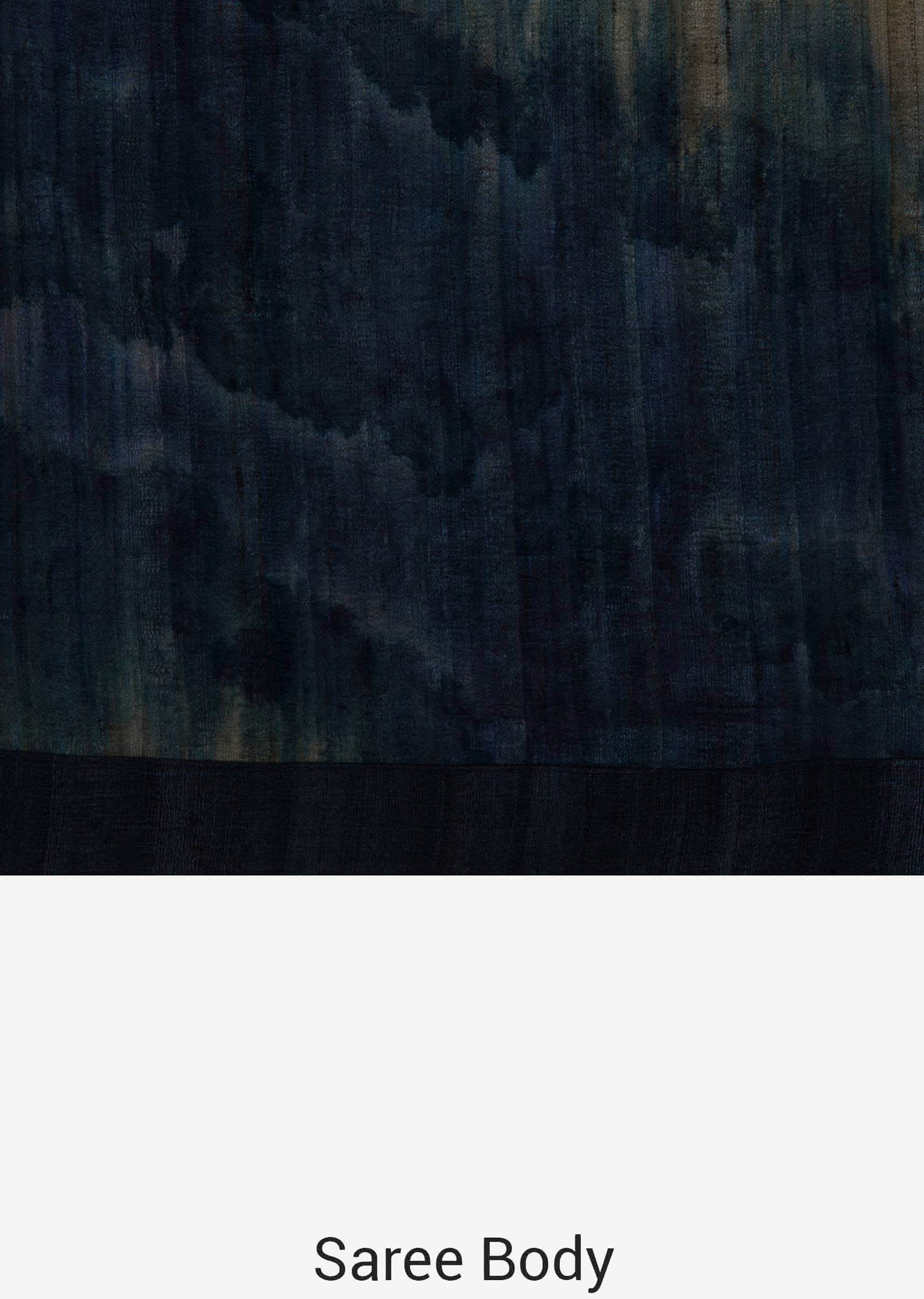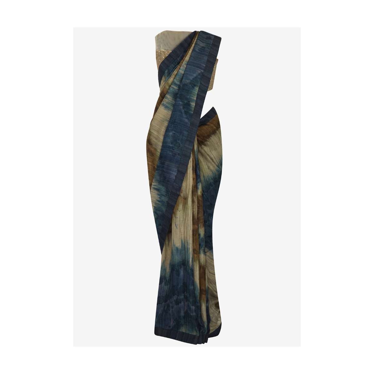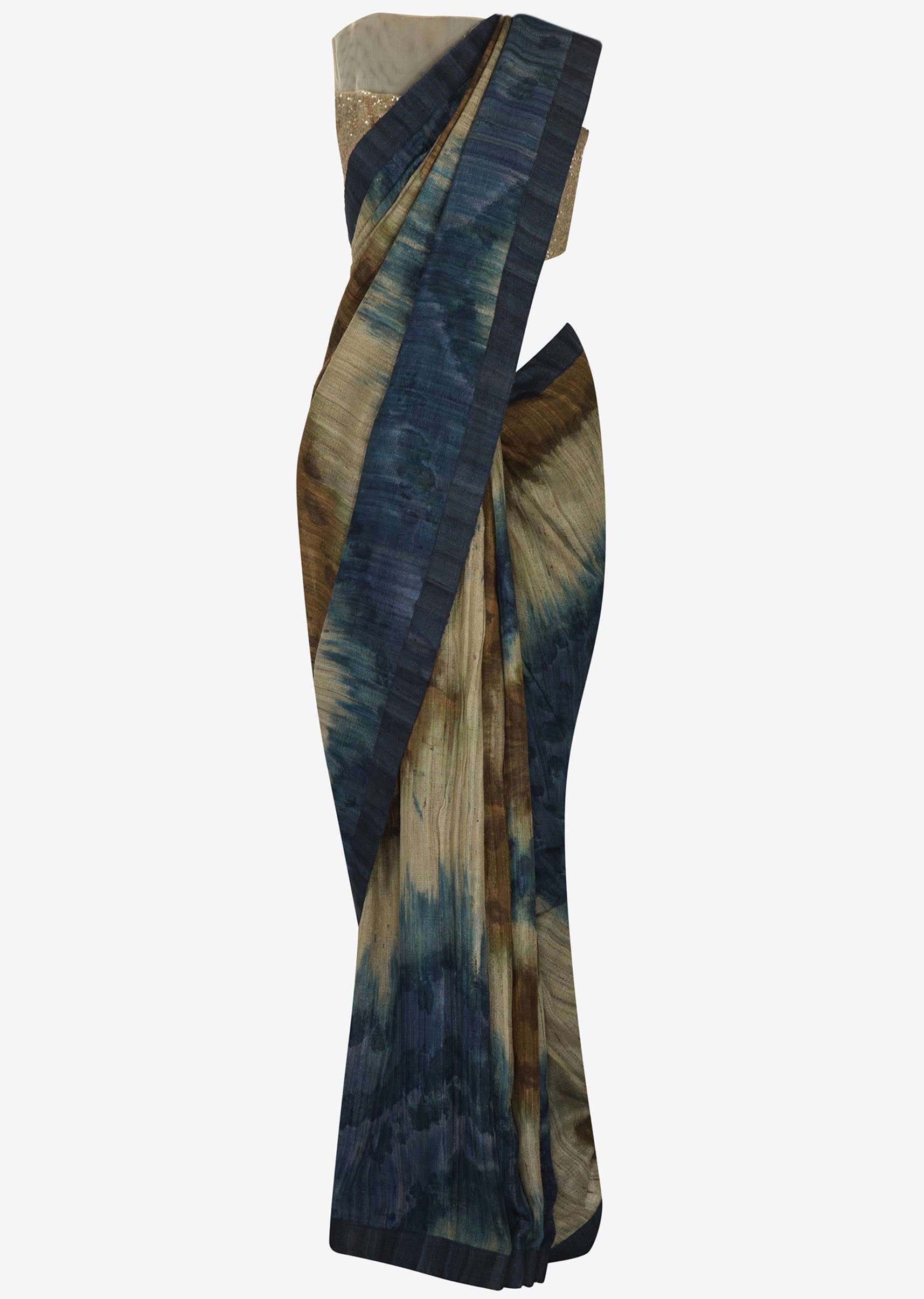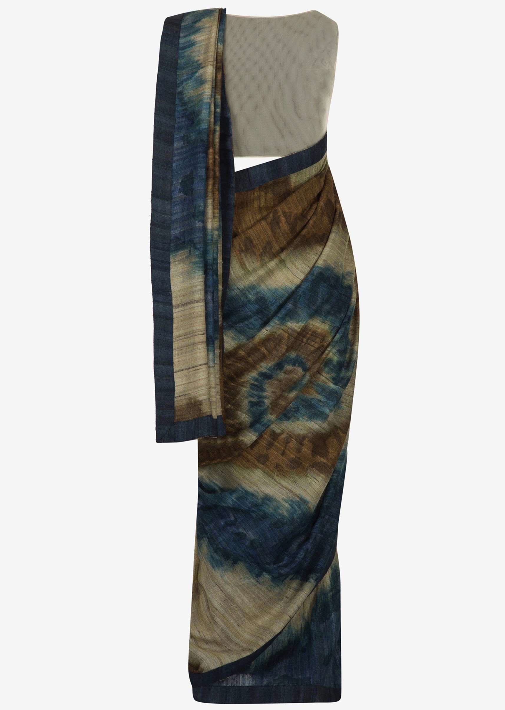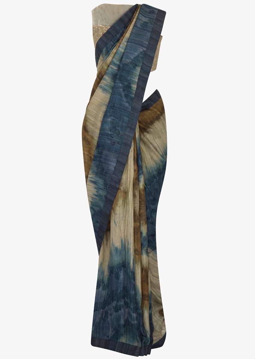 Beige and navy blue printed saree in tussar silk only on Kalki