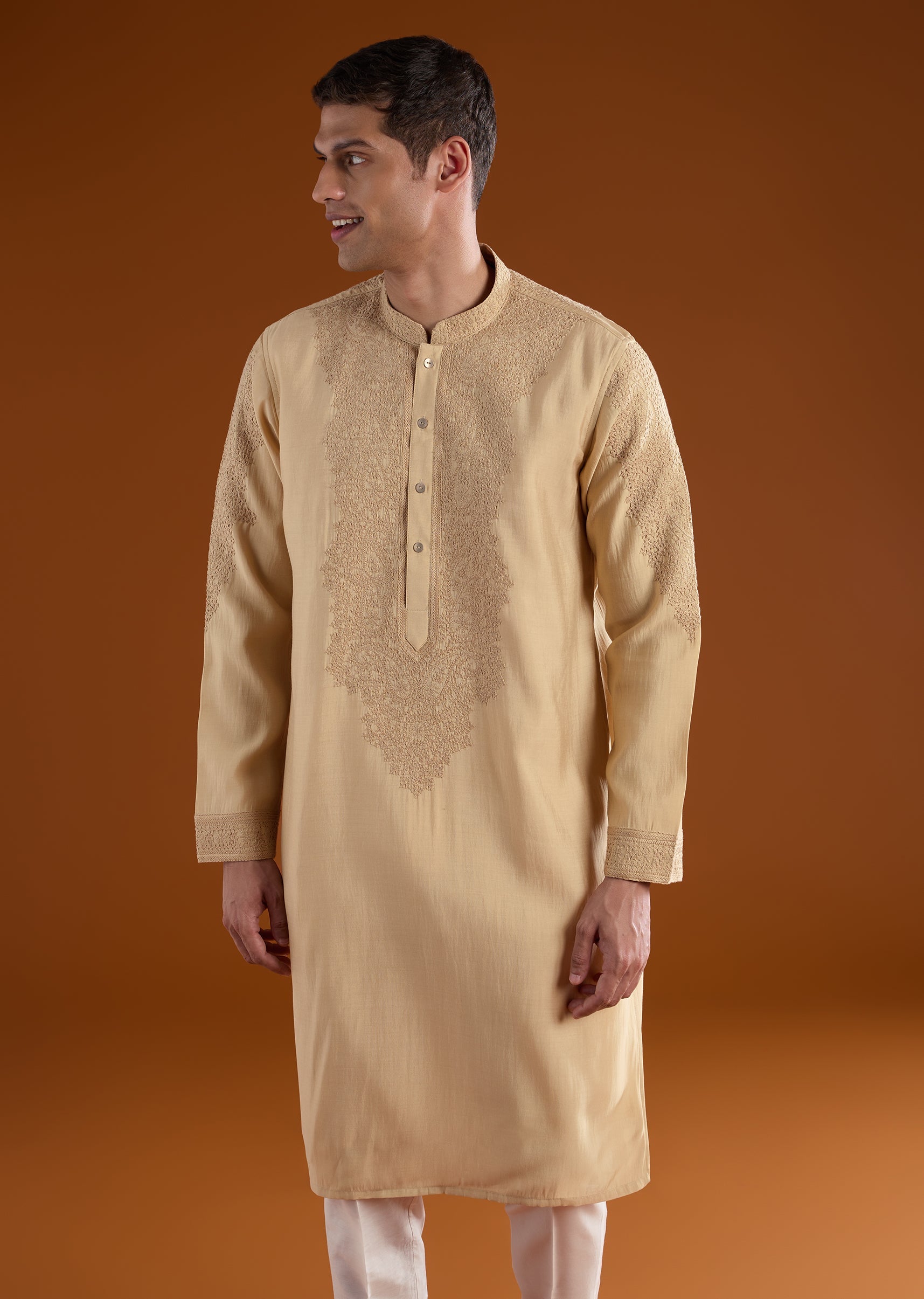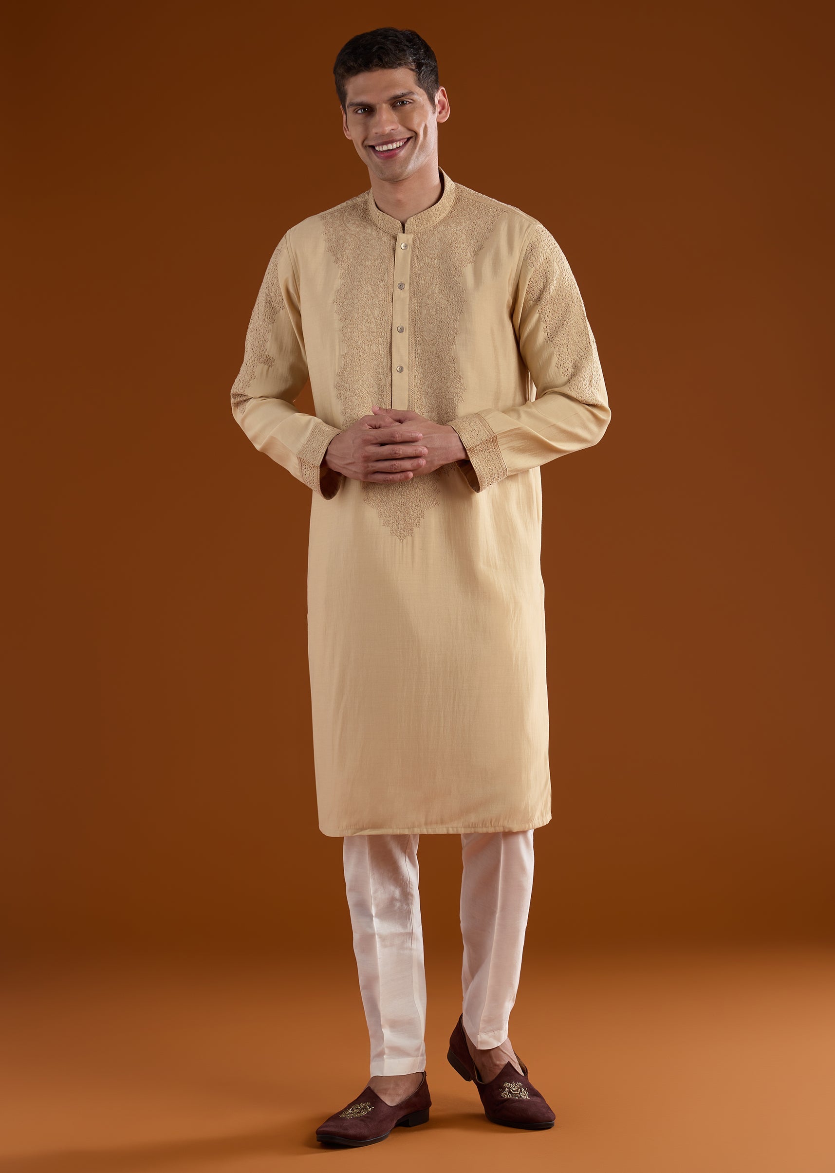 Elegant and artisanal in appeal, this beige kurta set is crafted in airy Chanderi silk for a sophisticated festive look. The kurta features a mandarin collar, full sleeves, and side... More Product Details