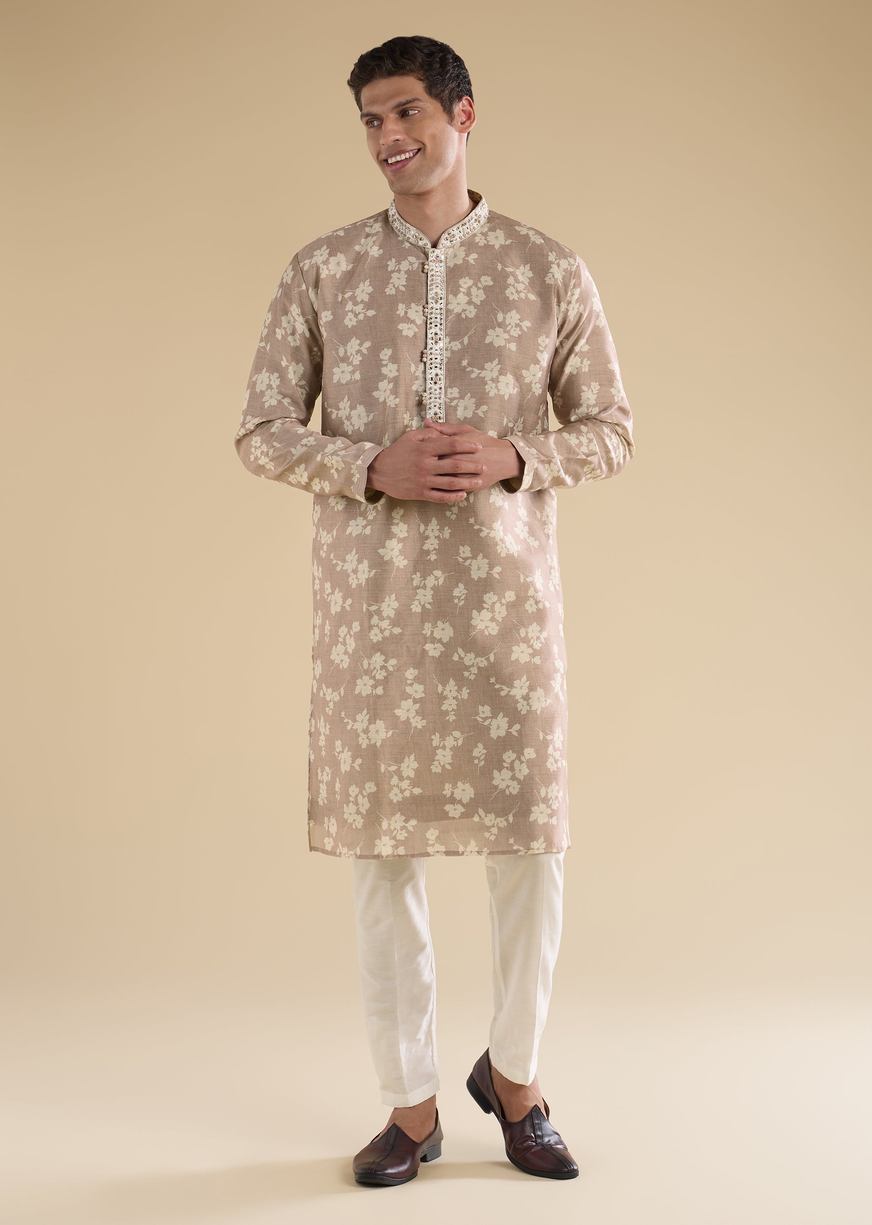 The beige embroidered kurta set balances simplicity with festive detailing.