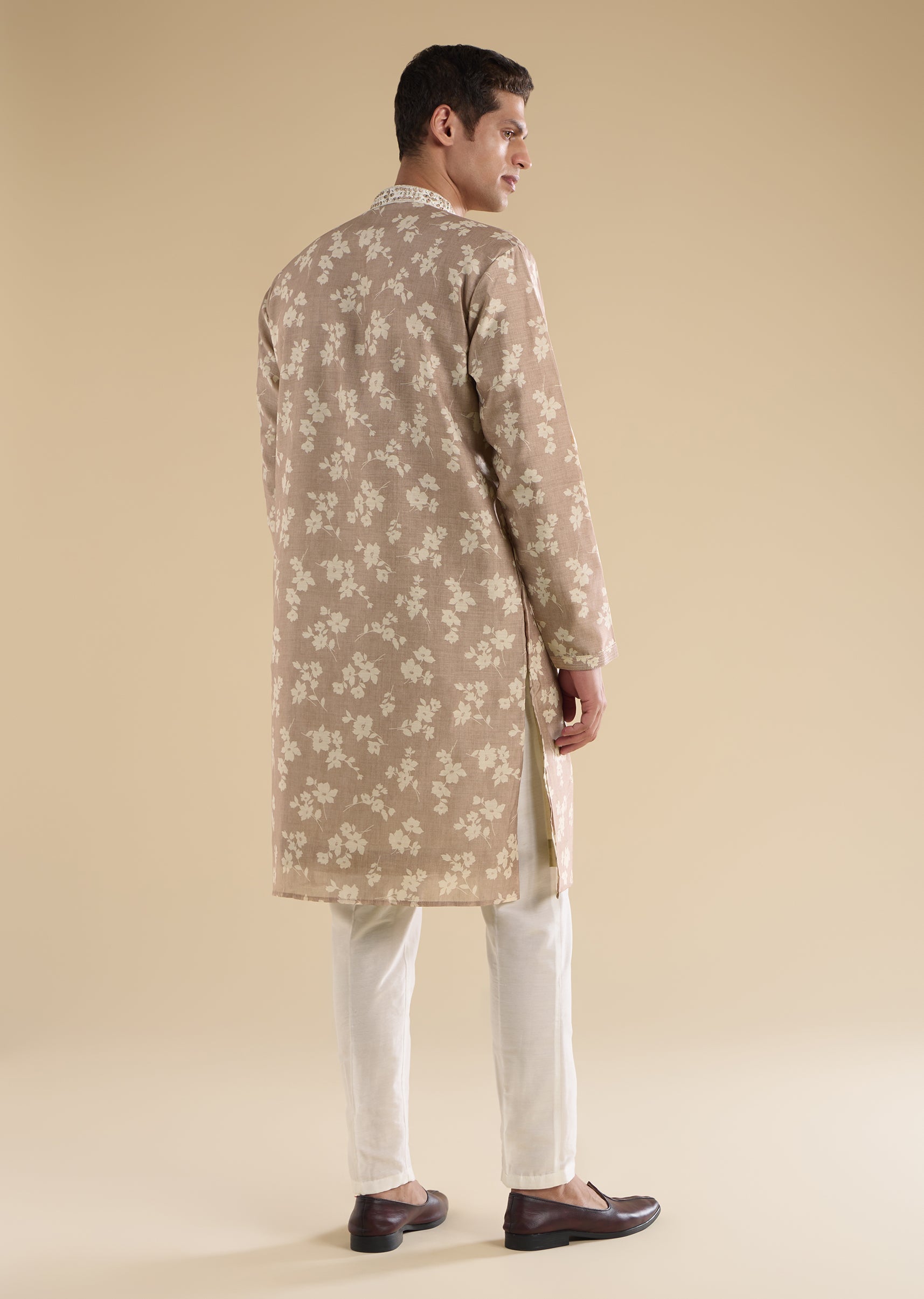 The beige crepe kurta set with floral print and zari work delivers understated glamour.