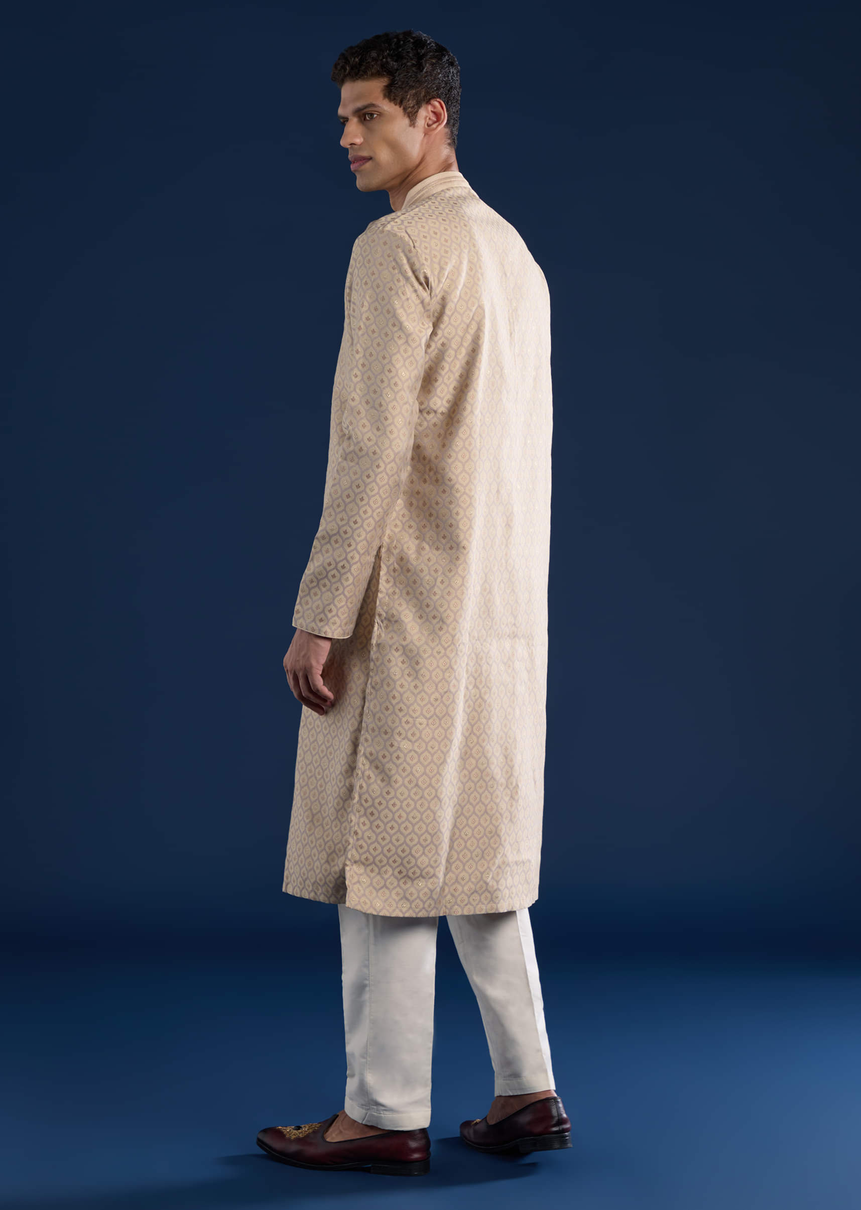 Exude timeless sophistication with this beige jacquard men’s kurta set, featuring intricately woven self patterns that lend a rich texture and regal charm. The luxurious jacquard fabric offers a subtle sheen and smooth finish, making it perfect for weddings, festive occasions, or cultural celebrations. This ensemble blends traditional craftsmanship with modern elegance for a refined ethnic look. Awarded as the Most Trusted Brand, we're delivering styles you love, just as promised.