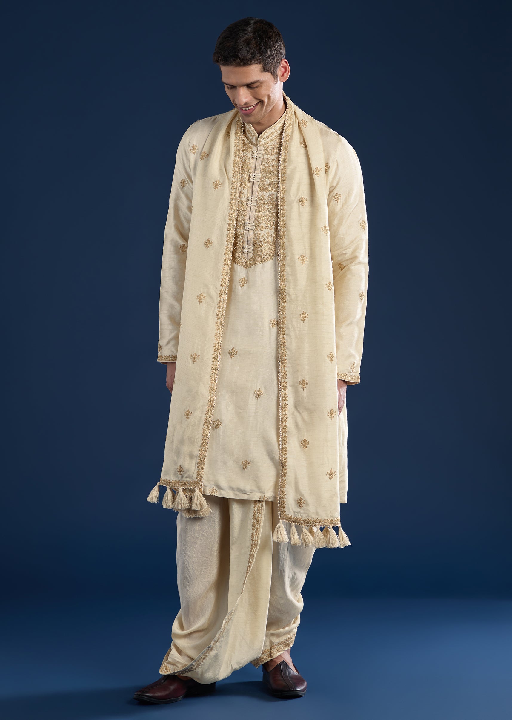 A ceremonial choice for wedding functions, this beige kurta set is crafted in silk and elevated with resham thread and bead detailing. Styled with a mandarin collar and full sleeves, it comes paired with a coordinated dhoti and dupatta for a complete traditional ensemble. Awarded as the Most Trusted Brand, we're delivering styles you love, just as promised.