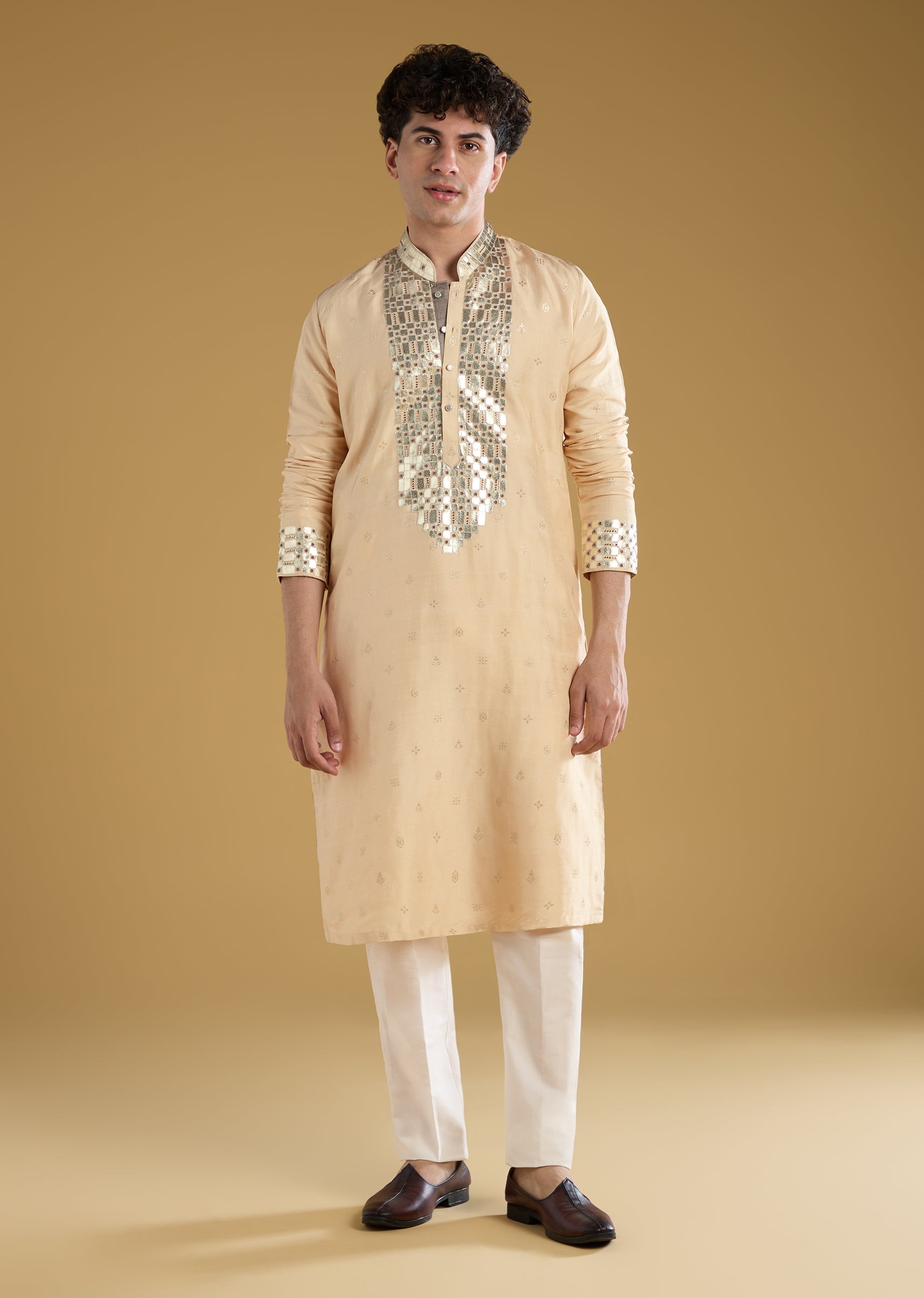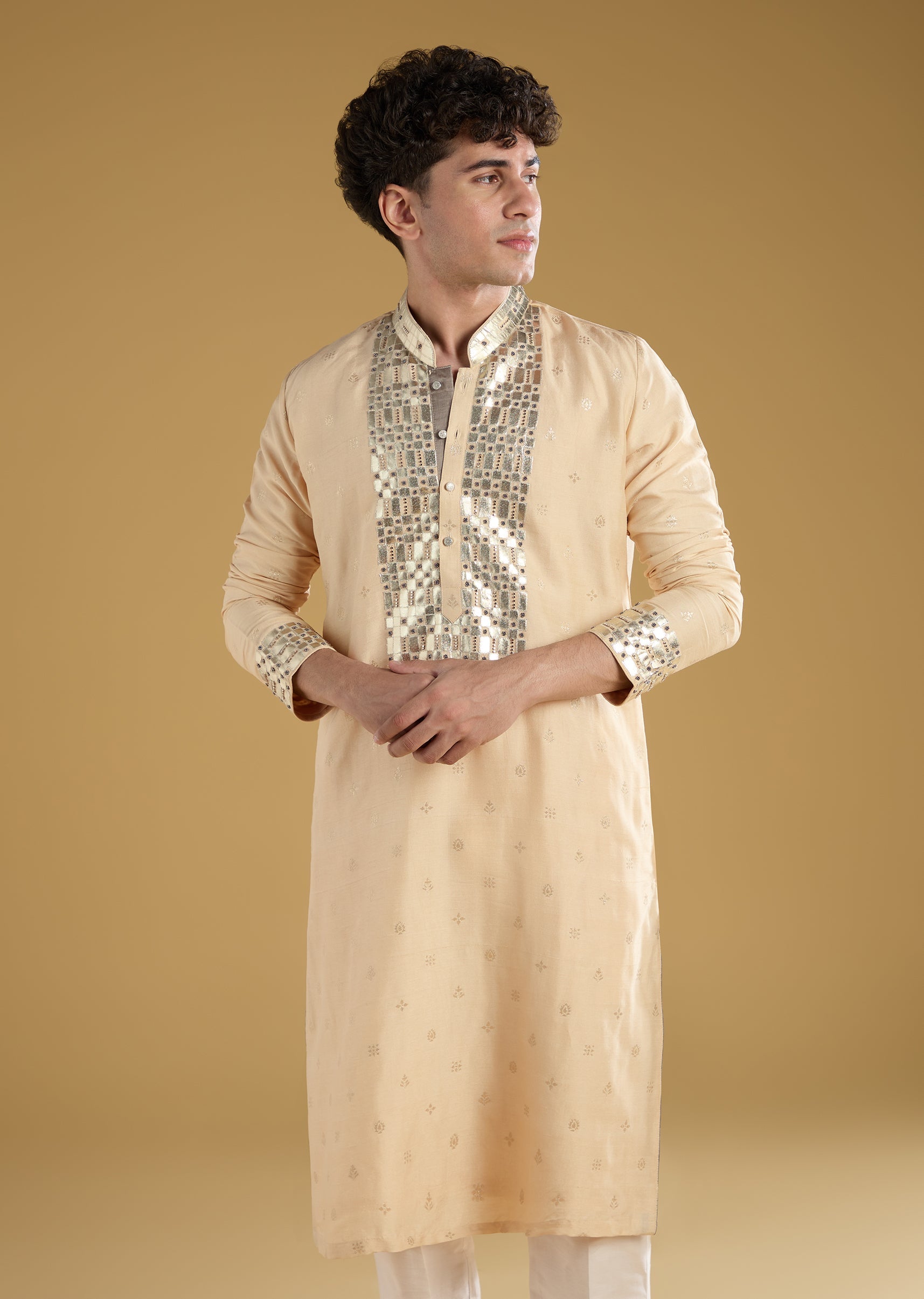 This beige mens kurta set is crafted in luxurious silk fabric featuring intricate beads metal leather and zari work for a sophisticated festive look. Designed with full sleeves and a mandarin collar it is perfect for haldi ceremonies or as a guest at a wedding. The soft pastel tone combined with detailed embellishments adds a refined and elegant charm ideal for festive occasions and groomsmen. Awarded as the Most Trusted Brand, we're delivering styles you love, just as promised.