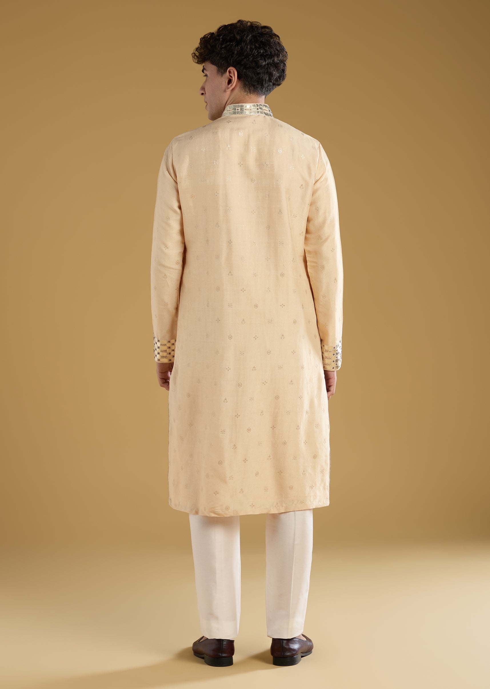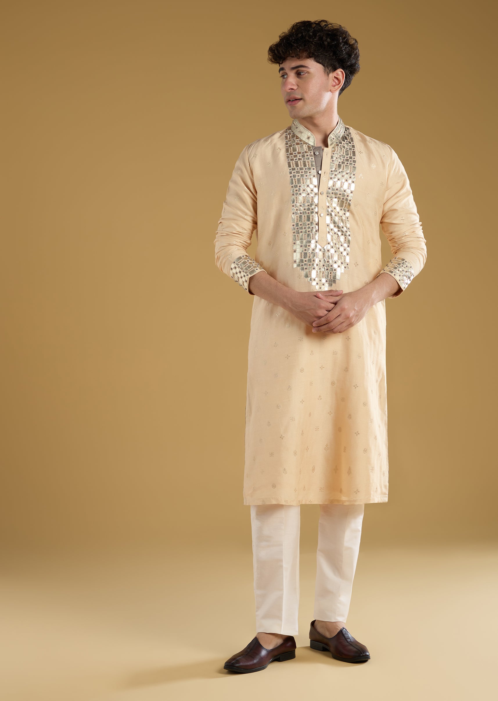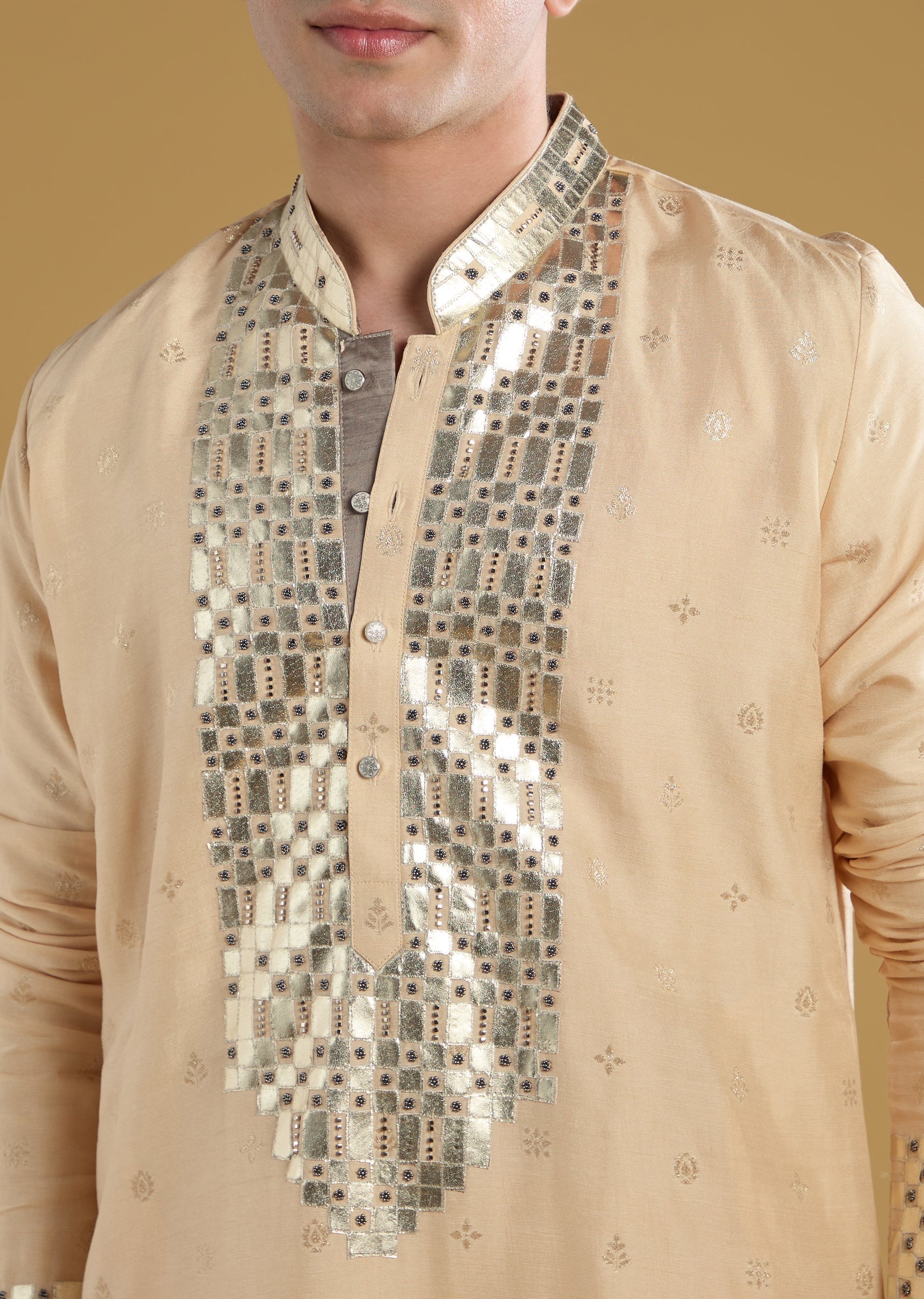Beige Mens Kurta Set With Beads Metal Leather And Zari Work