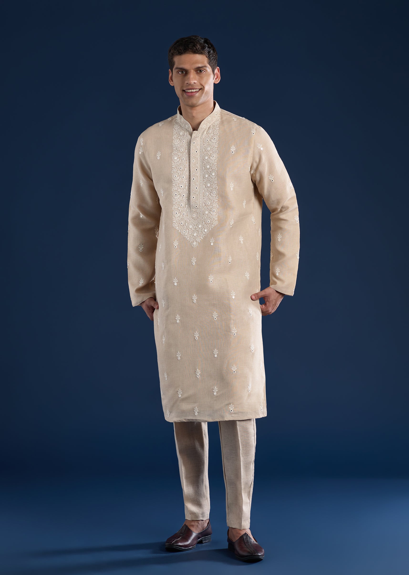 A refined pick for pooja and festive wear, this beige kurta set is crafted in silk and elevated with delicate resham thread and mirror detailing. Designed with a mandarin collar, full sleeves, and side slits, it pairs with straight-fit trousers and an elasticated waistband for added comfort. Awarded as the Most Trusted Brand, we're delivering styles you love, just as promised.