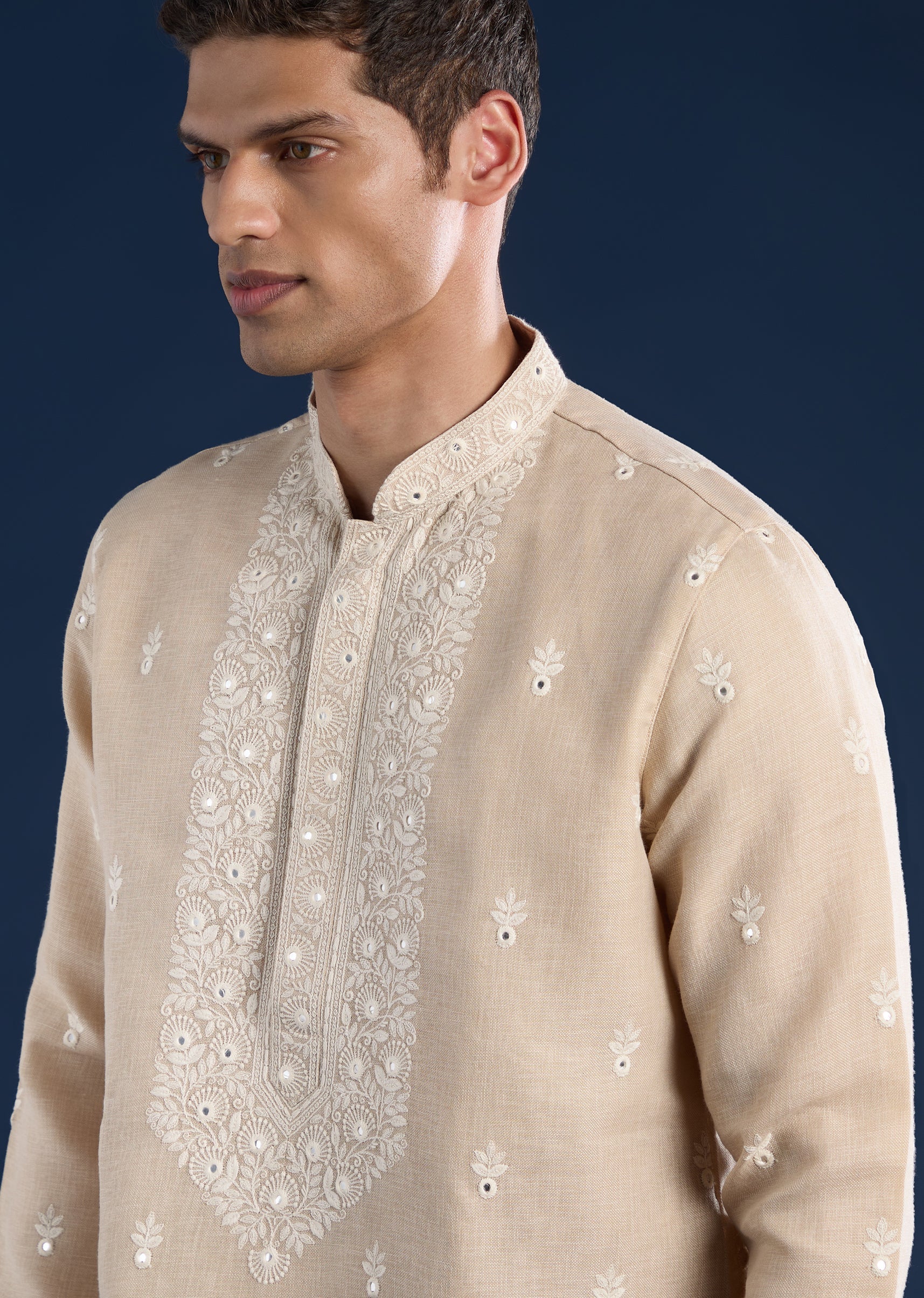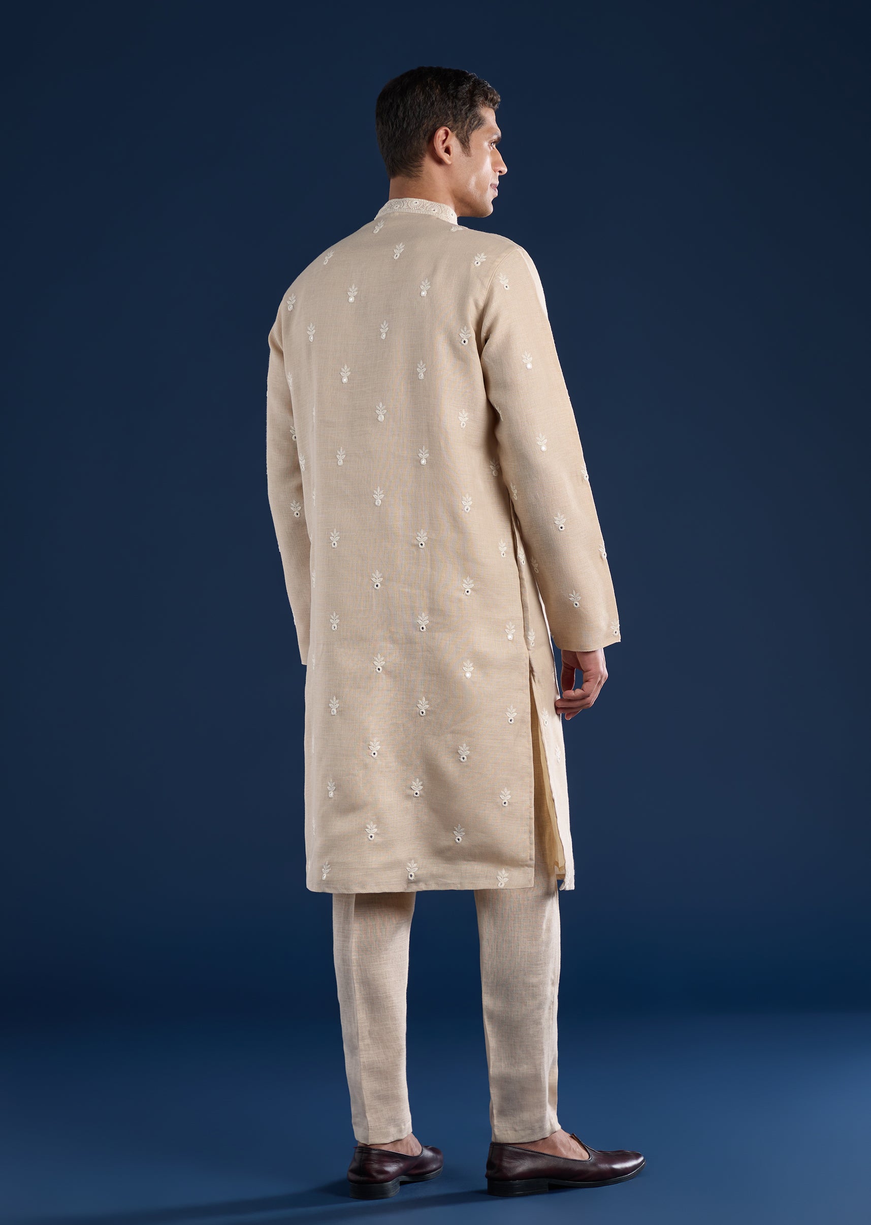 A refined pick for pooja and festive wear, this beige kurta set is crafted in silk and elevated with delicate resham thread and mirror detailing. Designed with a mandarin collar,... More Product Details