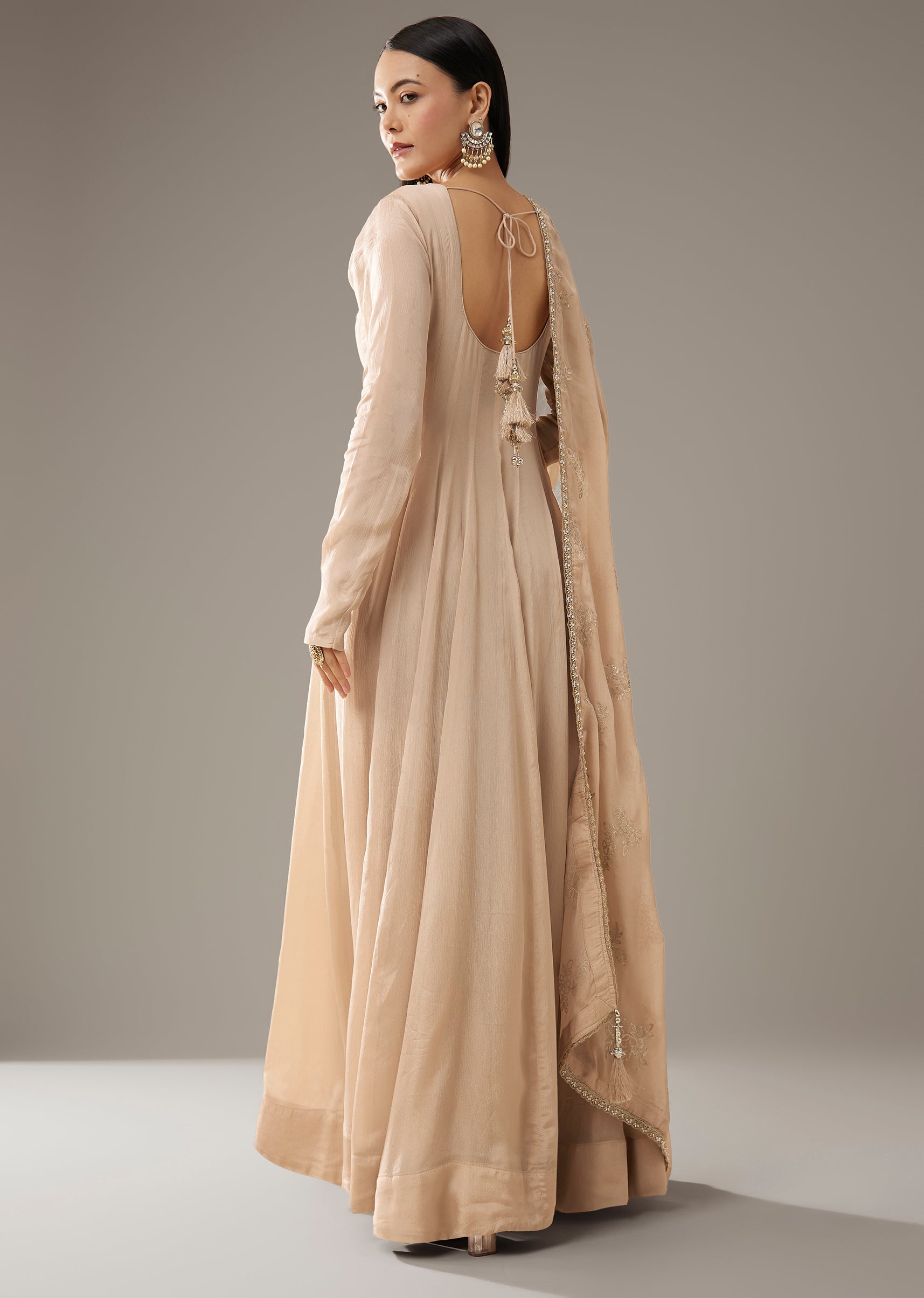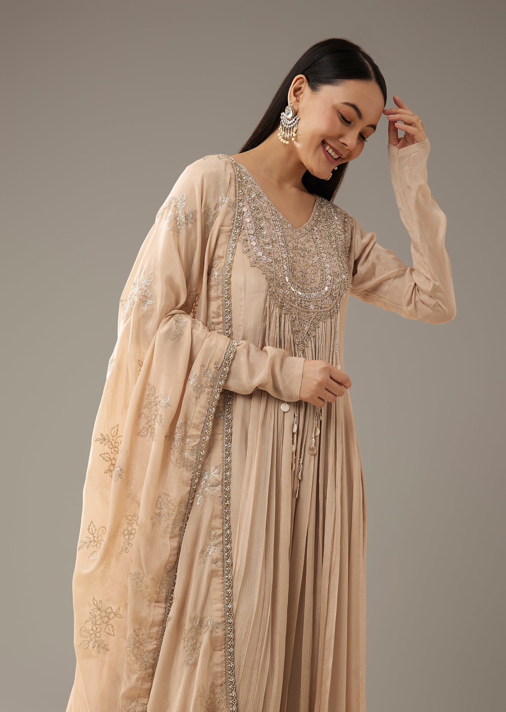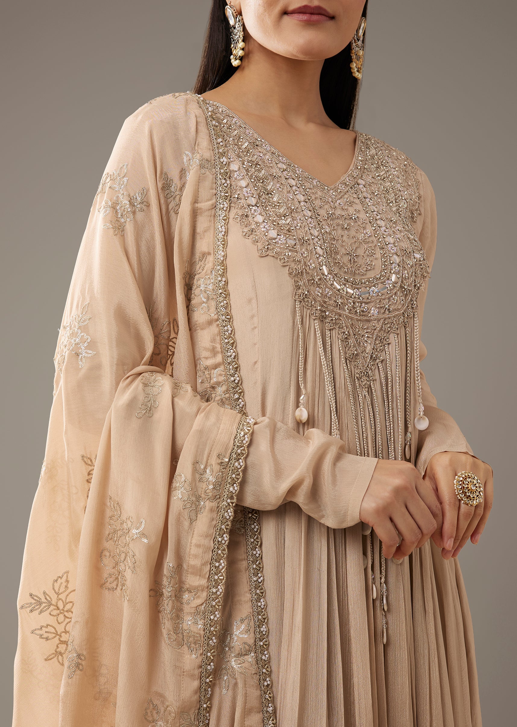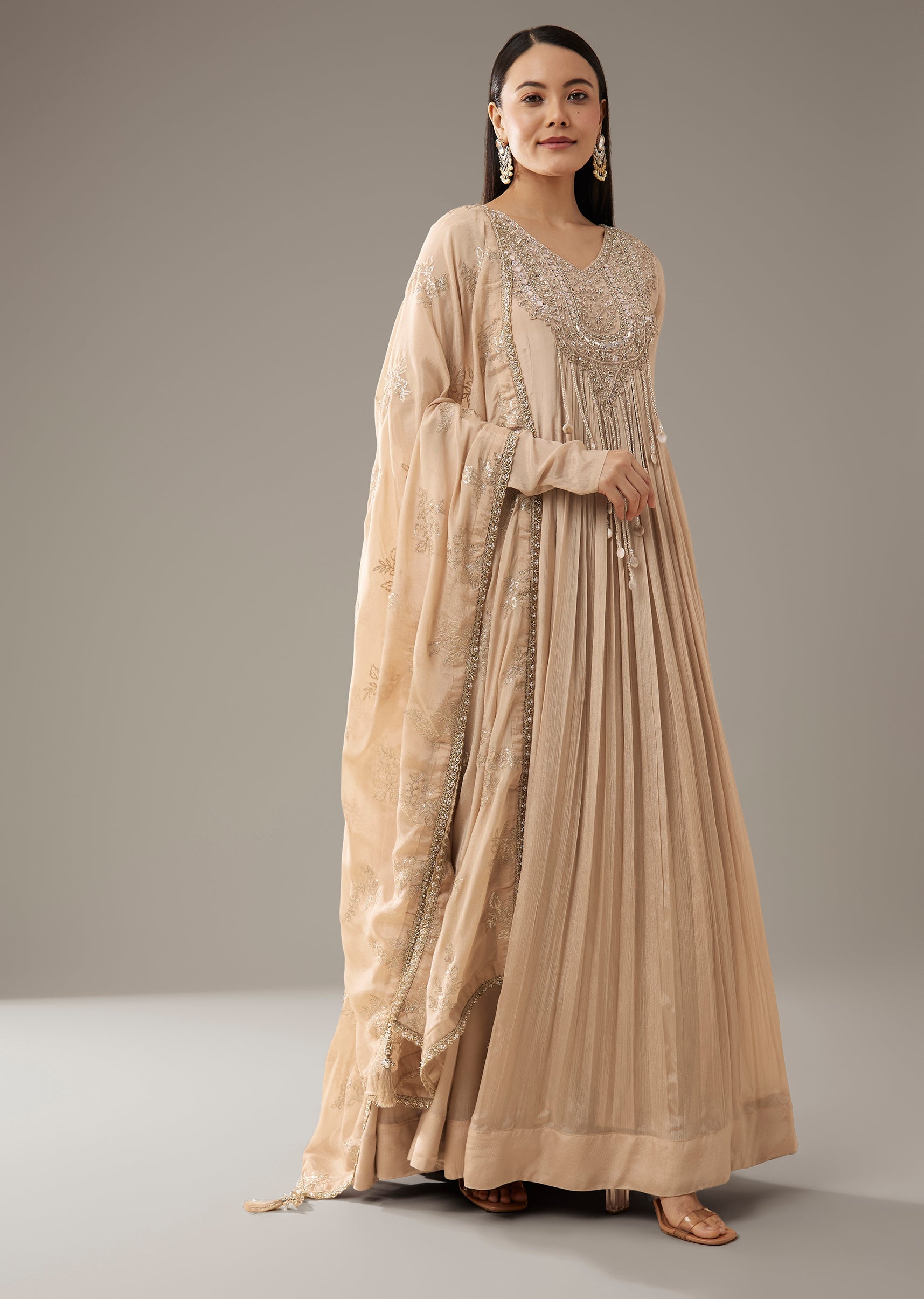 Add festive sparkle to your wardrobe with this chinon anarkali, adorned with beads, mirror, and sequin work that creates a luminous, captivating finish. The soft chinon fabric gives the silhouette... More Product Details