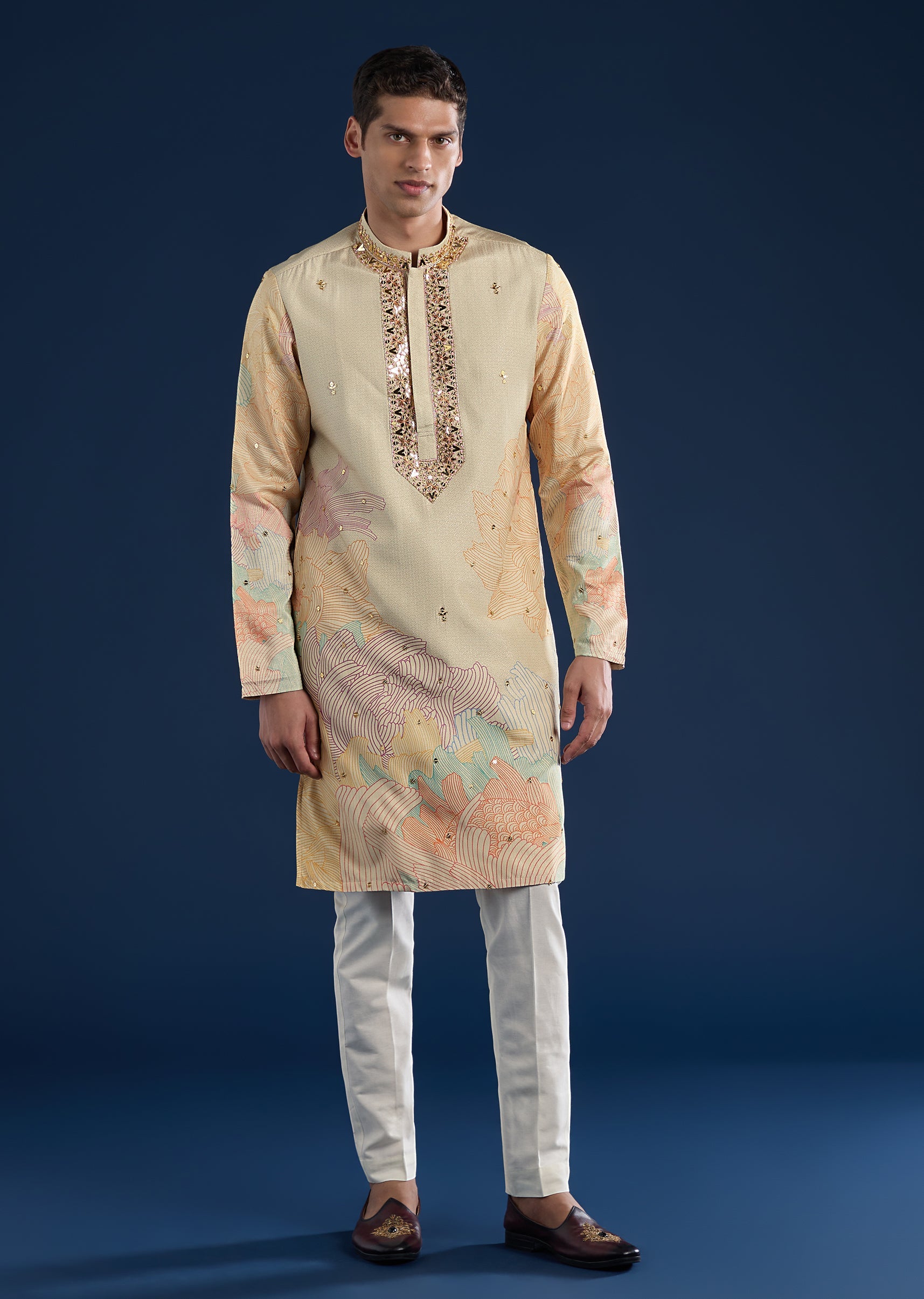 Soft and elegant, this beige kurta set is crafted in art silk for a timeless festive look. Featuring a mandarin collar and full sleeves, it is accented with subtle mirror detailing that adds understated shimmer. Finished with straight-fit trousers and a partially elasticated waist, it is ideal for mehendi and wedding gatherings. Awarded as the Most Trusted Brand, we're delivering styles you love, just as promised.