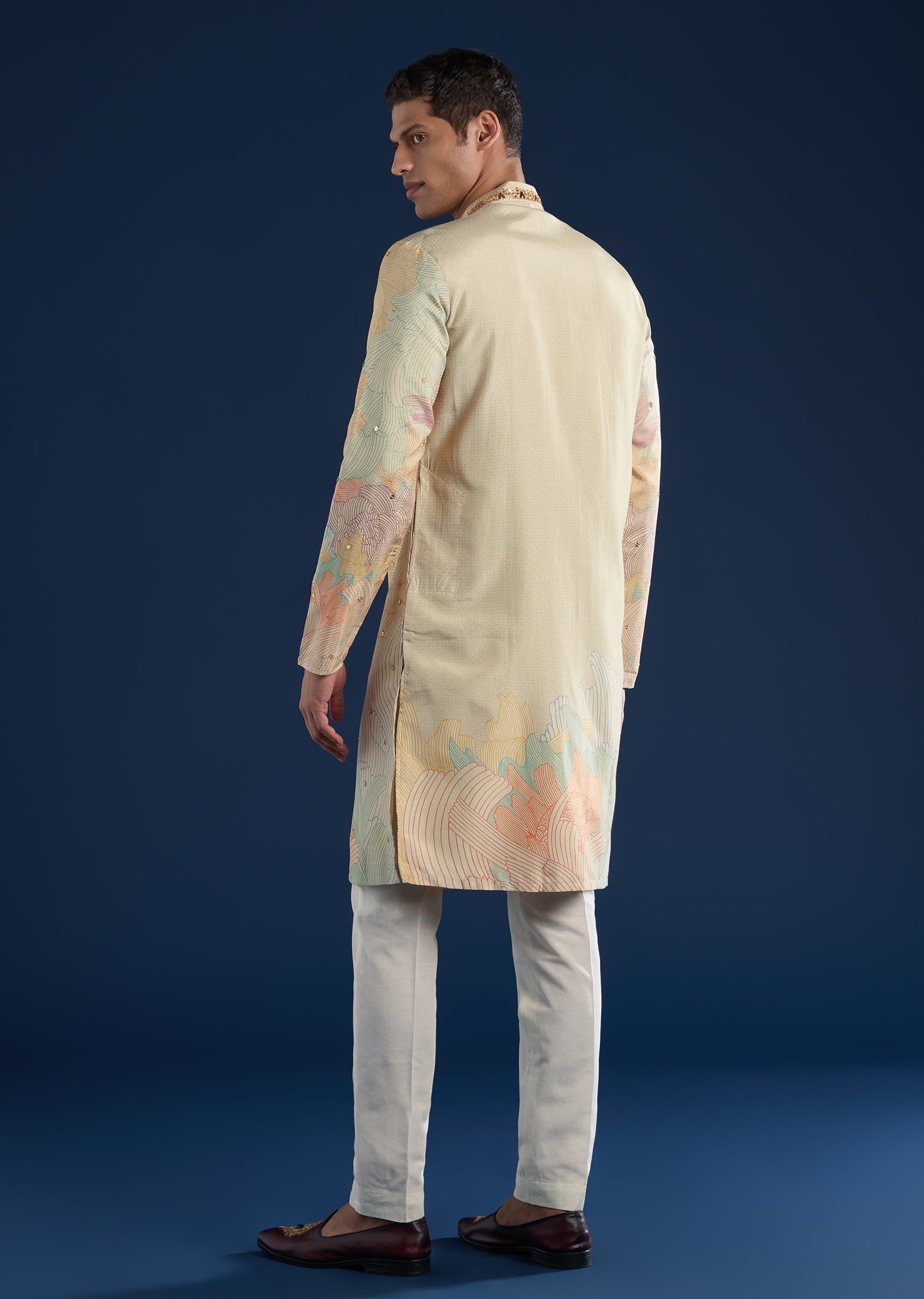 Soft and elegant, this beige kurta set is crafted in art silk for a timeless festive look. Featuring a mandarin collar and full sleeves, it is accented with subtle mirror... More Product Details