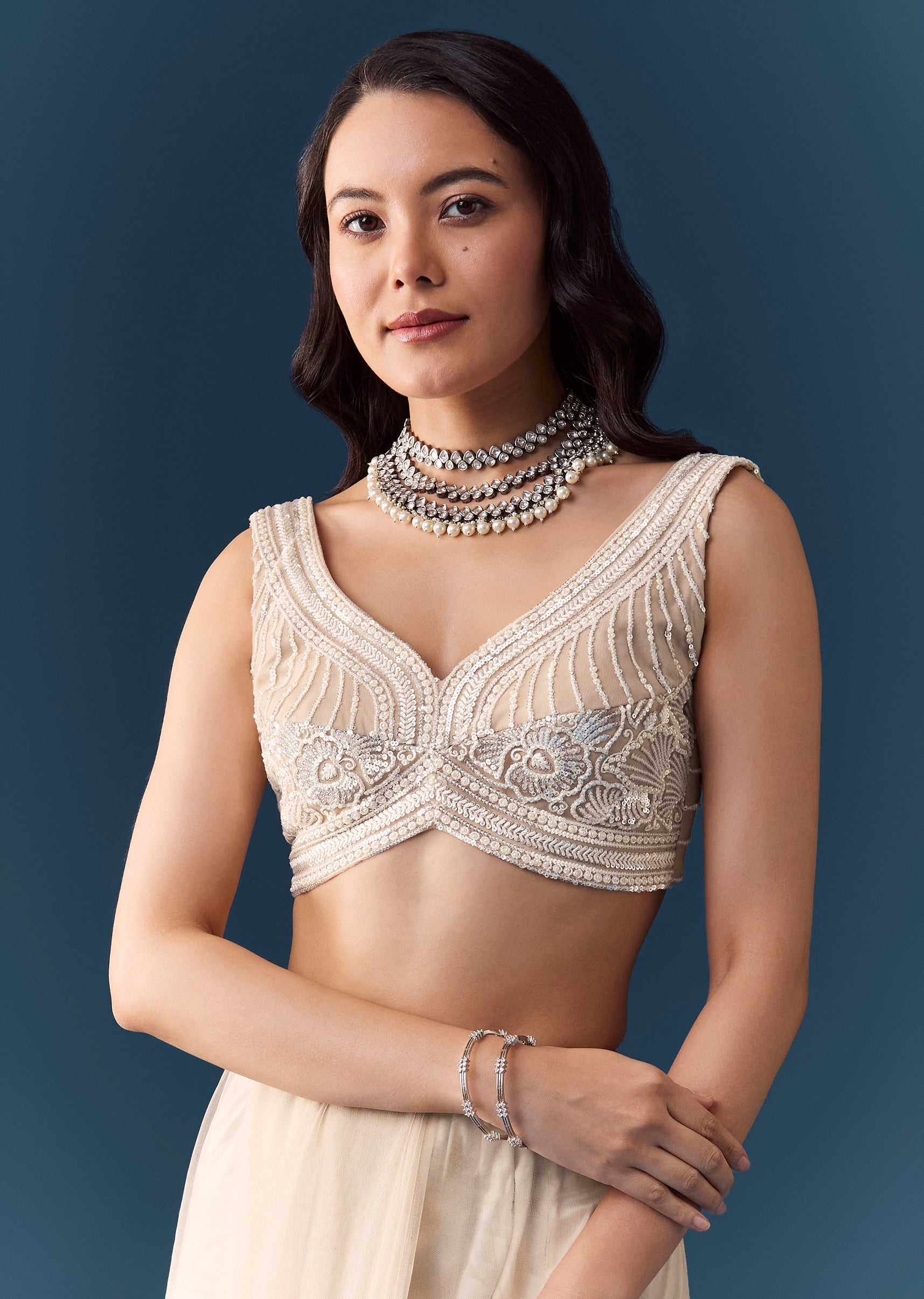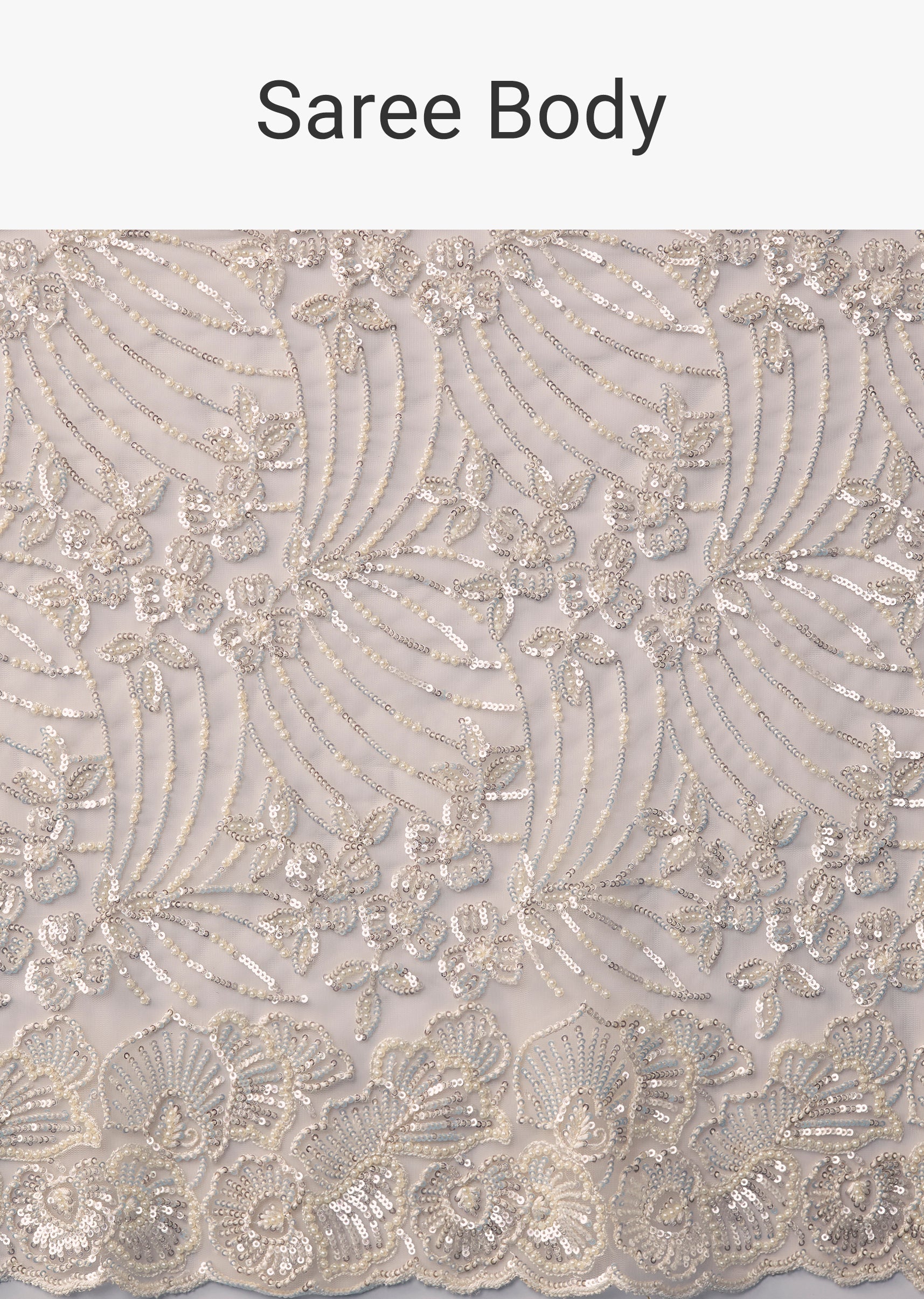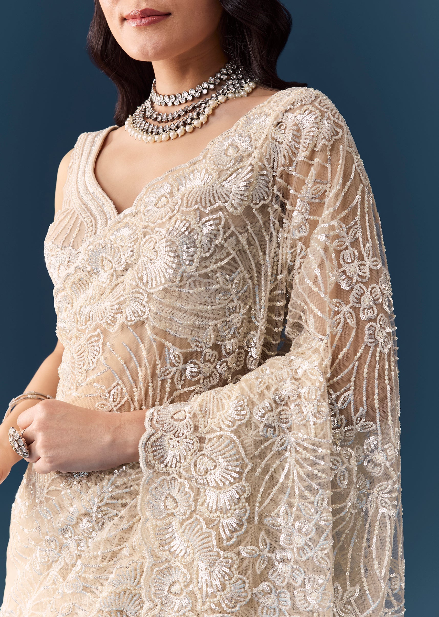 Beige Net Floral Jaal Sequin Work Saree with Unstitched Blouse