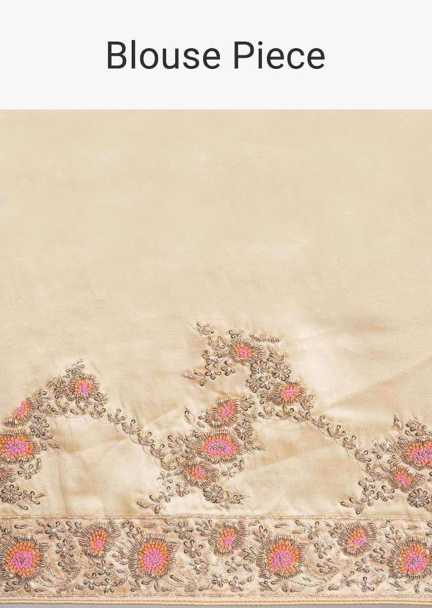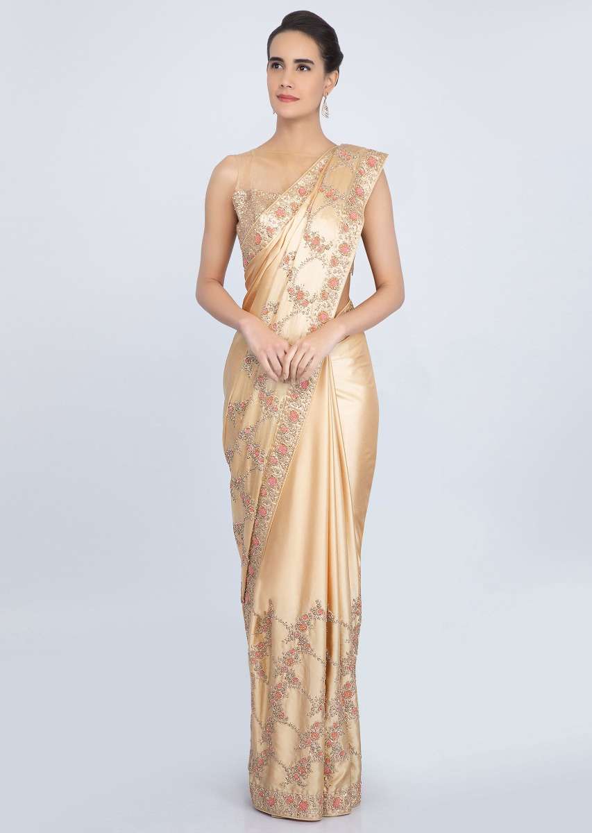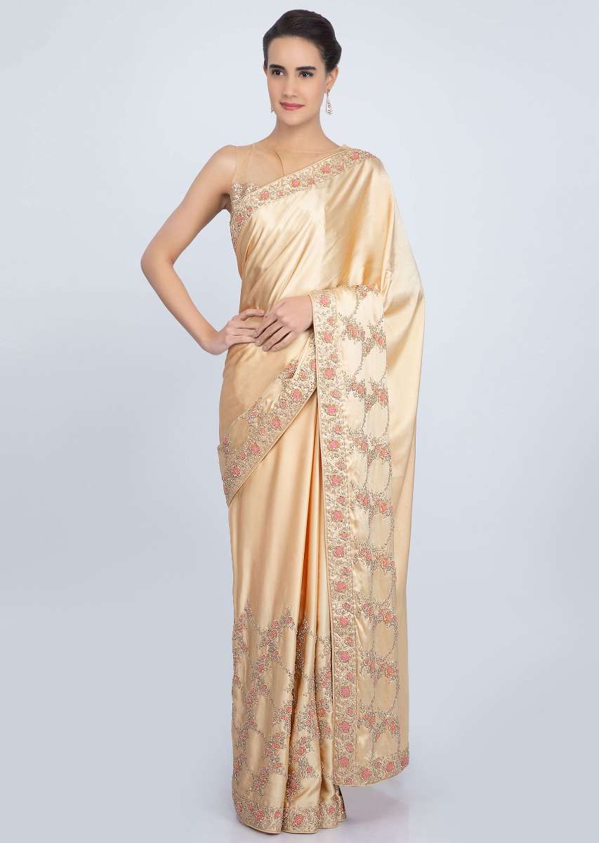 Beige Saree In Satin With Embroidered Lower Bottom And Pallo Online - Kalki Fashion