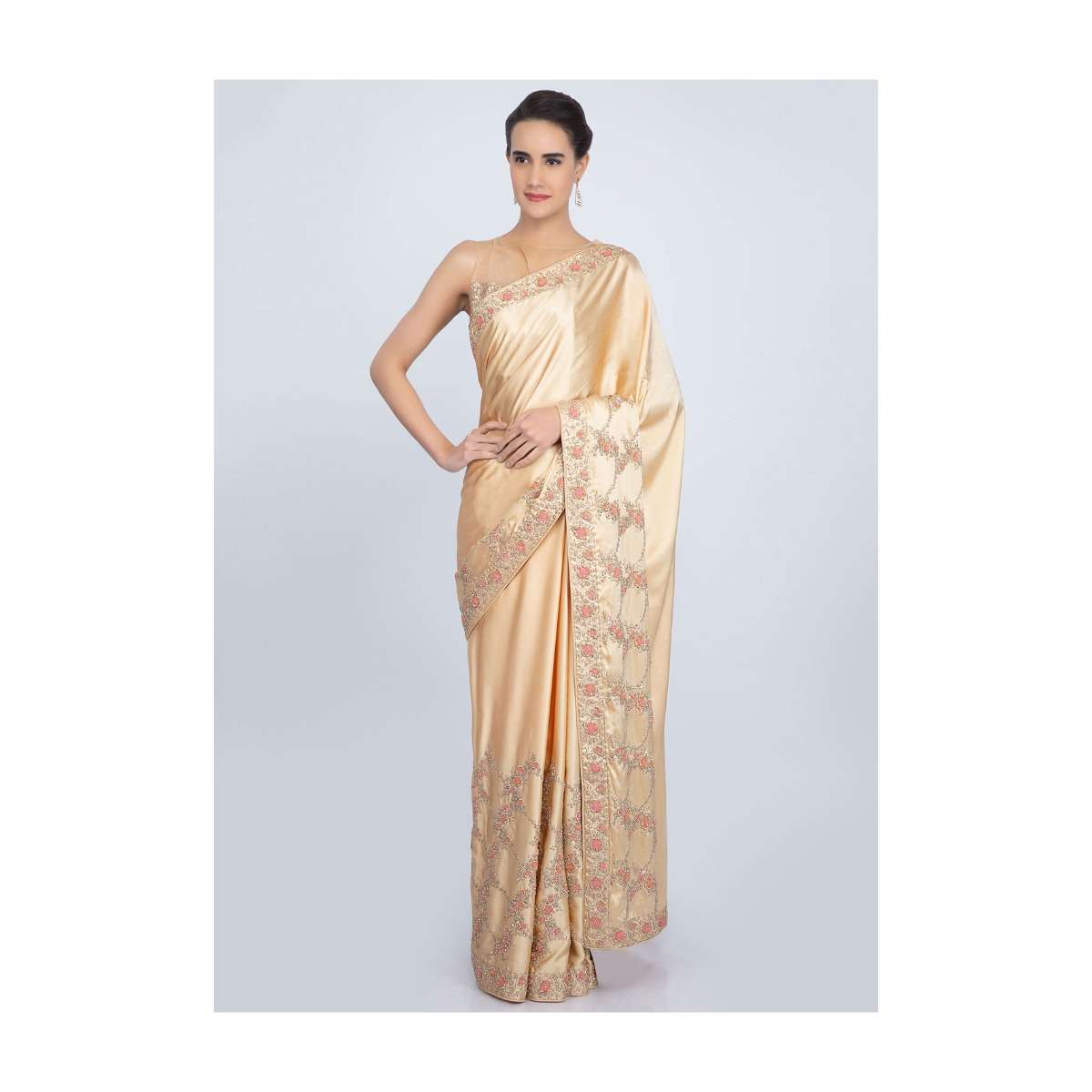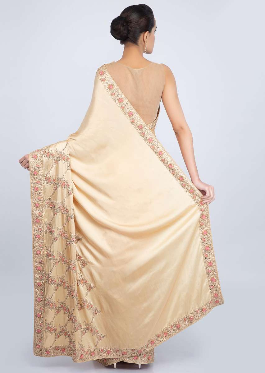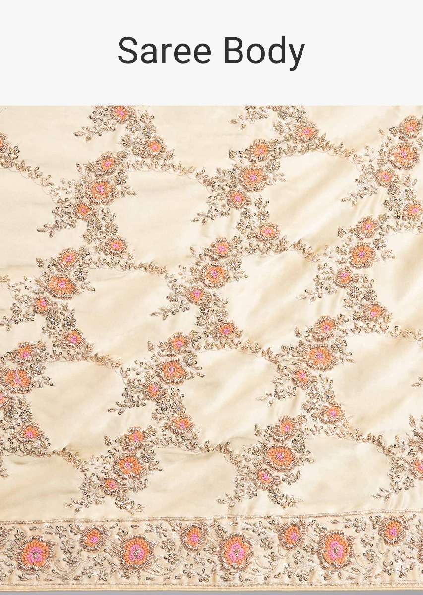 Beige Saree In Satin With Embroidered Lower Bottom And Pallo Online - Kalki Fashion