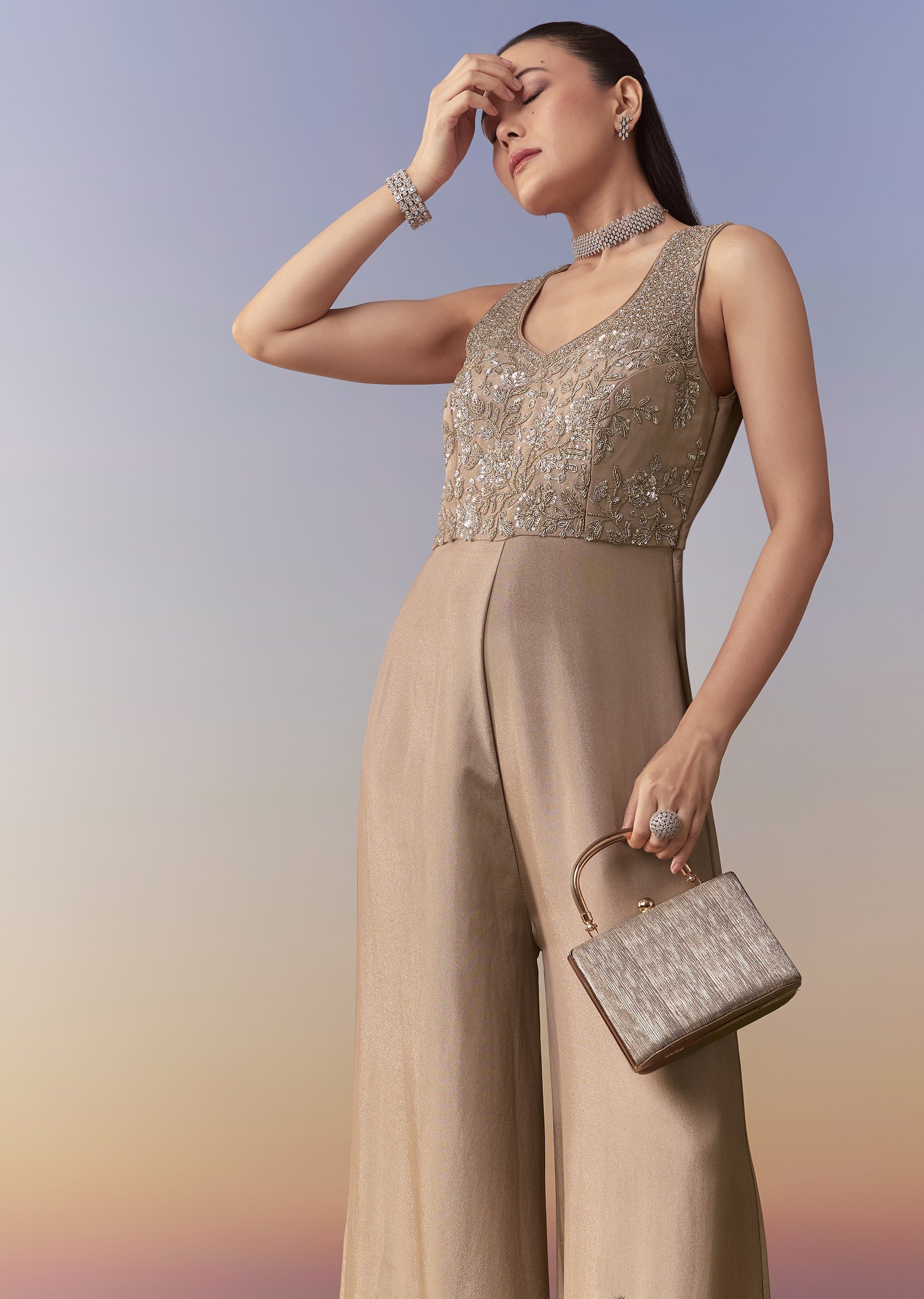 Elevate your festive style with this beige tissue jumpsuit, adorned with delicate sequins and cutdana work that adds a soft, elegant shimmer. The lightweight tissue fabric drapes beautifully, giving the... More Product Details