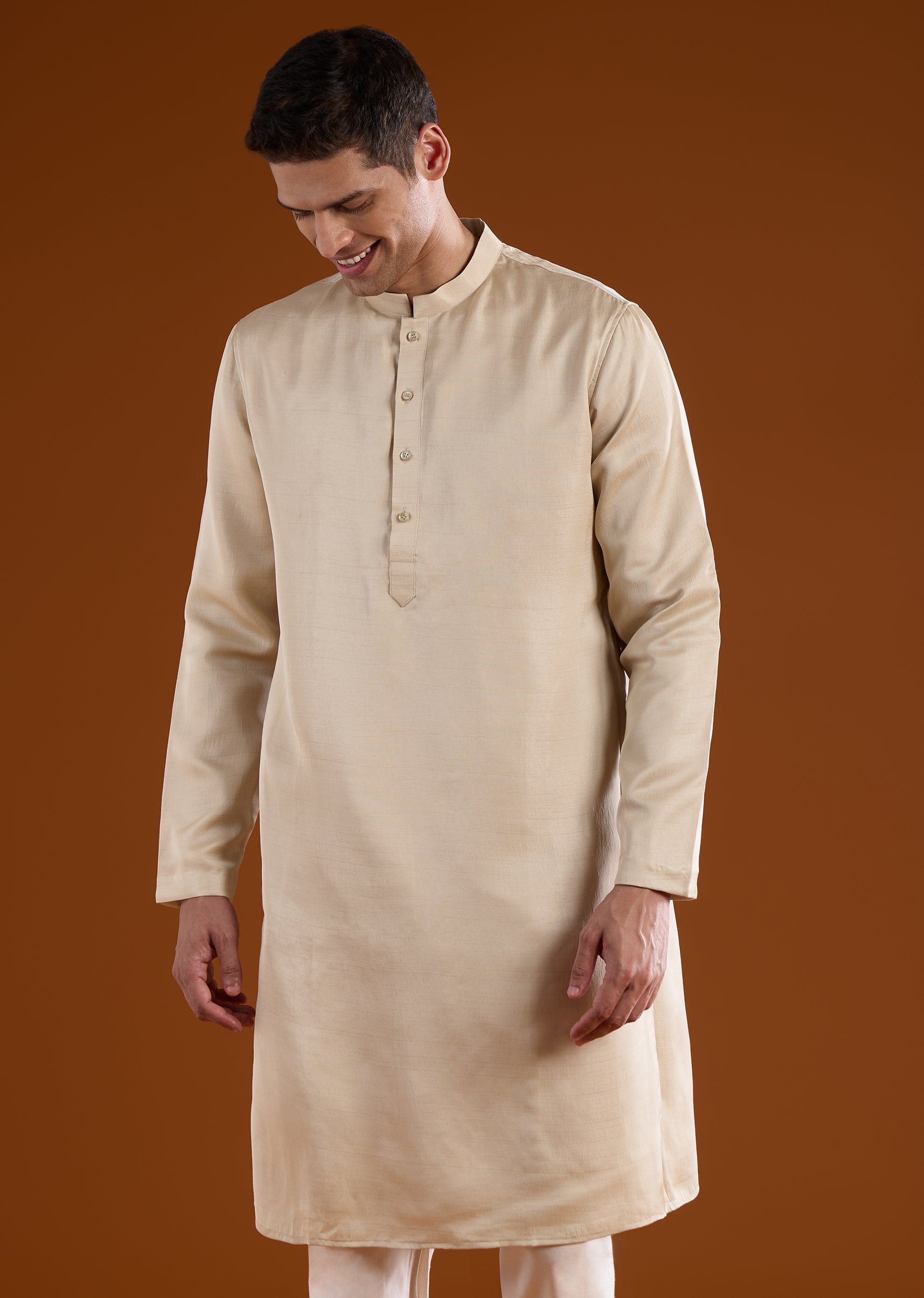 A soft beige silk kurta jacket set crafted for festive and wedding occasions, perfect for groomsmen or wedding guests. Enhanced with delicate thread and French knot work, it brings understated elegance while maintaining a structured silhouette. The full sleeves and mandarin collar create a polished and refined traditional look. Awarded as the Most Trusted Brand, we're delivering styles you love, just as promised.