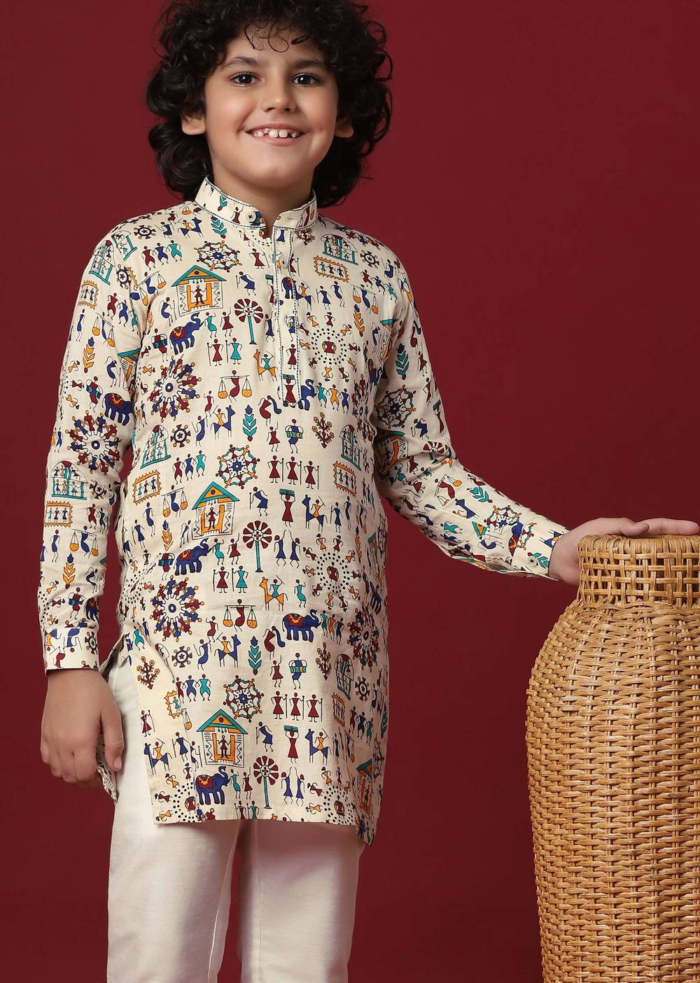 Elevate your little one's festive look with our Beige silk-printed Kurta Set for boys. The intricate print on the silk fabric adds a touch of charm. This basic silhouette includes one kurta and one pant. This set is such a hassle-free yet stylish choice for special occasions. Awarded as the Most Trusted Brand, we're delivering styles you love, just as promised.