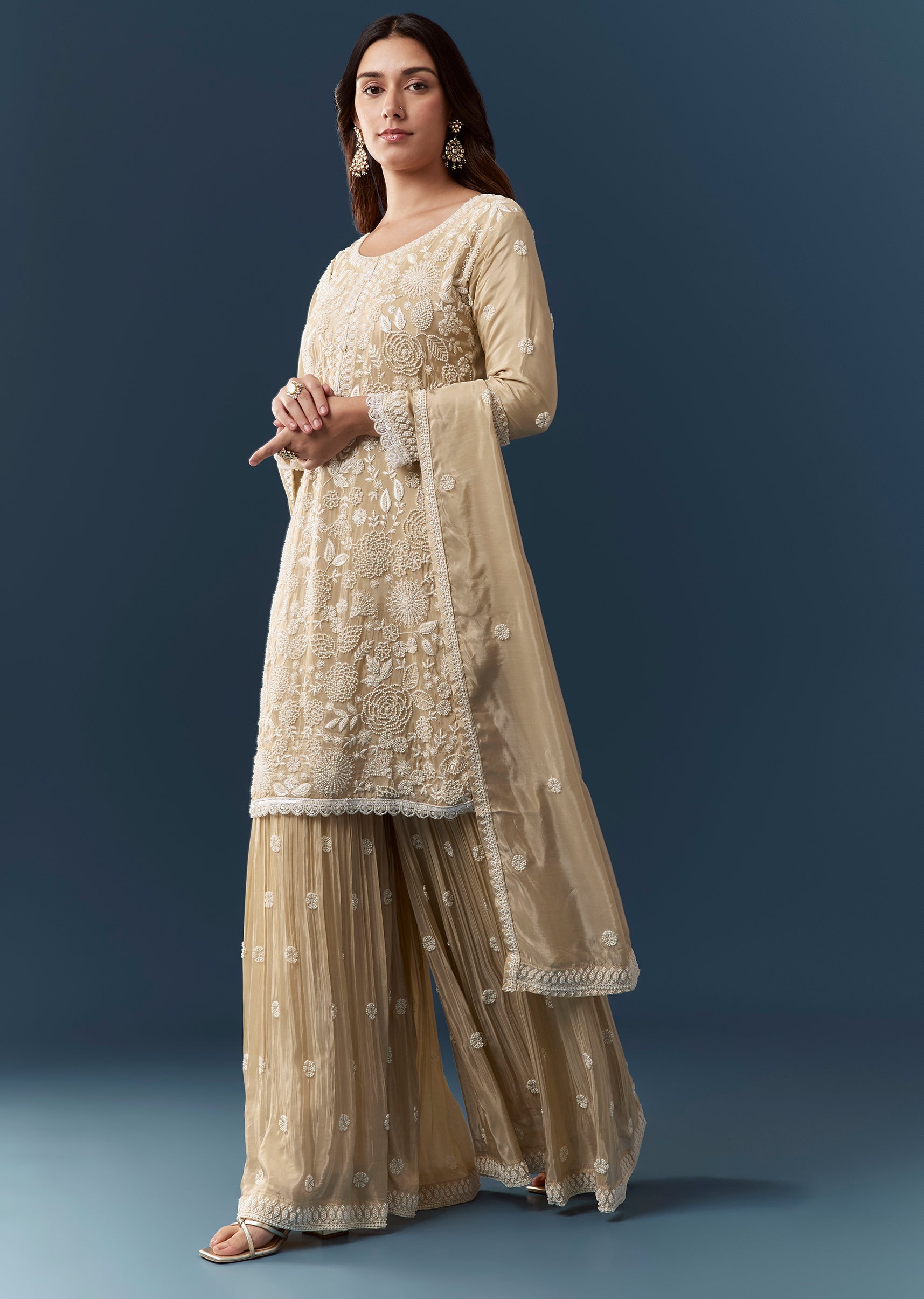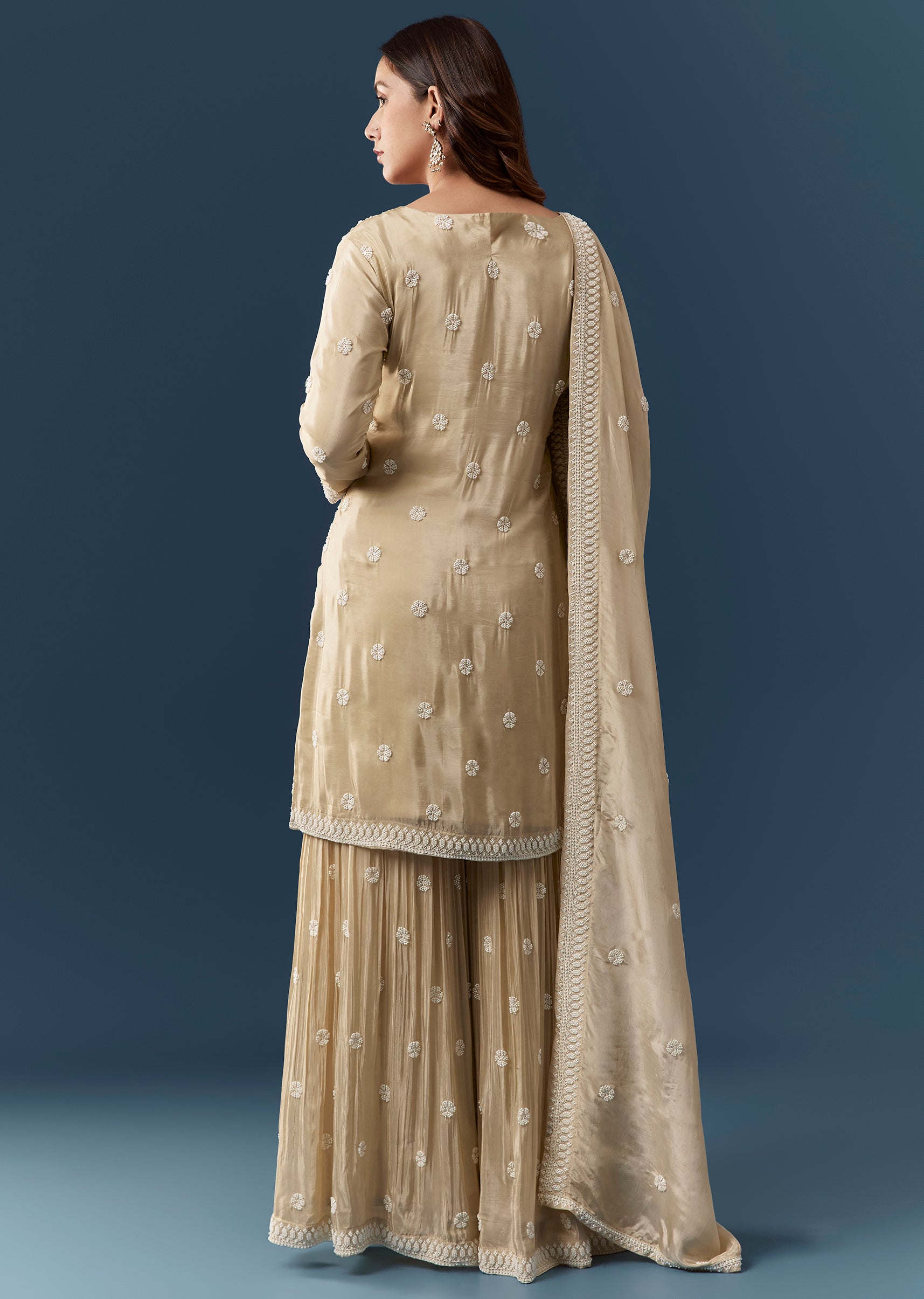 Ensure the kurta fits comfortably at the shoulders and bust and check that the sharara rests securely at the waist for easy graceful movement.