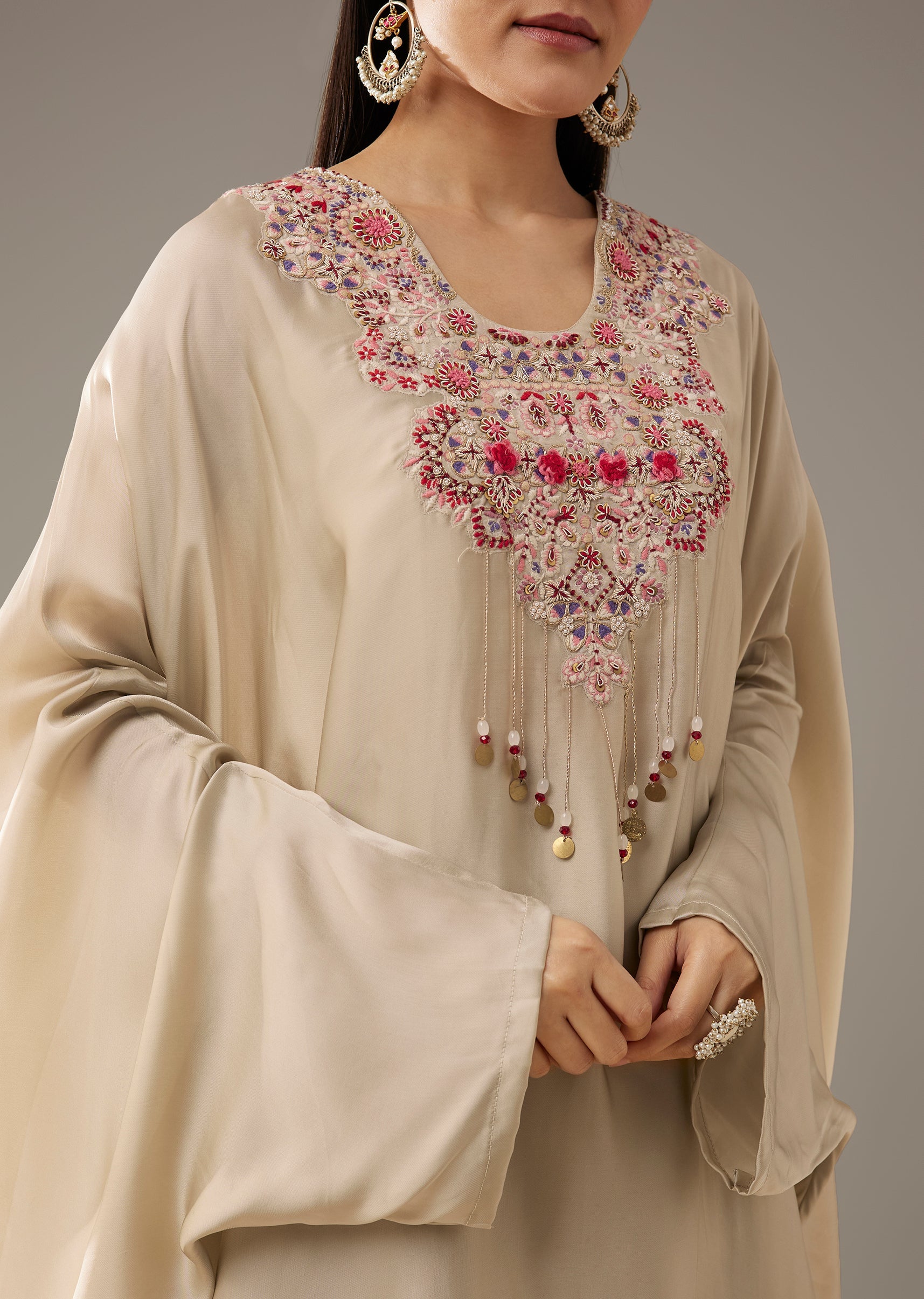 Beige Thread Embroidered Top and Dhoti Skirt Set