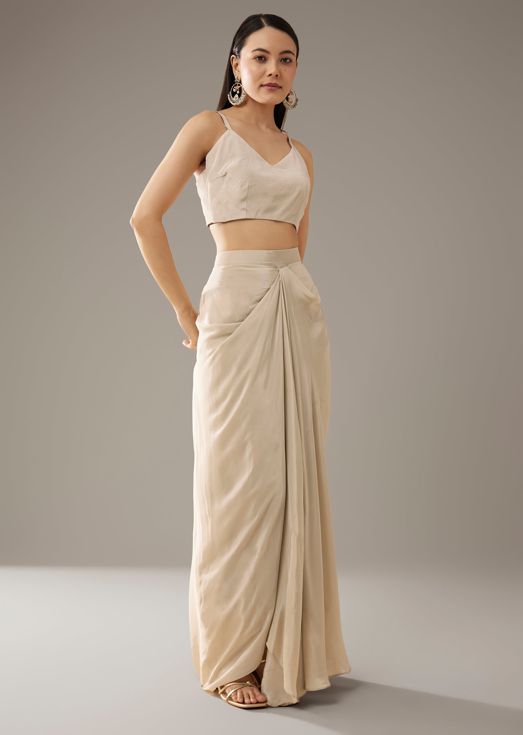 Create a chic fusion look with this beige silk top and dhoti-style skirt set, featuring delicate thread work that adds subtle texture and elegance. The coordinated inner and skirt offer... More Product Details