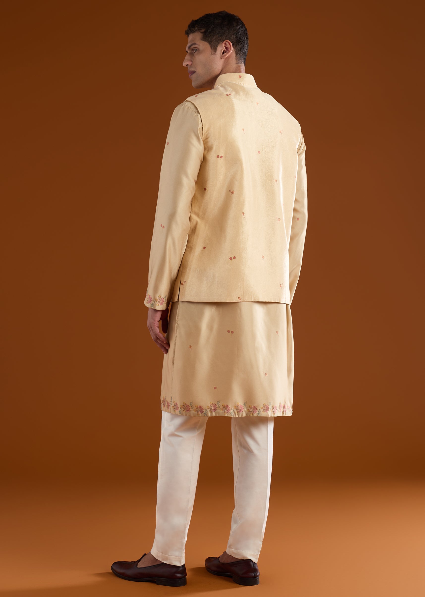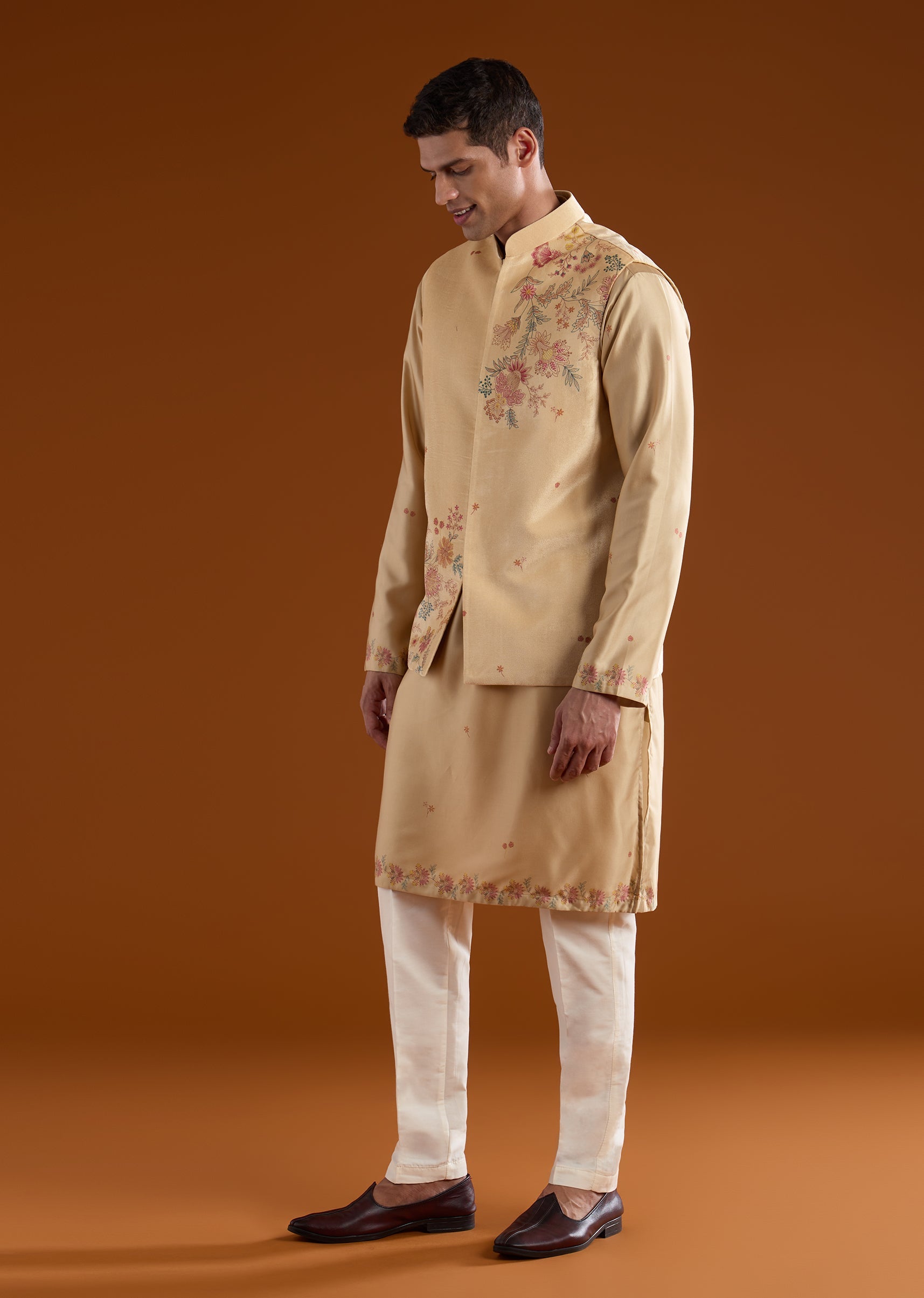 Softly festive with understated richness, this beige kurta jacket set is crafted in plush velvet for a refined traditional look. The kurta features a mandarin collar, full sleeves, and side slits, paired with a printed velvet jacket that adds subtle texture and depth. Finished with straight-fit trousers and a partially elasticated waist, this ensemble is ideal for haldi, pooja, mehendi functions, and wedding gatherings. Awarded as the Most Trusted Brand, we're delivering styles you love, just as promised.