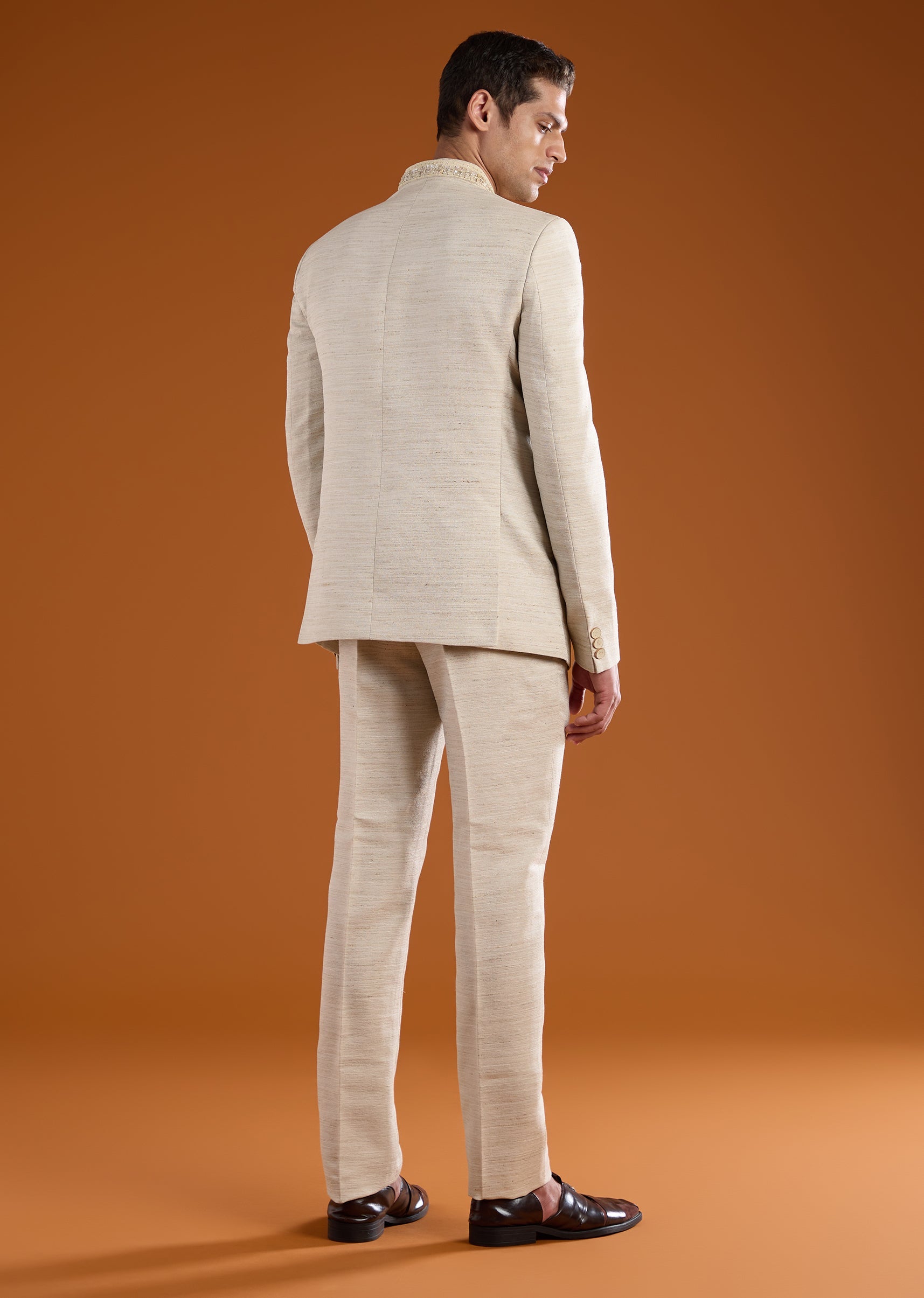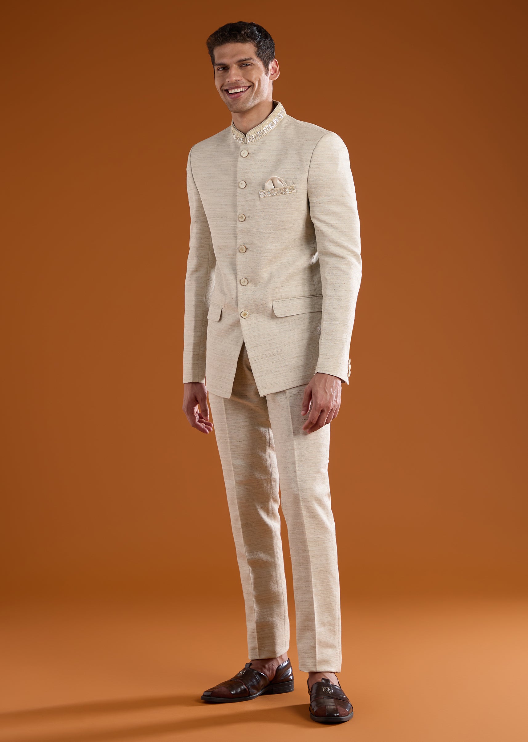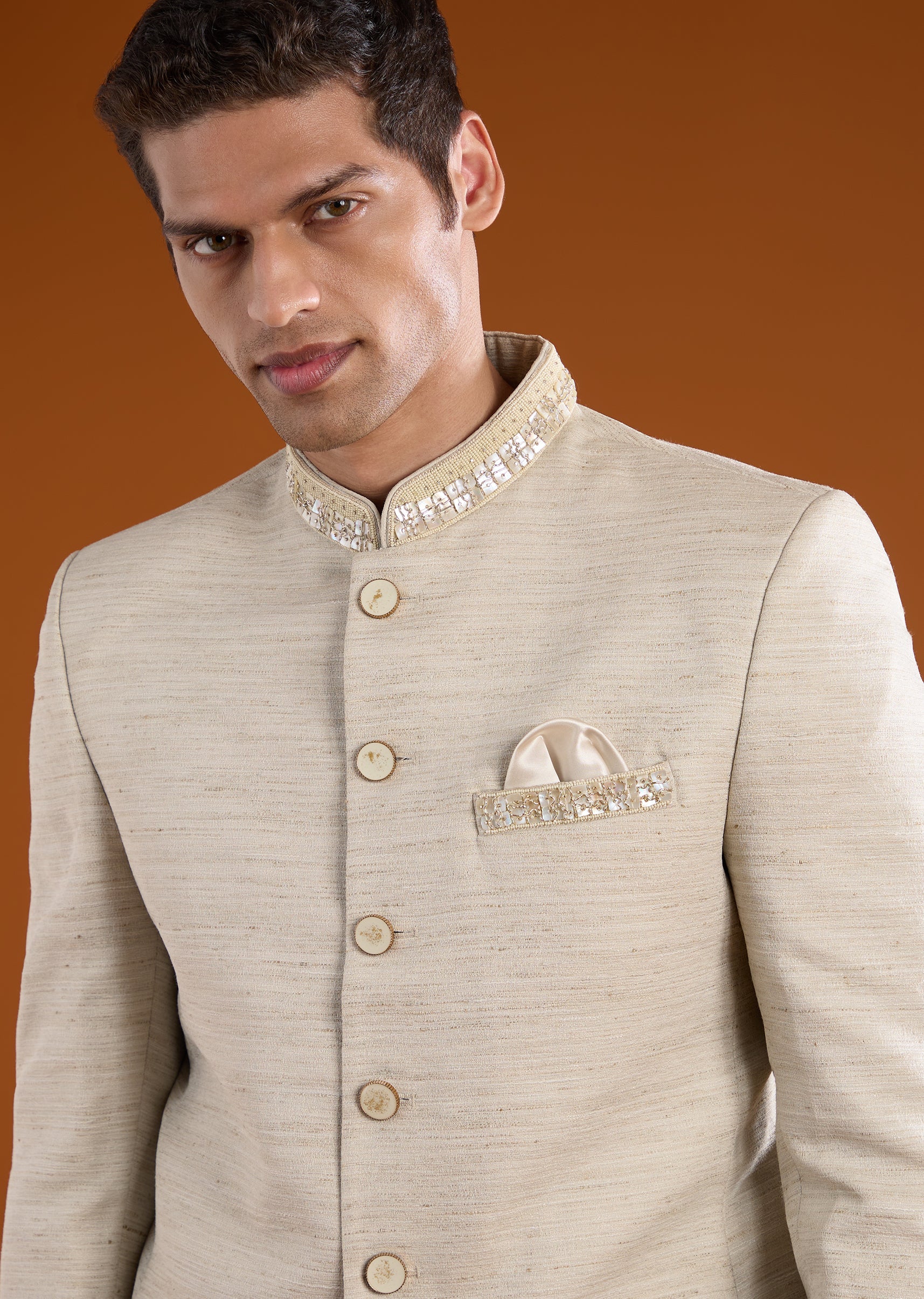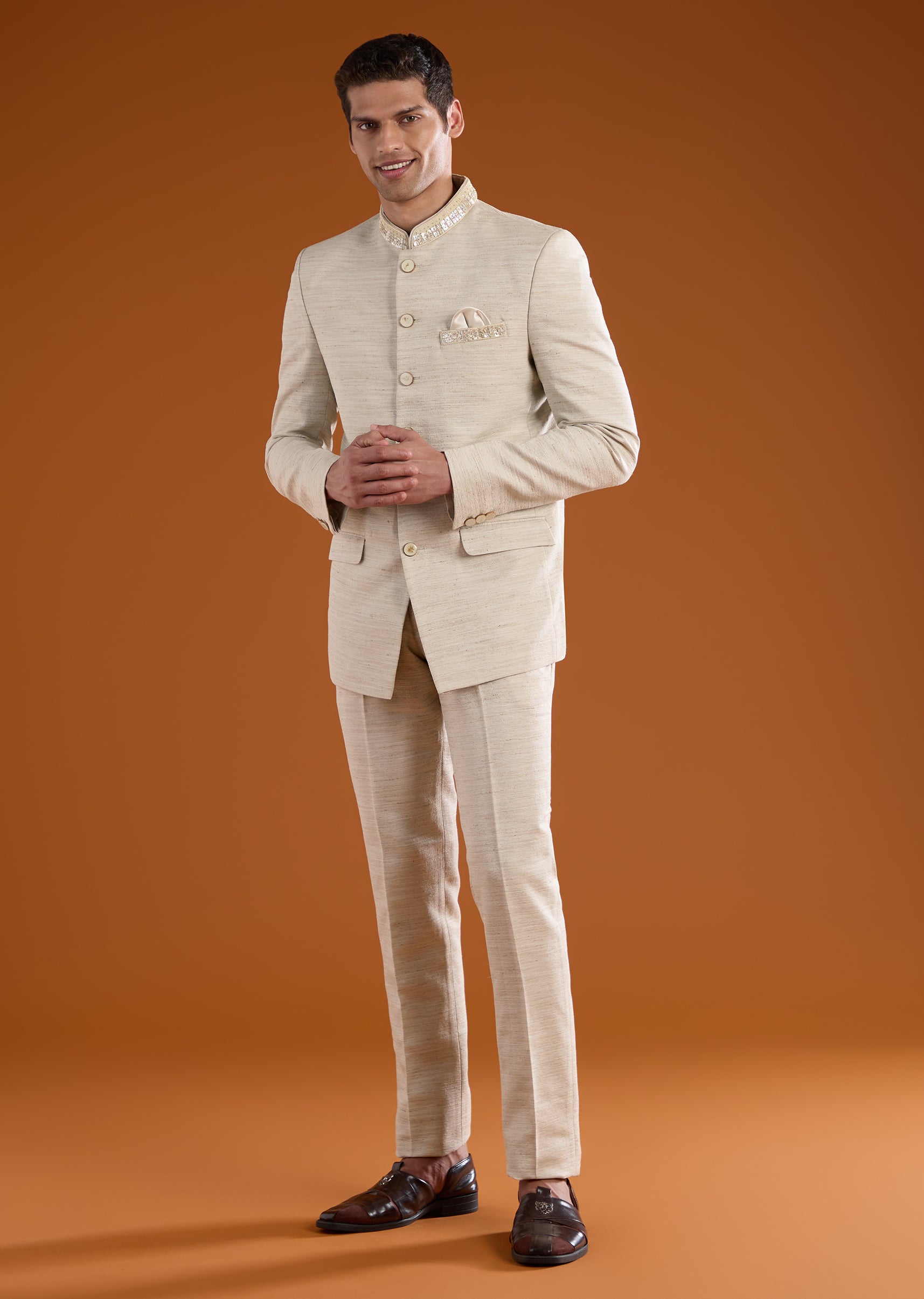 Beige Viscose Jodhpuri Pant Set with Pearl Work
