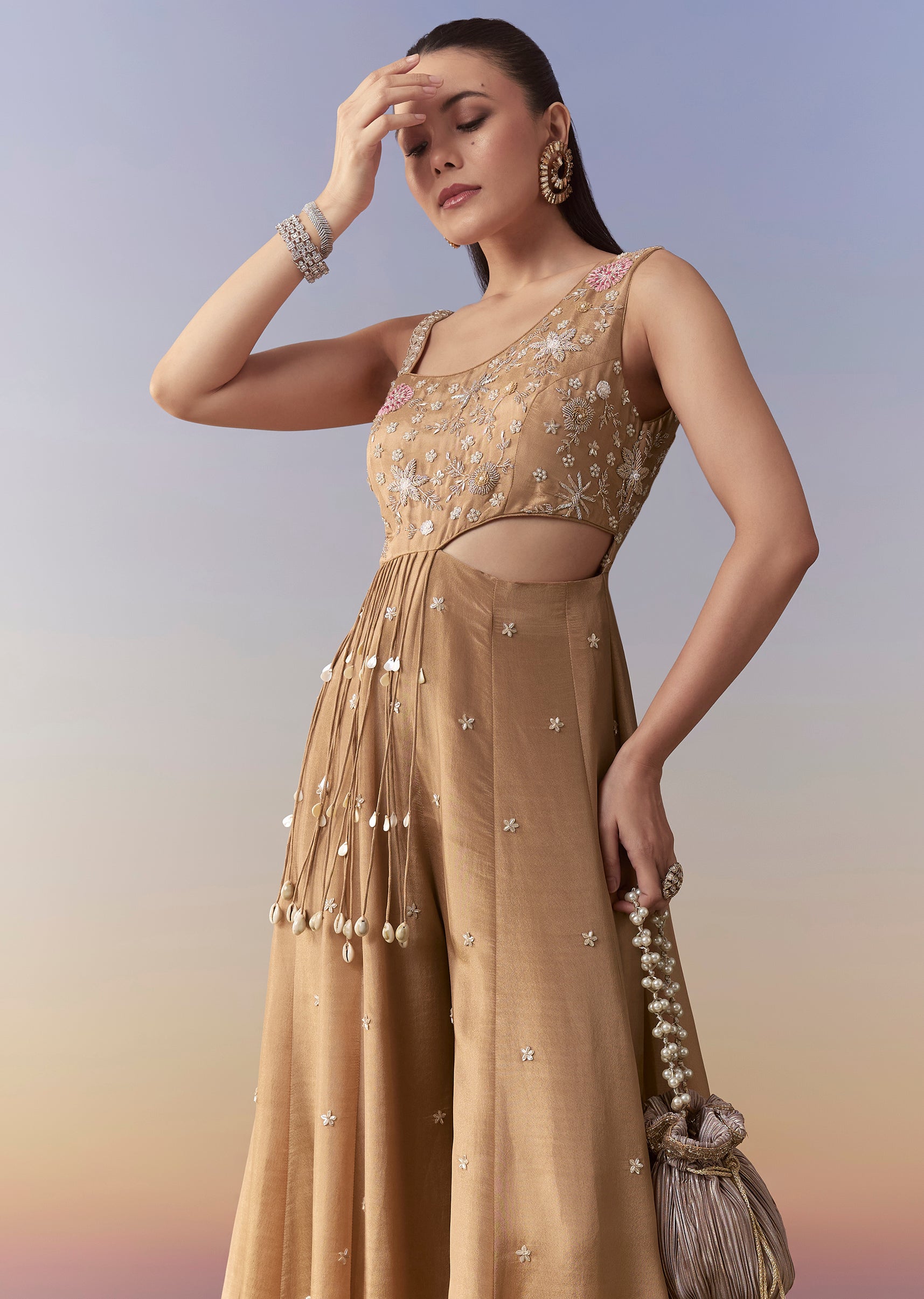 Make a chic statement with this fawn-beige jumpsuit, intricately embellished with zardosi and bead work that adds a touch of luxe shimmer. The stylish cut out detailing at the waist,... More Product Details