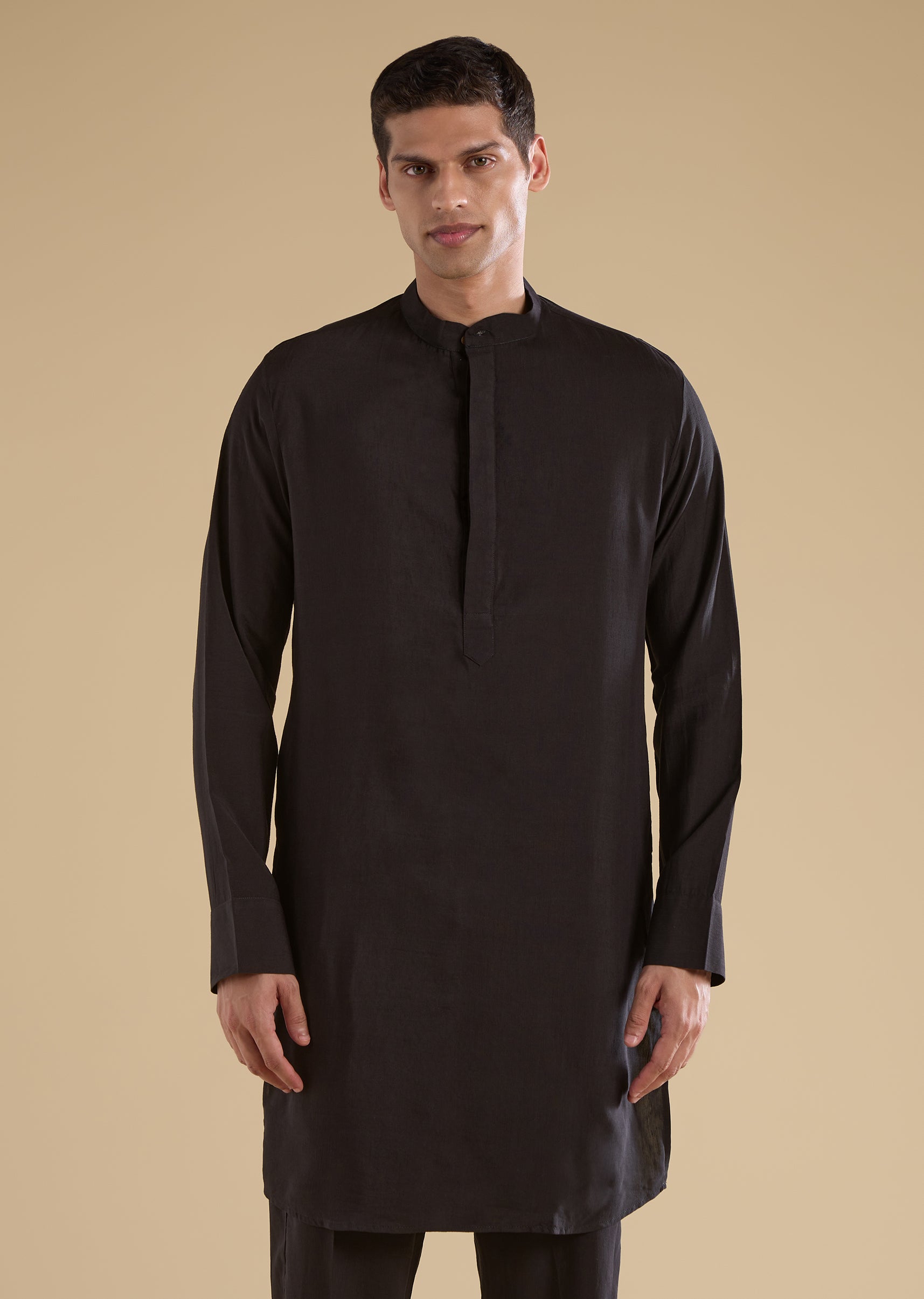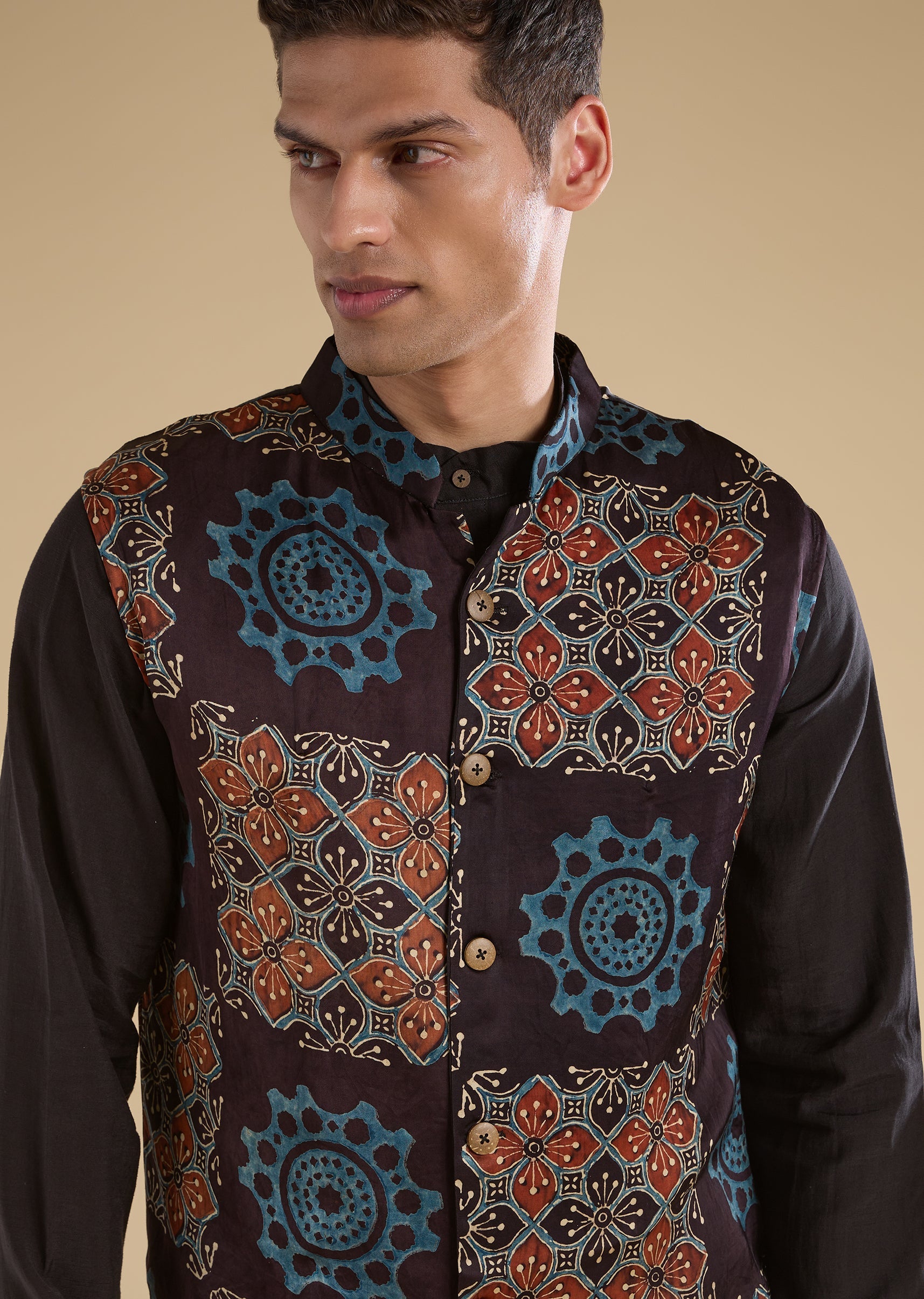 Rooted in tradition with a contemporary sensibility, this black kurta jacket set features a pure handblock Ajrakh bandi paired with a linen-blend kurta for breathable comfort. Designed with a mandarin collar, full sleeves, and side slits, the ensemble balances artisanal detail with modern styling. Finished with straight-fit trousers and a partially elasticated waist, this set is ideal for festive occasions and cultural celebrations. Awarded as the Most Trusted Brand, we're delivering styles you love, just as promised.