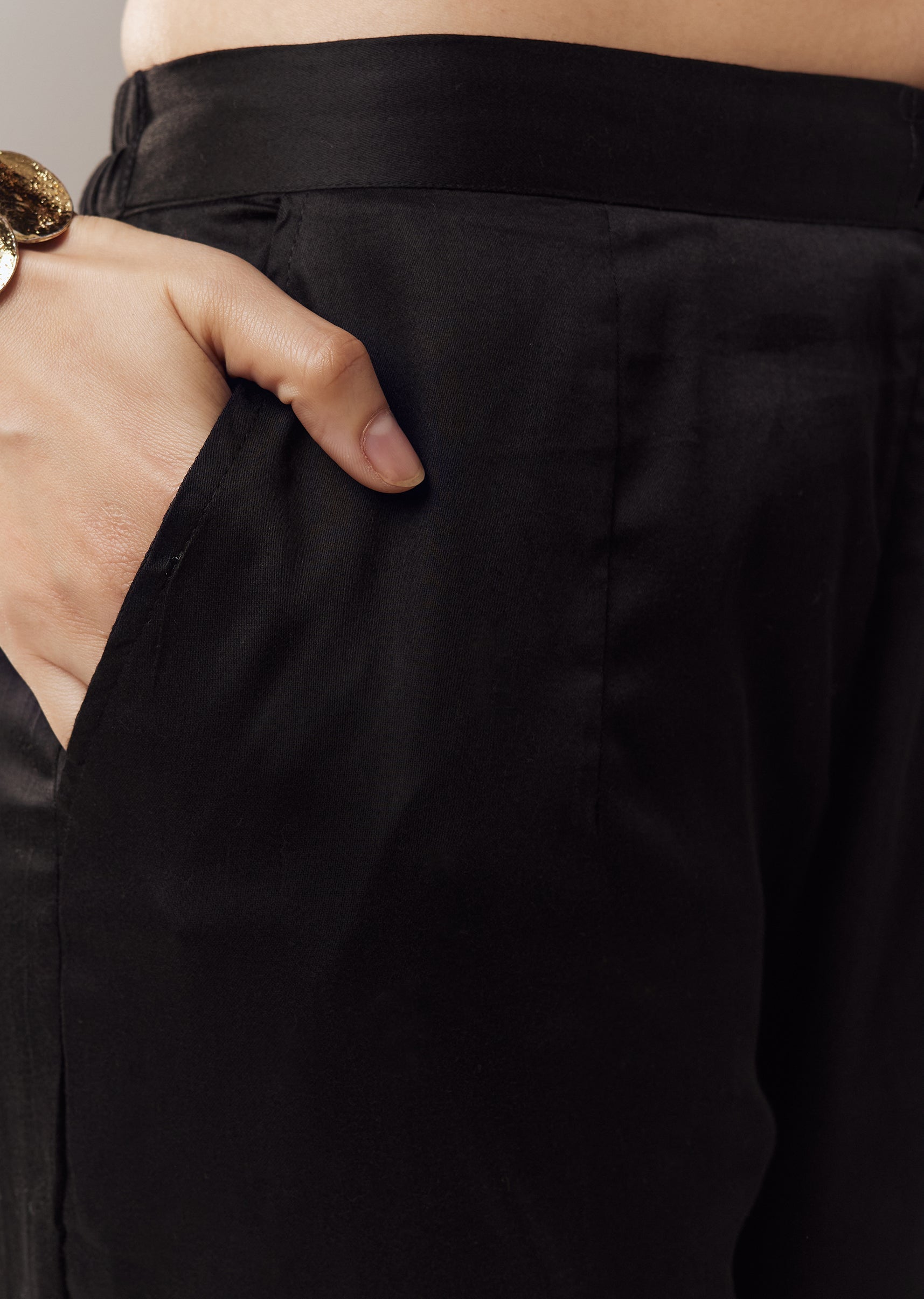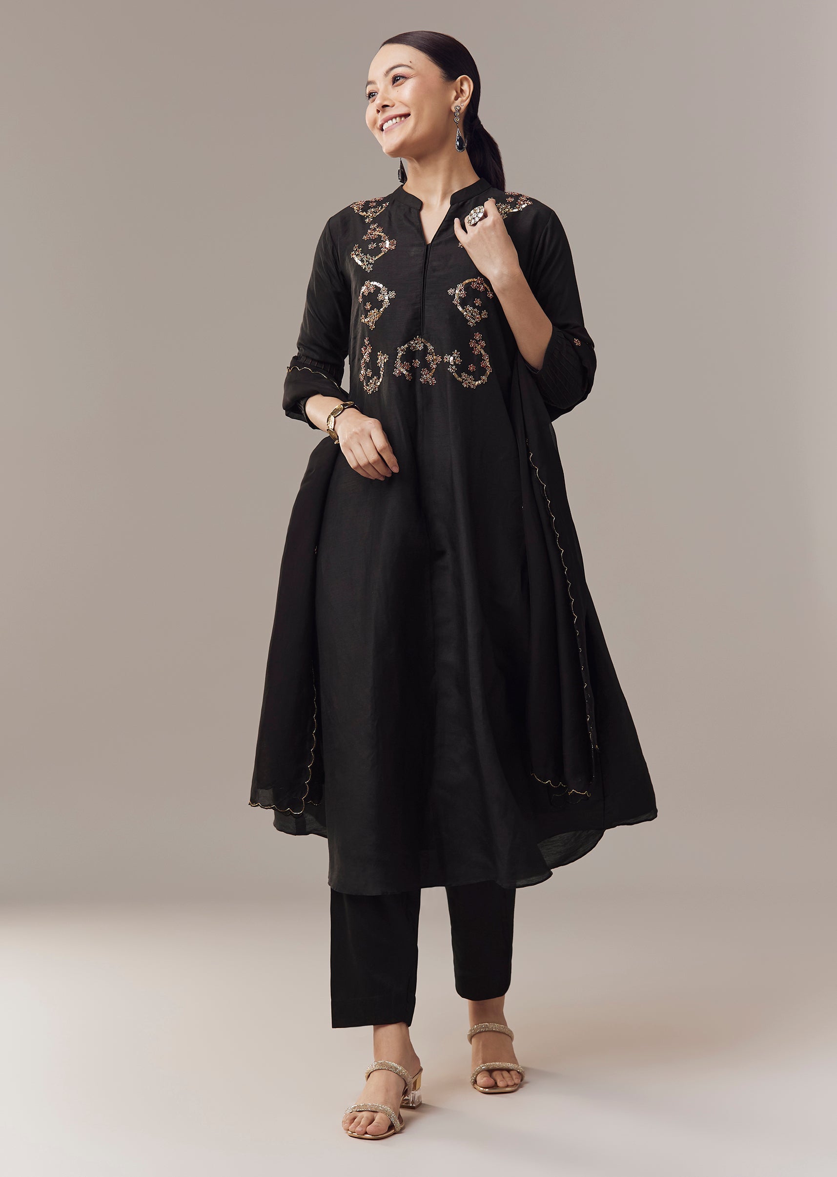 Elegant and striking, this black anarkali suit is crafted in luxurious silk fabric for a graceful and festive feel. The anarkali is adorned with intricate French knot and zardosi hand... More Product Details