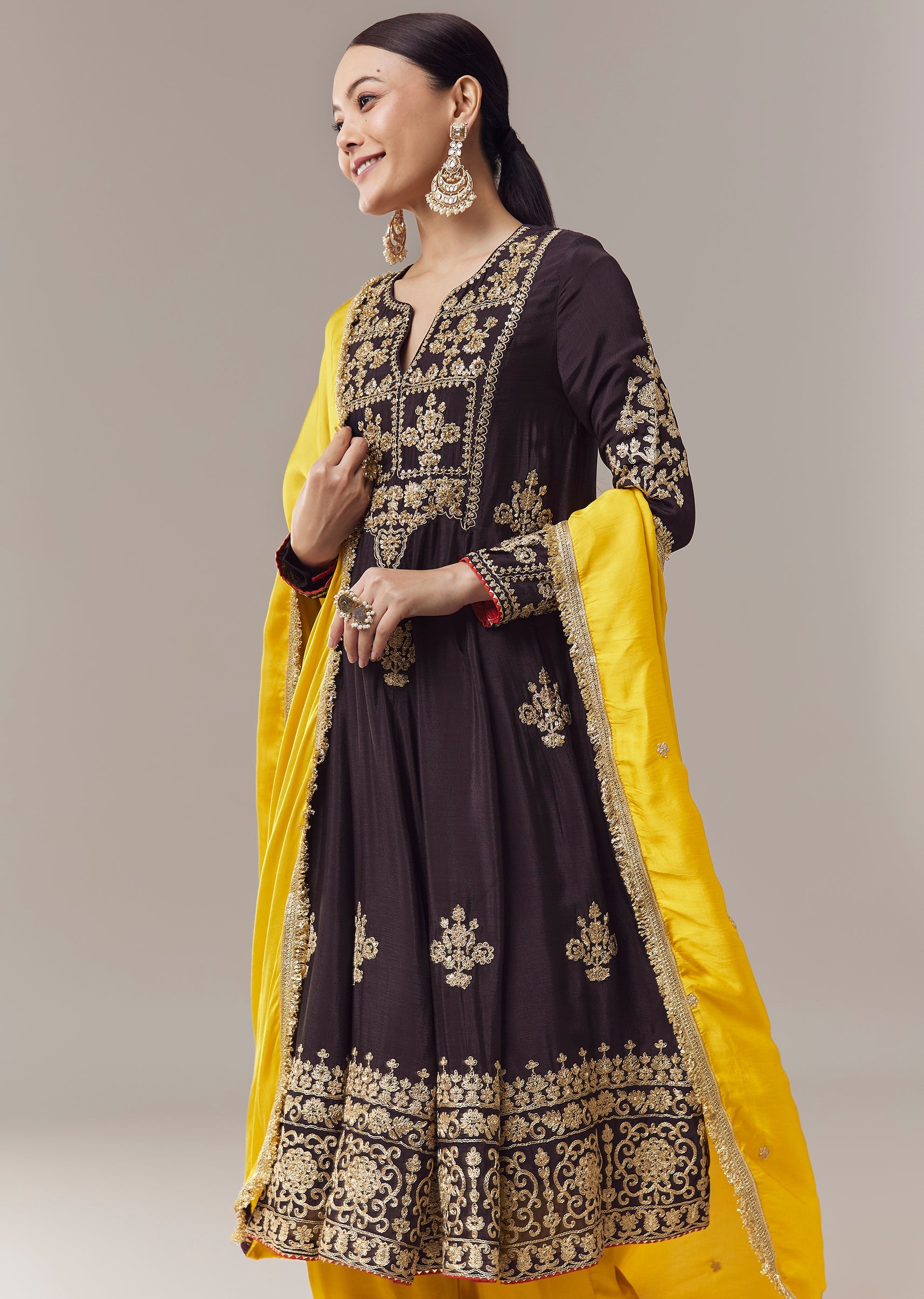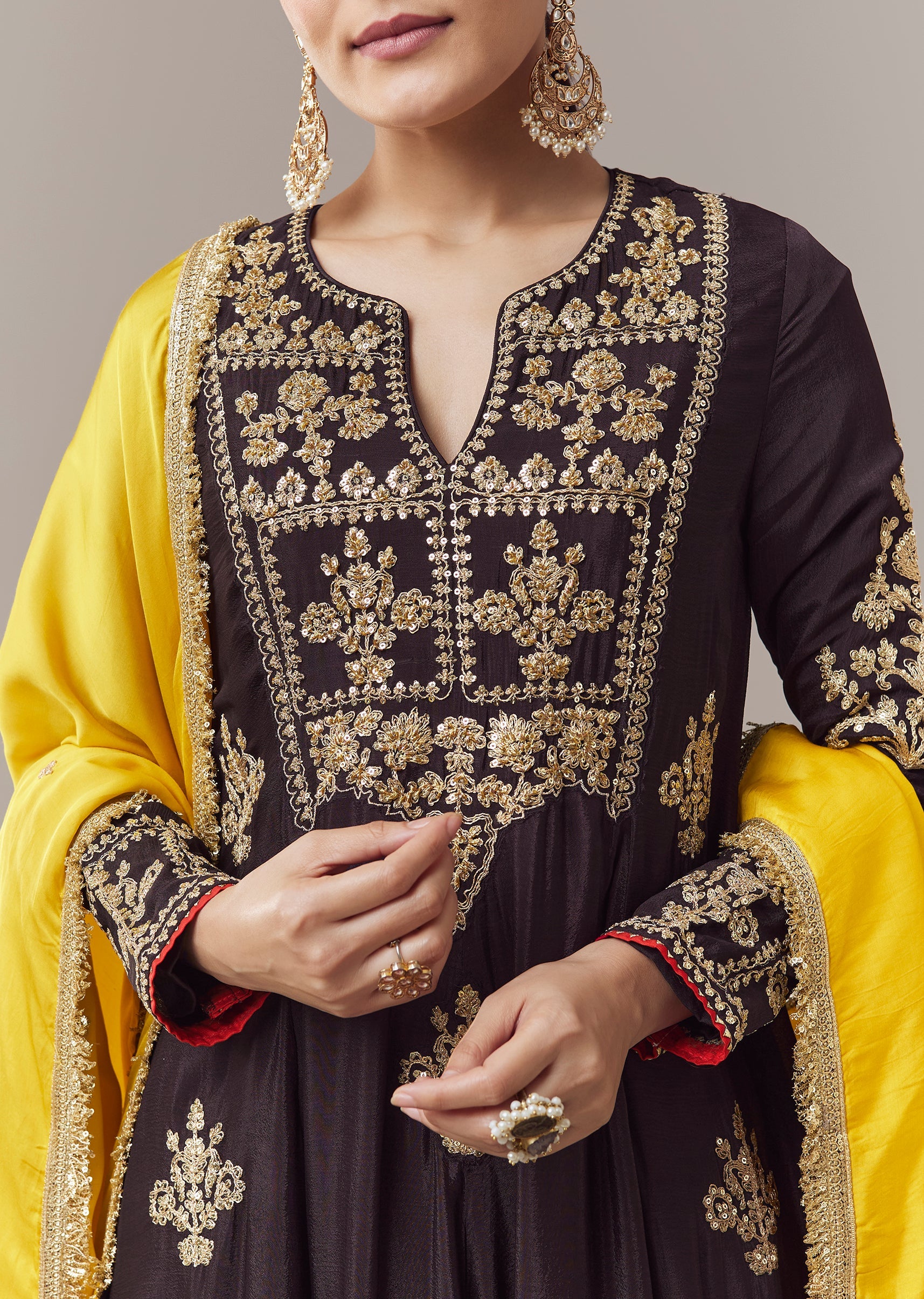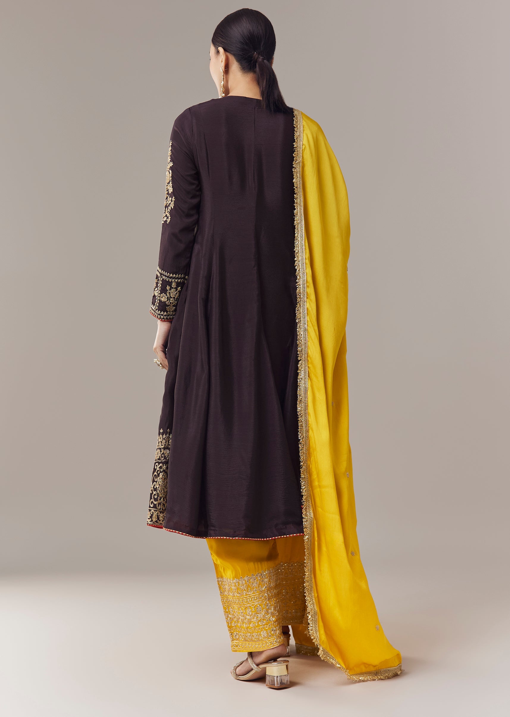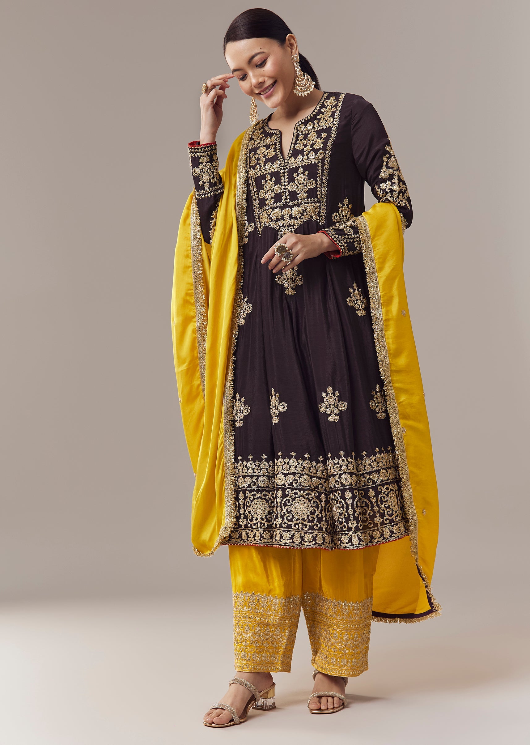 Pair it with metallic juttis and delicate jewellery to highlight the embroidery and maintain a festive look.