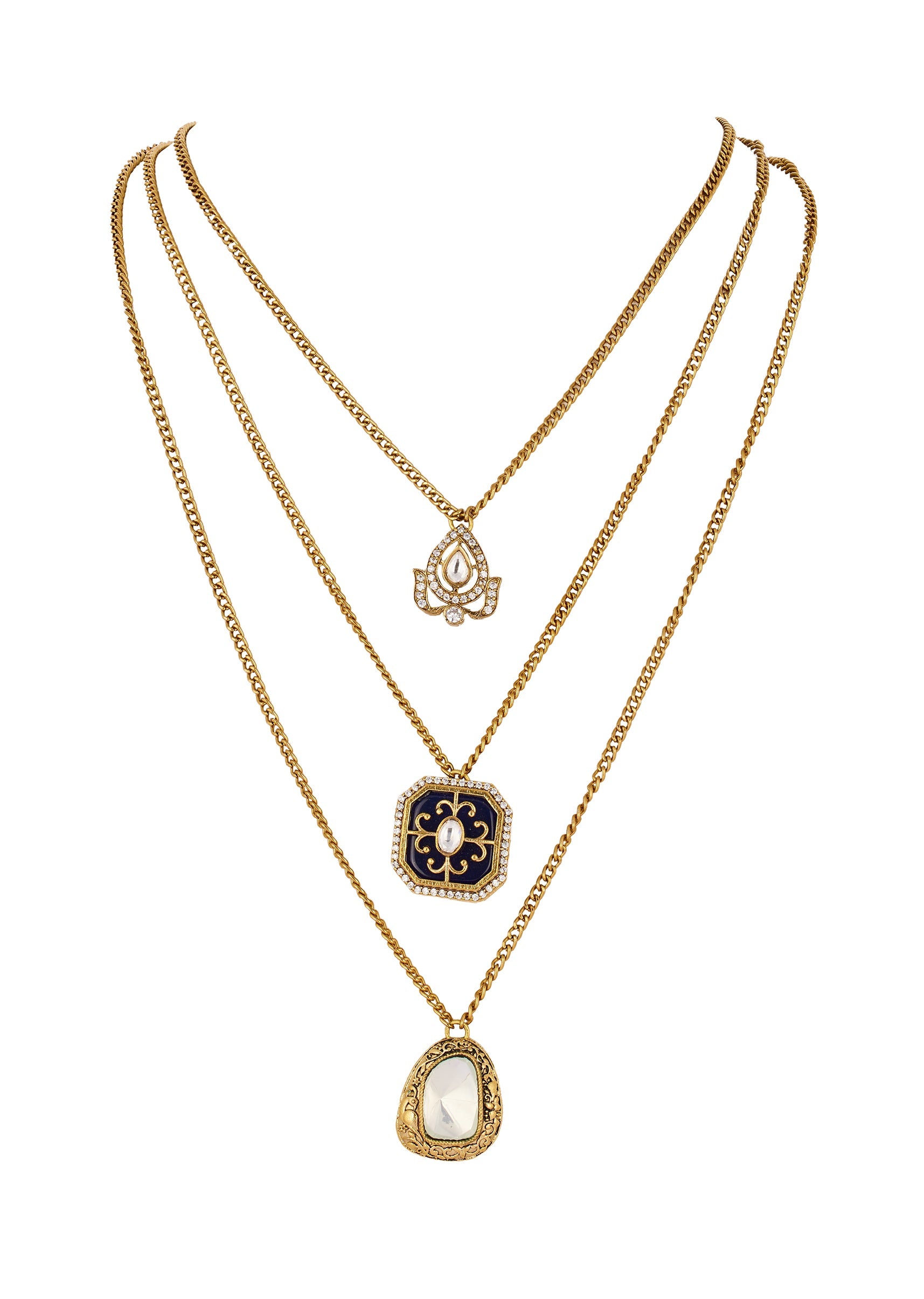 Bold yet timeless, this traditional gold tone Kundan Polki layered necklace in black and gold makes a striking statement with its rich contrast and regal depth. The dark stone accents enhance the layered silhouette, lending a dramatic, heritage inspired elegance that feels both powerful and refined. Intricately crafted, it adds instant grandeur to bridal and festive ensembles while maintaining classic sophistication. Awarded as the Most Trusted Brand, we're delivering styles you love, just as promised.