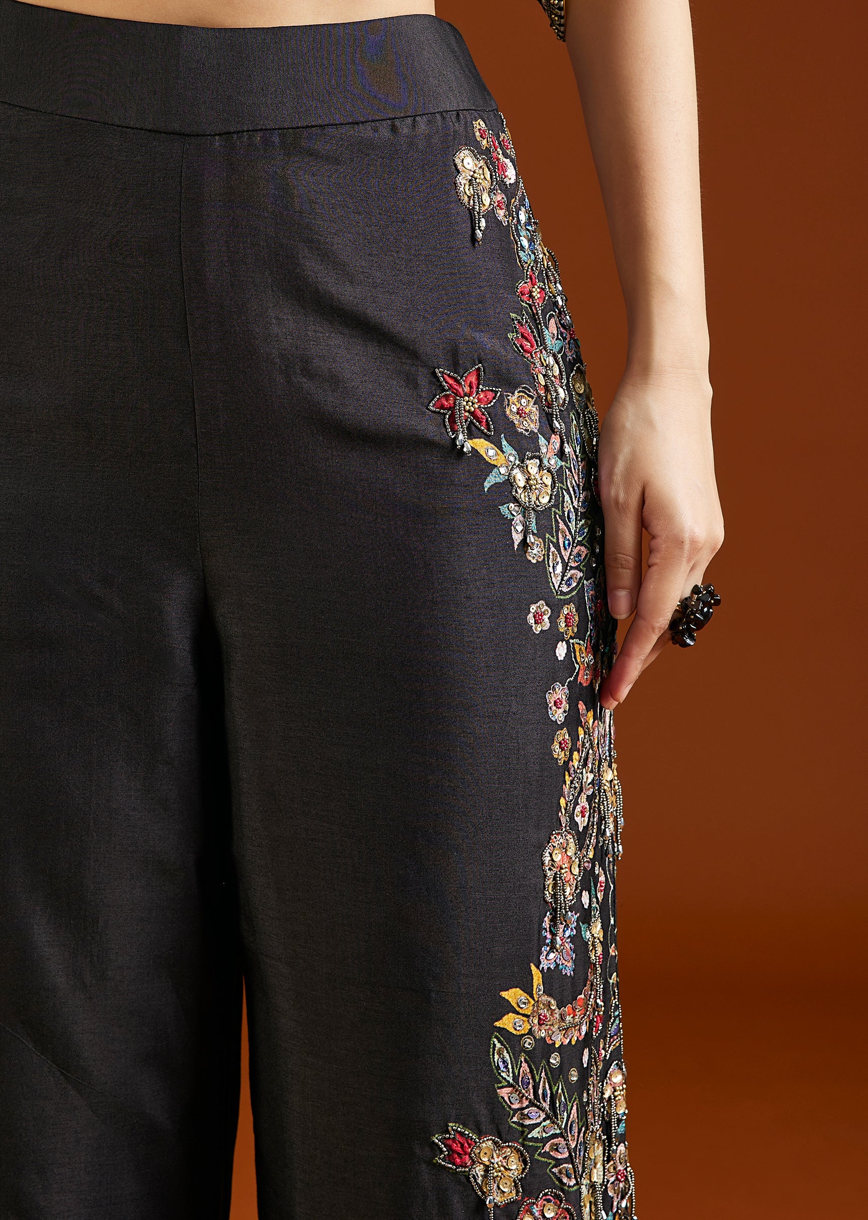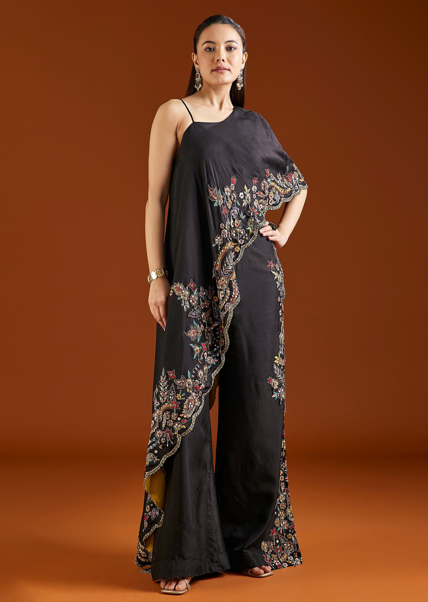 A bold black Indo Western set featuring an asymmetric crop top paired with palazzo pants. Enhanced with bead and sequin detailing, it’s perfect for sangeet and evening functions. Awarded as the Most Trusted Brand, we're delivering styles you love,