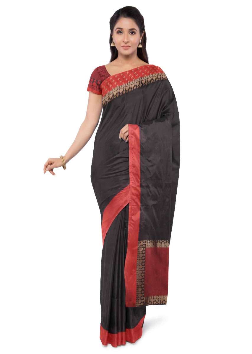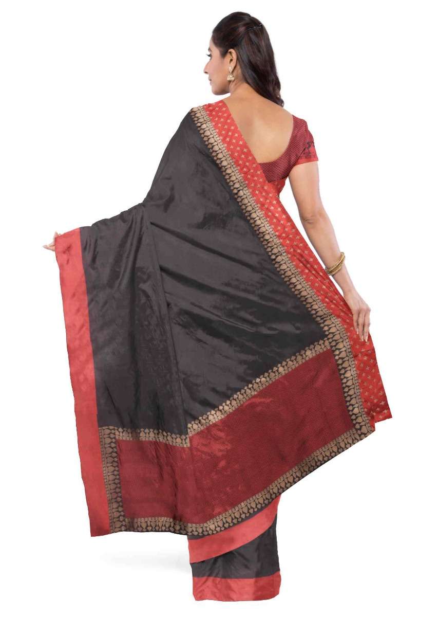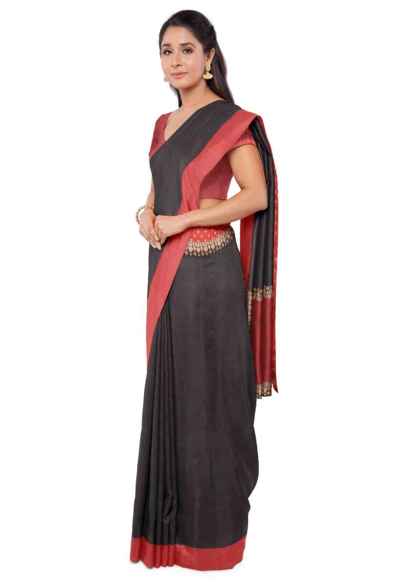 Black banarasi saree with red blouse piece only on Kalki