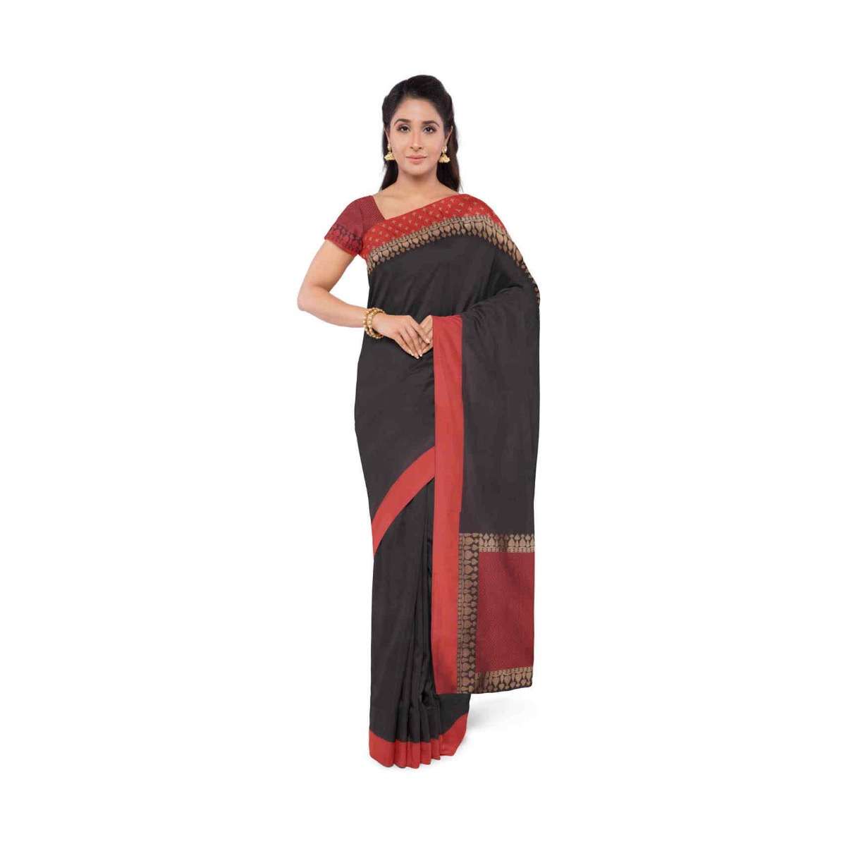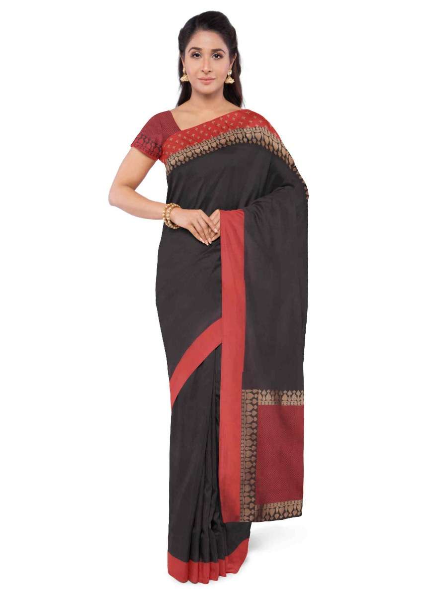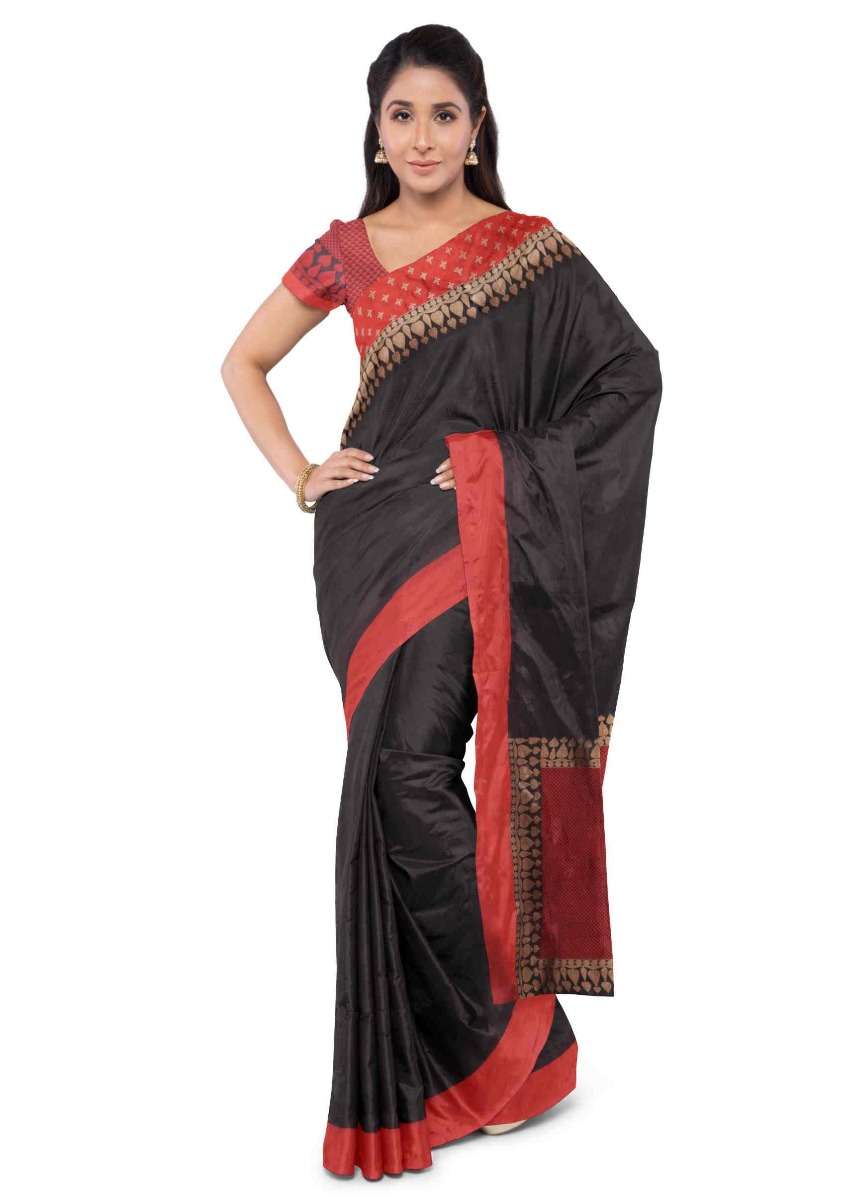 Black banarasi saree with red blouse piece only on Kalki
