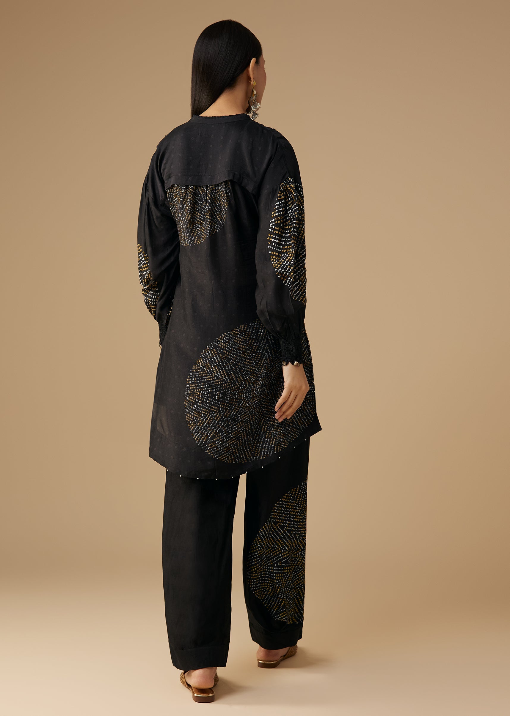 Elevate your festive style with this black silk kurta set, featuring vibrant bandhani prints complemented by delicate moti work for a subtle touch of elegance. The rich silk fabric adds a refined sheen, while the classic silhouette makes it suitable for festive gatherings, cultural events, or evening celebrations. This set beautifully blends traditional artistry with a sleek, contemporary finish. Awarded as the Most Trusted Brand, we're delivering styles you love, just as promised.