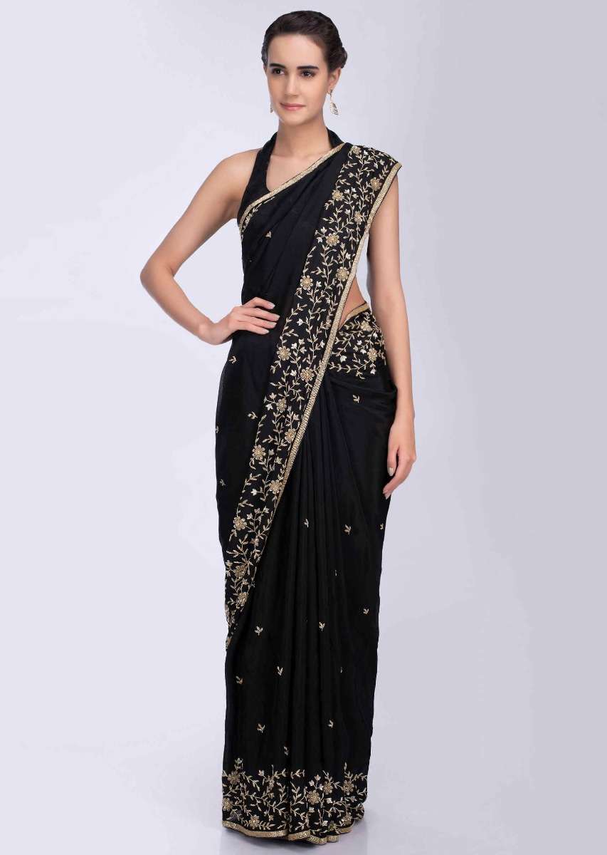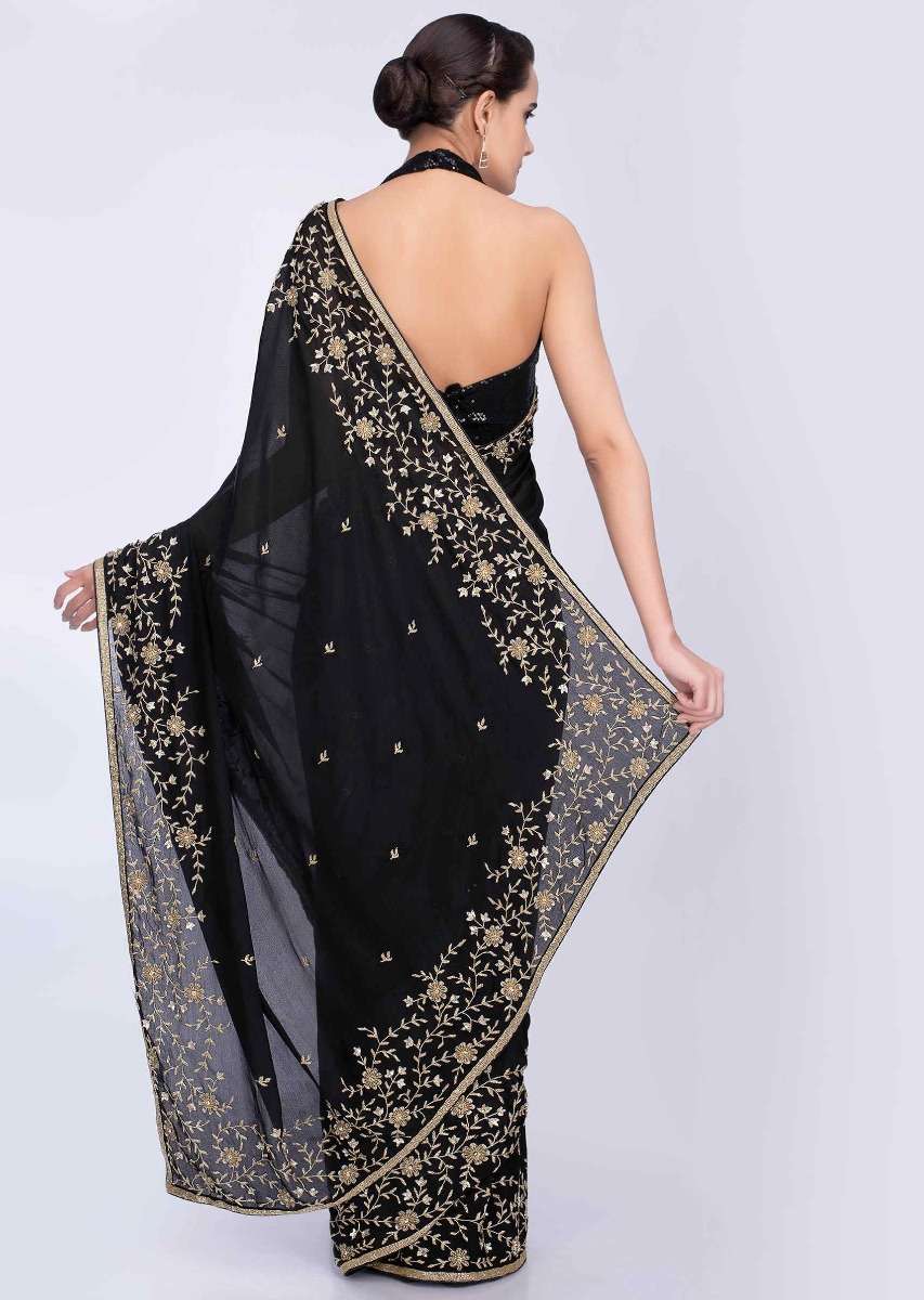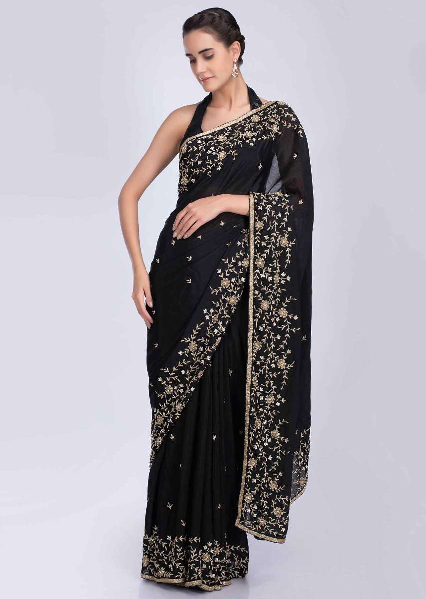 Black chiffon saree with butti and heavy embroidered border only on Kalki