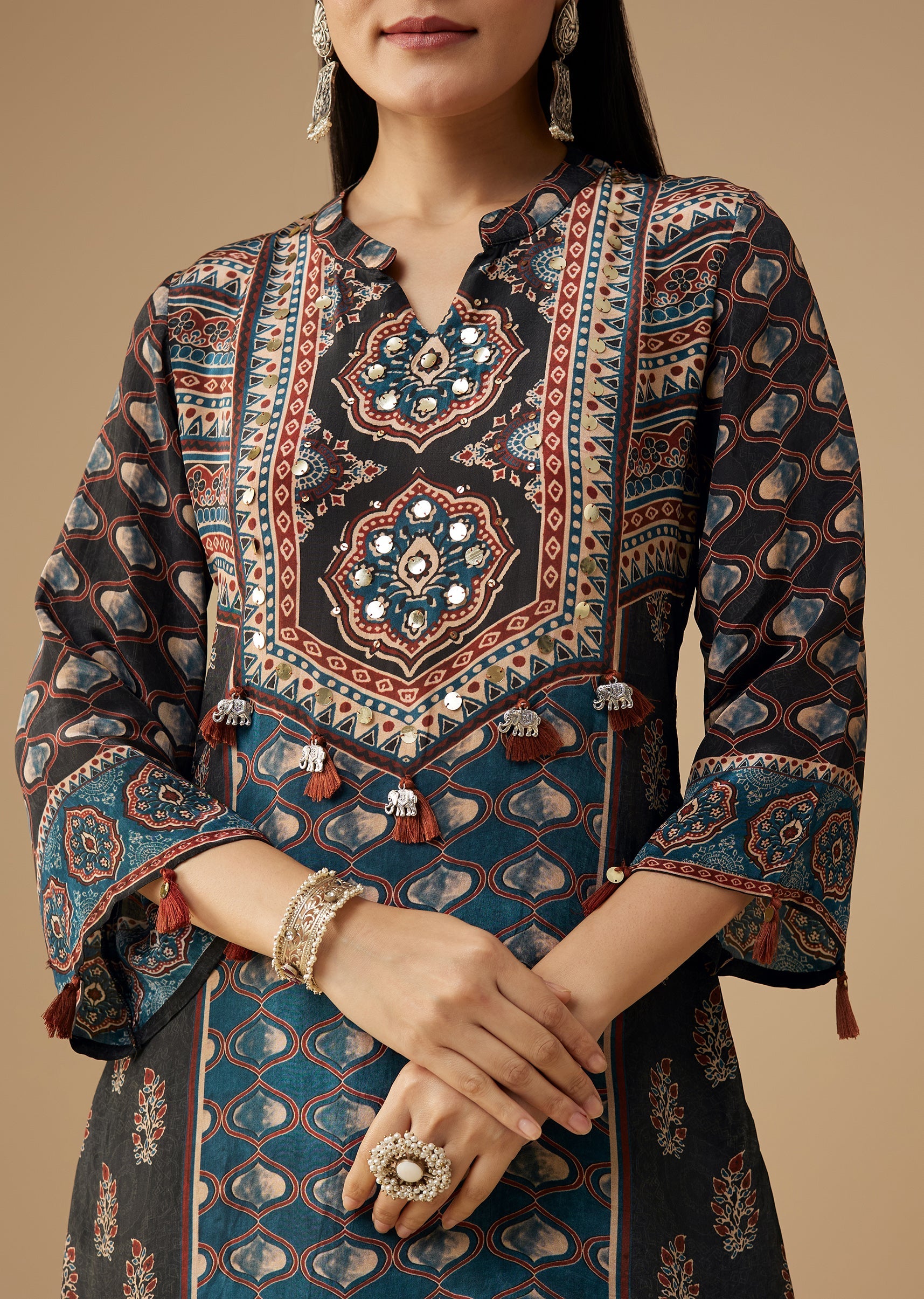 Refresh your ethnic wardrobe with this black crepe kurta set, featuring indie-inspired prints enhanced with delicate sequin detailing for a refined hint of sparkle. The lightweight crepe fabric offers a... More Product Details
