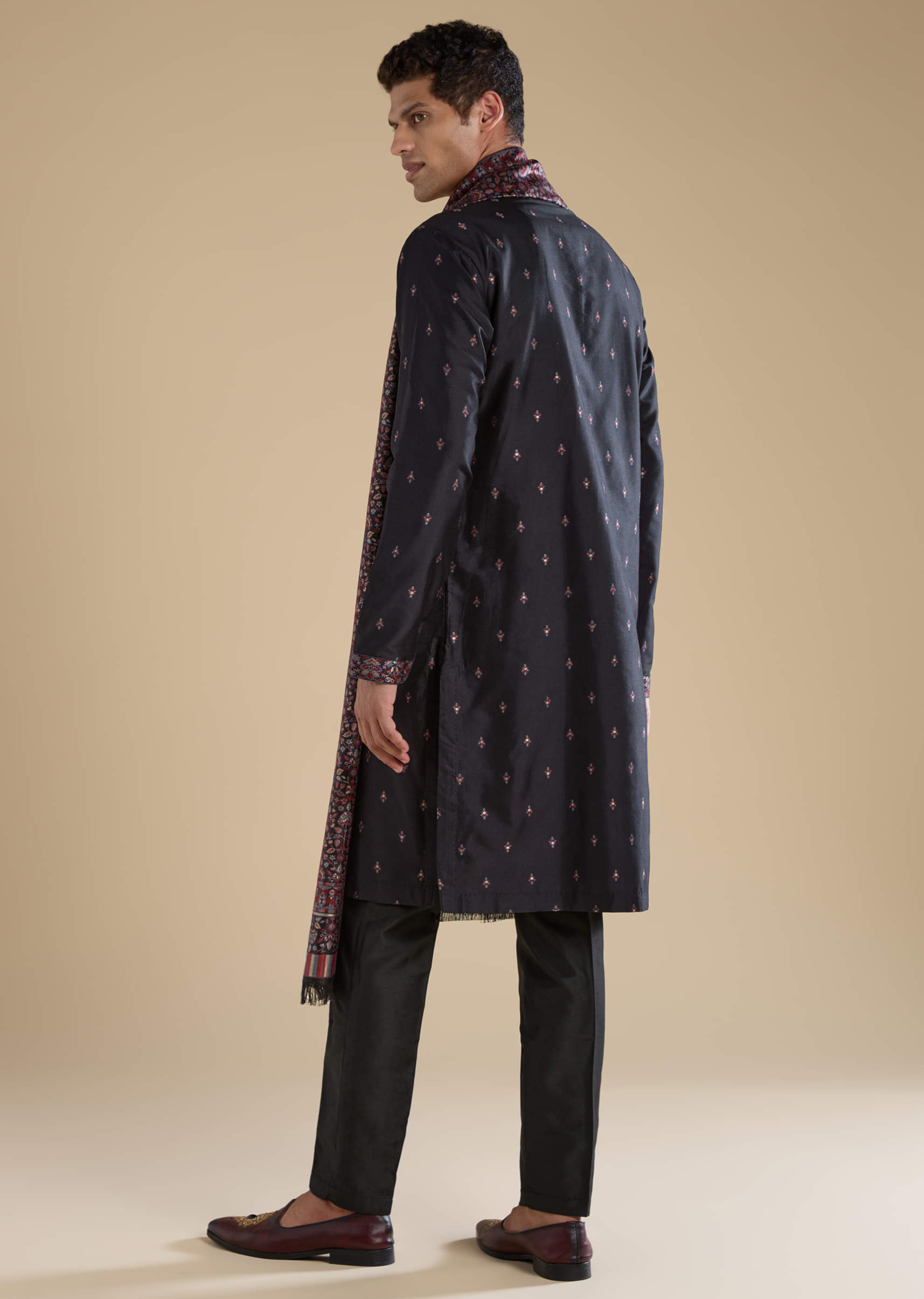 Black Embroidered Mens Kurta Set with Kashmiri Print Dupatta