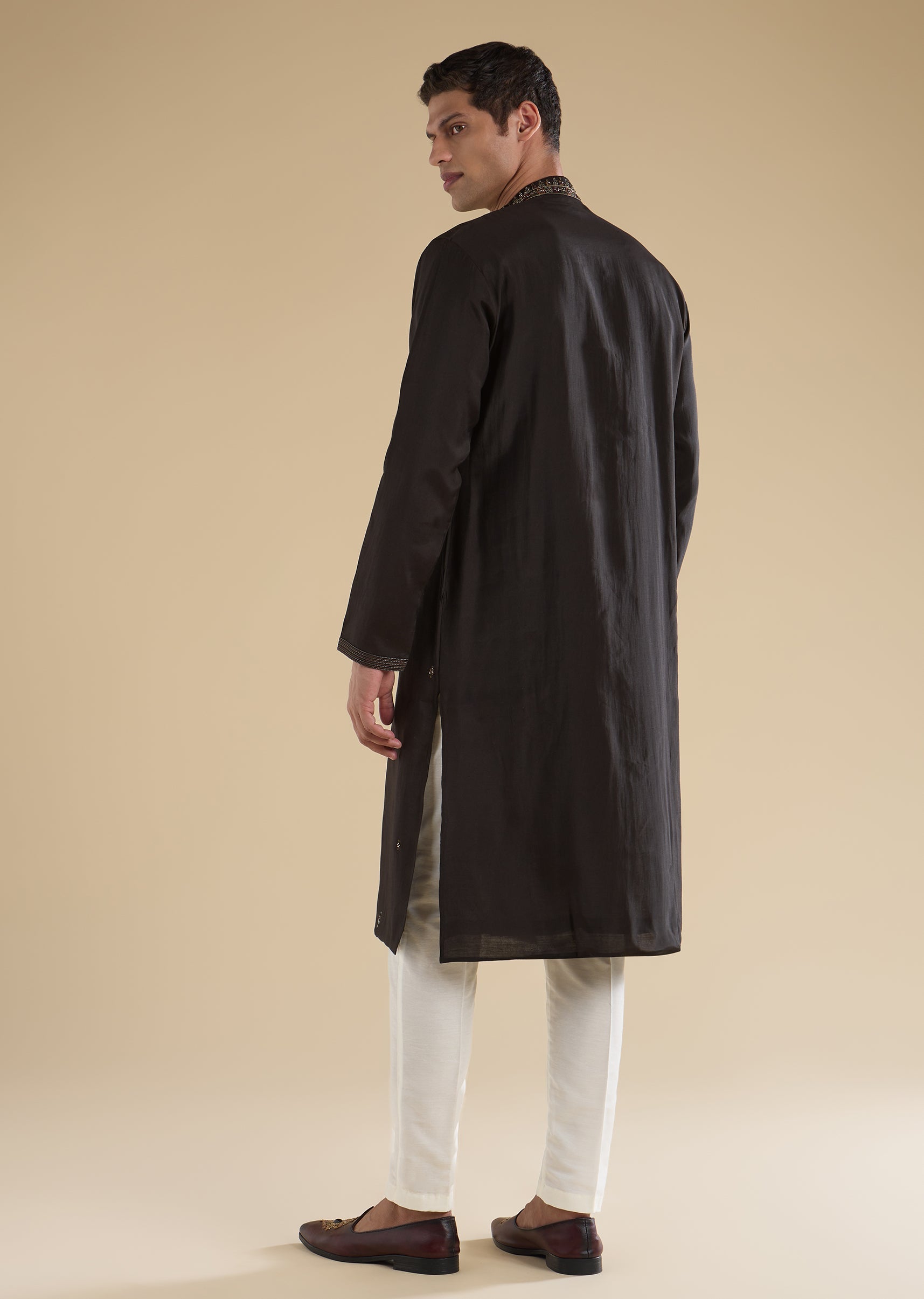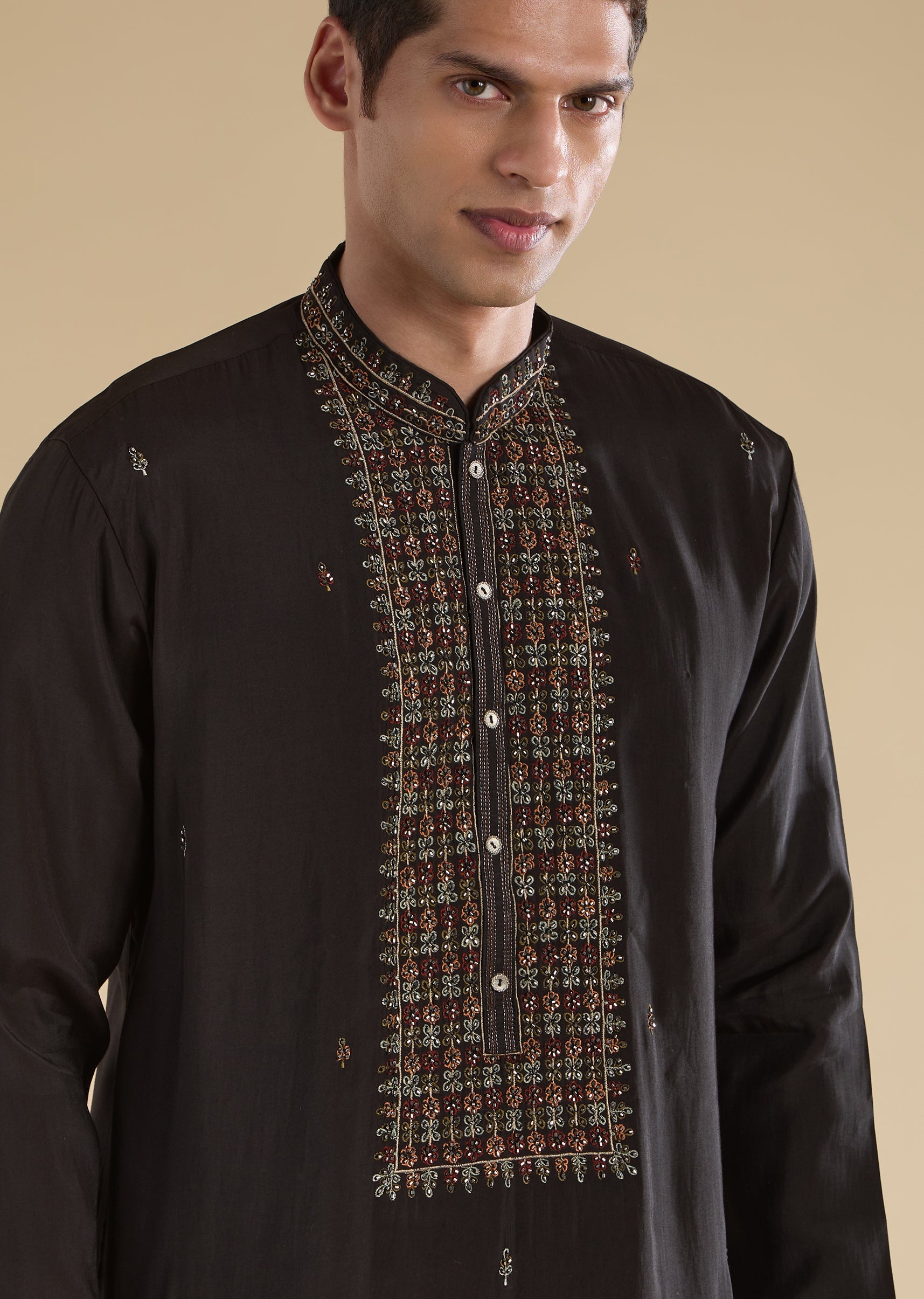 A classic black art-silk kurta set with subtle resham and bead detailing for an elevated minimal look. Finished with mandarin collar, full sleeves, and front hook-eye closure, paired with straight mid-waist pants—ideal for festive evenings.